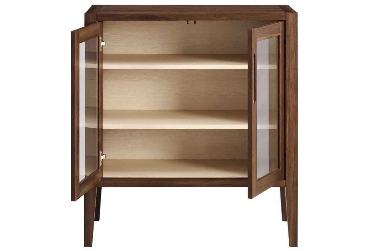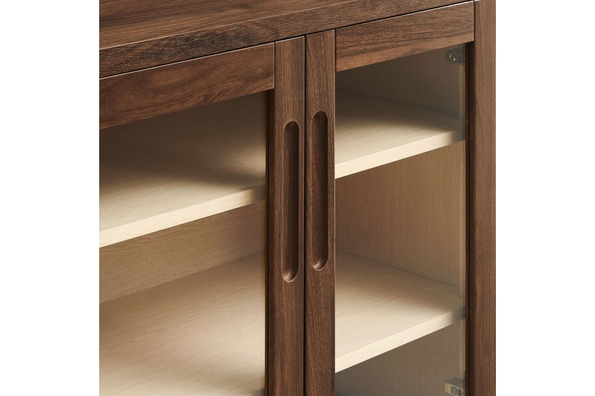 The Nell 35" Accent Cabinet brings a crisp mid-century silhouette and space-saving versatility to your home. This small storage cabinet features two framed tempered glass doors that open effortlessly with minimalist finger pull cutout handles. Behind the glass display cabinet, two shelves offer room to organize serveware, bar essentials, or decorative objects. The compact scale and warm wood-grain finish make it an ideal piece for use as a tea cabinet buffet, small bar cabinet, entryway cabinet or a modern living room accent cabinet. With clean lines and gently tapered legs, it’s a refined option for those who love mid century modern furniture. Weight Capacity: 201 lbs.