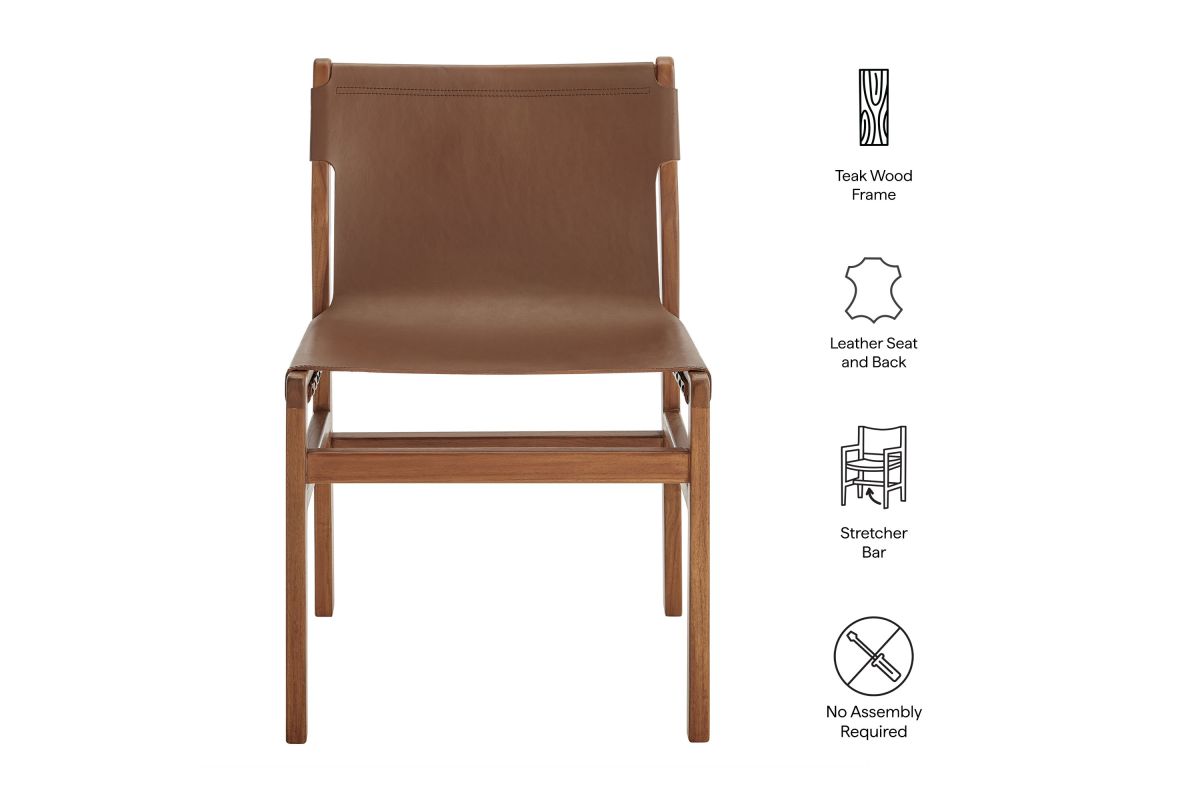 Bring timeless ease to your interior with the Sonora Teak Wood Leather Dining Side Chair. Designed with a refined silhouette and armless profile, this leather side chair features a solid teak frame that highlights the wood�s natural grain while offering long-lasting support. The smooth leather seat and backrest provide structured comfort, making it a smart choice for meals, meetings, or casual seating throughout the home. Whether placed in a dining space, study, or hallway, this modern leather chair delivers a sculptural presence with warm materials and clean lines. Arrives Fully Assembled.