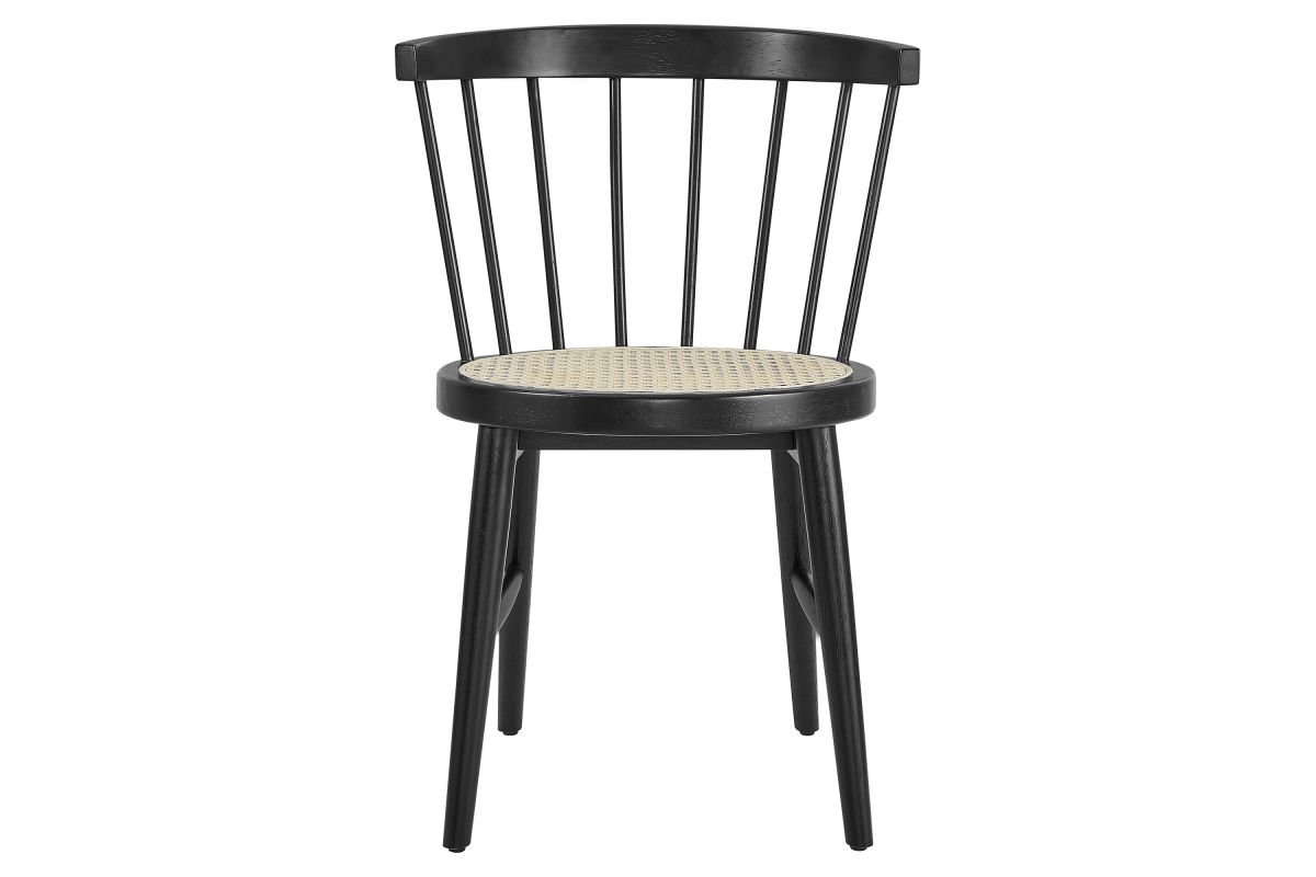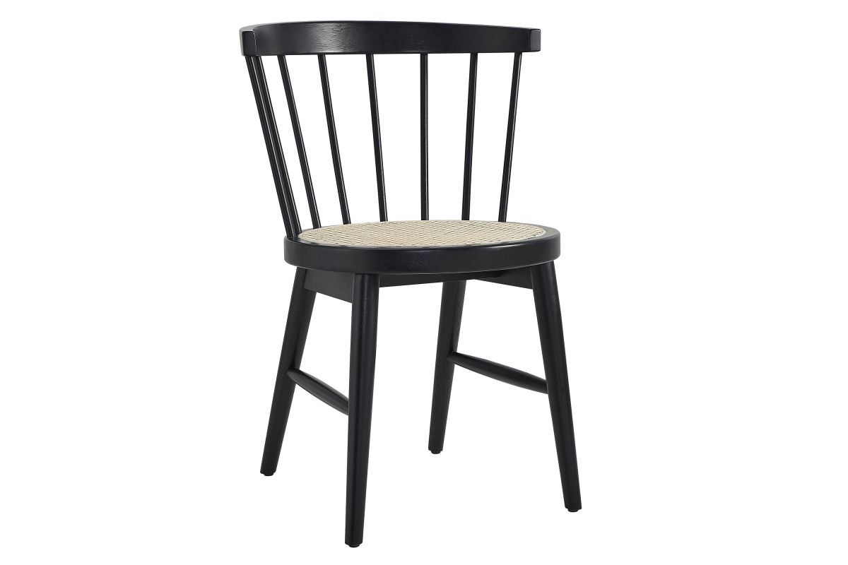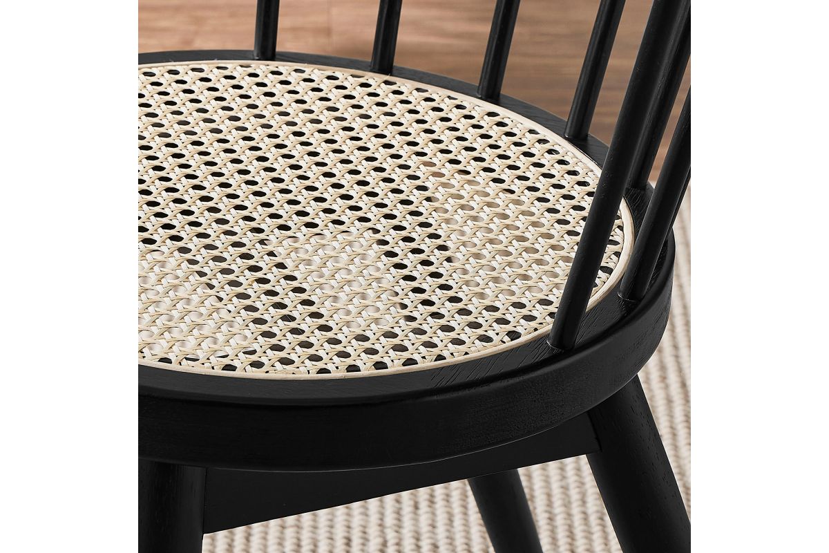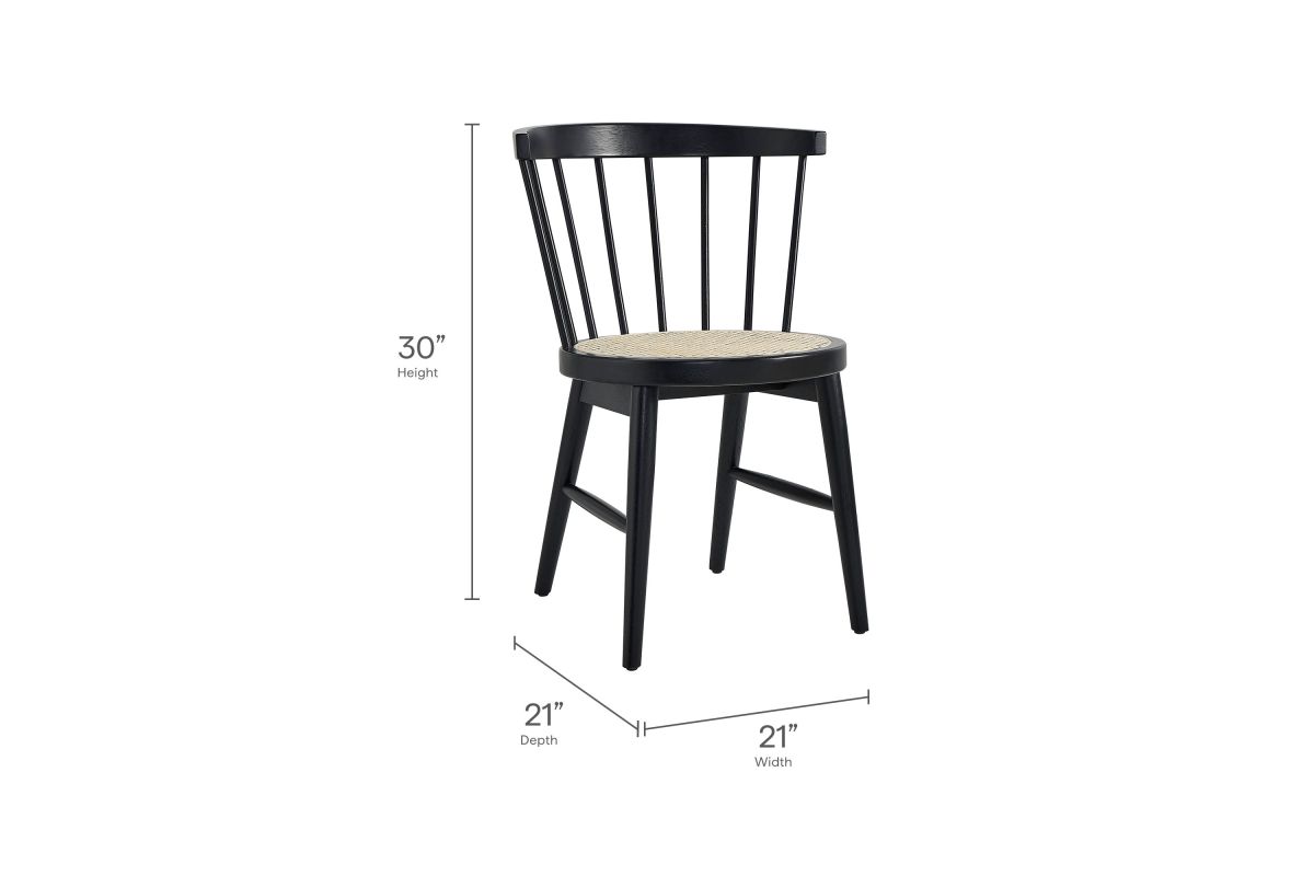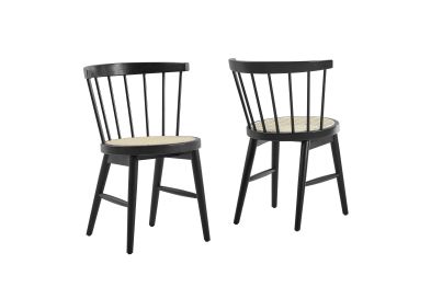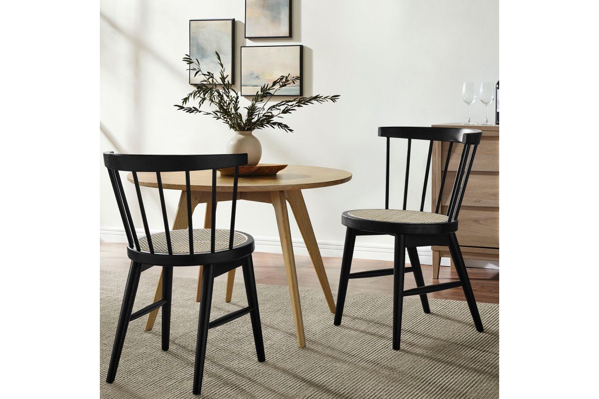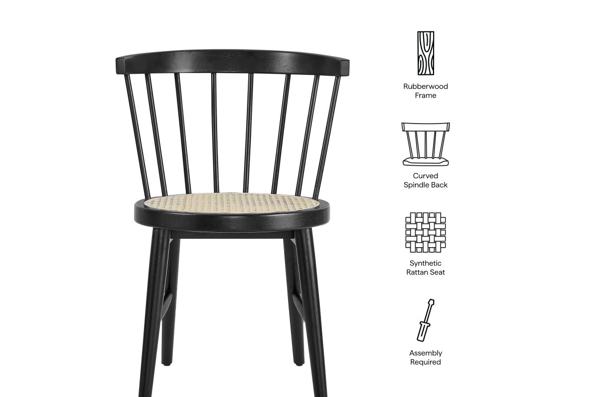 A refined take on the classic Windsor chair silhouette, the Lykke Dining Chairs bring timeless charm and updated materials to modern dining spaces. Crafted with a rubberwood frame, this dining chair set of 2 features gently curved backrests, slender spindle supports, and subtly tapered legs for a balanced, mid-century-meets-farmhouse aesthetic. The round seat is topped with a woven synthetic rattan cane inset, offering a light, breathable surface with natural texture and visual warmth. Whether styled as a pair around a breakfast table or mixed into a more eclectic dining setup, the Lykke Dining Chairs make a comfortable, design-forward addition to kitchens, dining rooms, or breakfast nooks. Weight Capacity: 400 lbs.