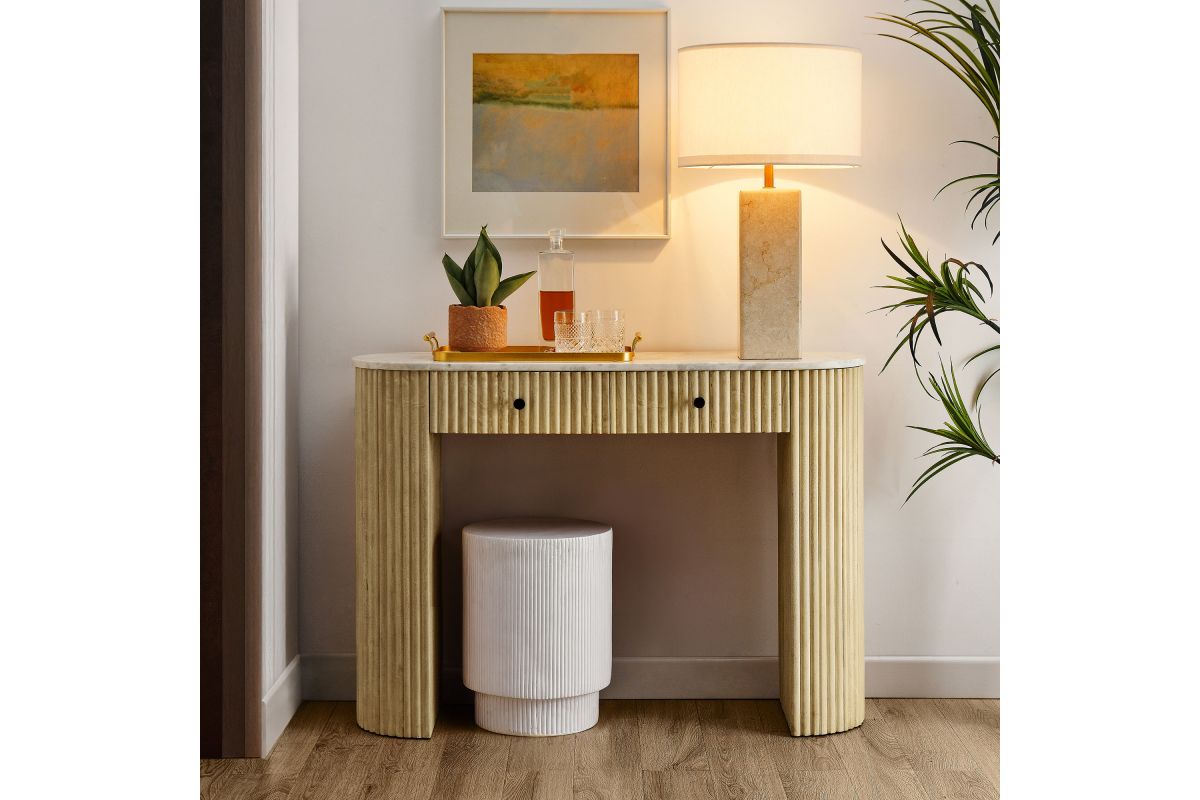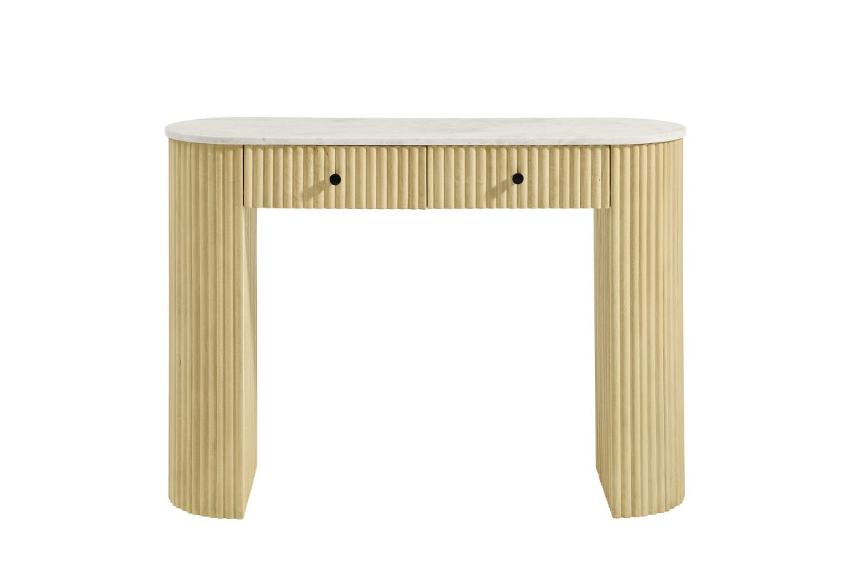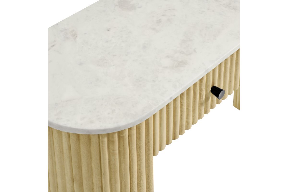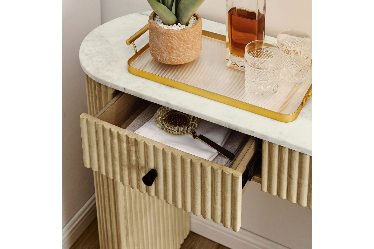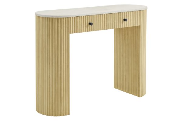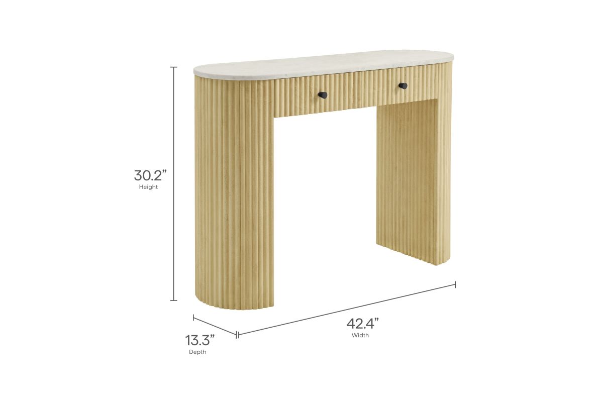 Bring sculptural elegance to your space with the Caldera Curved Console Table, a modern fusion of refined materials and organic form. Featuring a smooth, oval-shaped marble top and a base crafted from solid mango wood, this narrow console table adds a bold statement to entryways, hallways, and living rooms alike. The fluted detailing on the wood legs and drawer front adds texture and a touch of mid-century sophistication, while the curved legs form a graceful and grounded silhouette. Two full-extension glide drawers with minimalist black knobs offer discreet storage for small essentials, and non-marking adjustable levelers ensure floor protection and a steady foundation. Whether placed behind a sofa, in a foyer, or as a statement hallway table, Caldera blends timeless beauty with everyday function and arrives fully assembled. Weight Capacity: 132 lbs.