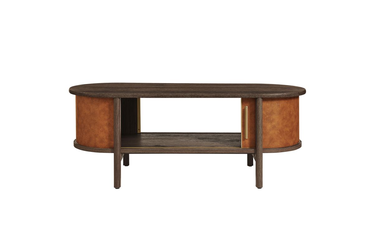 Bring vintage character and thoughtful design into your space with the Coralie Curved Coffee Table. Wrapped in vegan leather with wood grain laminate, this 45" modern center table has a warm, lived-in look that adds depth to any room. The curved profile softens its edges, while the oval shape feels both classic and fresh. On either side, two sliding doors—each accented with a gold-tone handle—opening fully from one end to the other on each side to reveal generous storage space for books, blankets, or anything that should stay close at hand but tucked away. Designed to anchor the room, the Coralie Unique Coffee Table offers a mix of storage, surface space, and vintage charm all in one. Equipped with adjustable non-marking foot glides. Weight Capacity: 165 lbs.