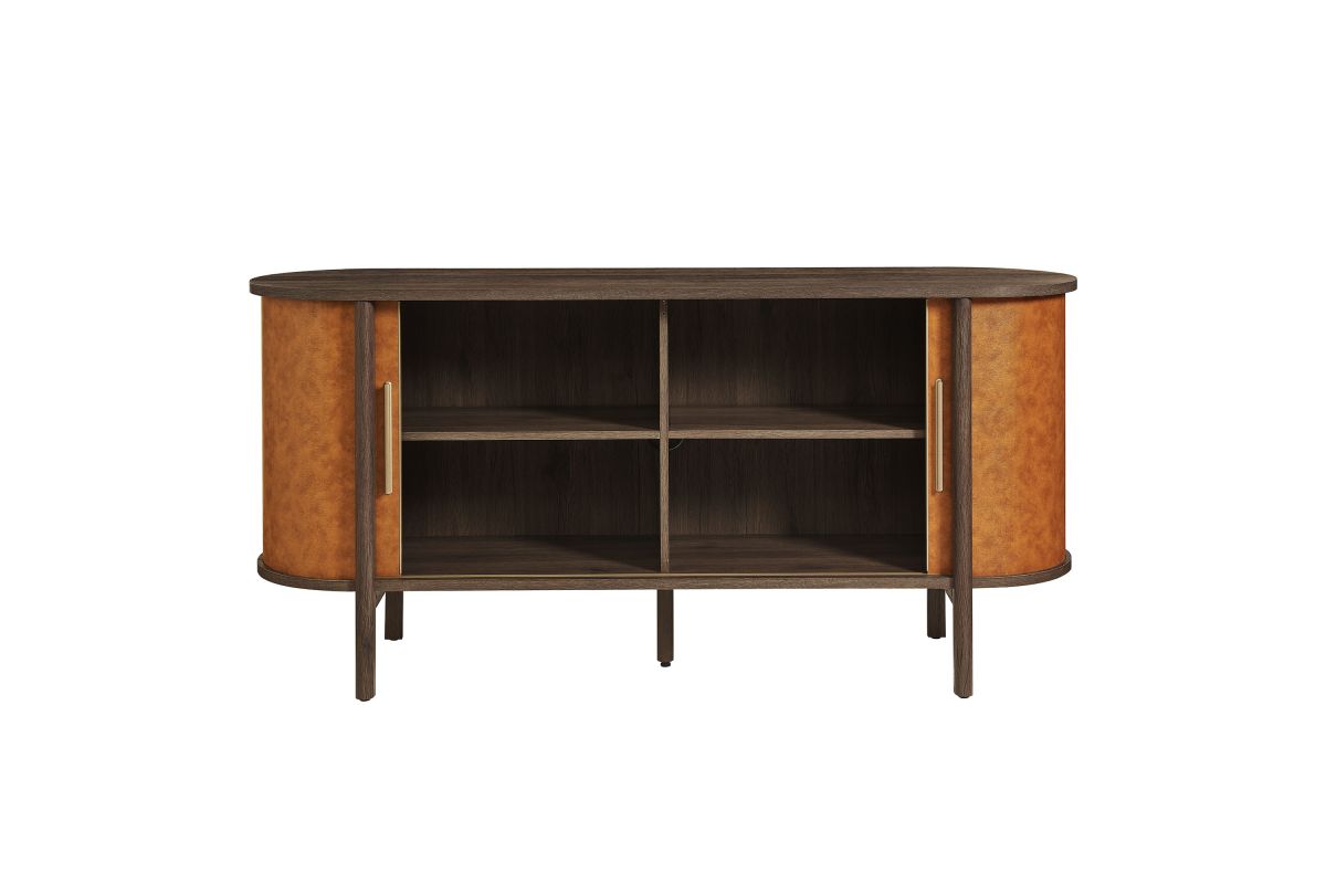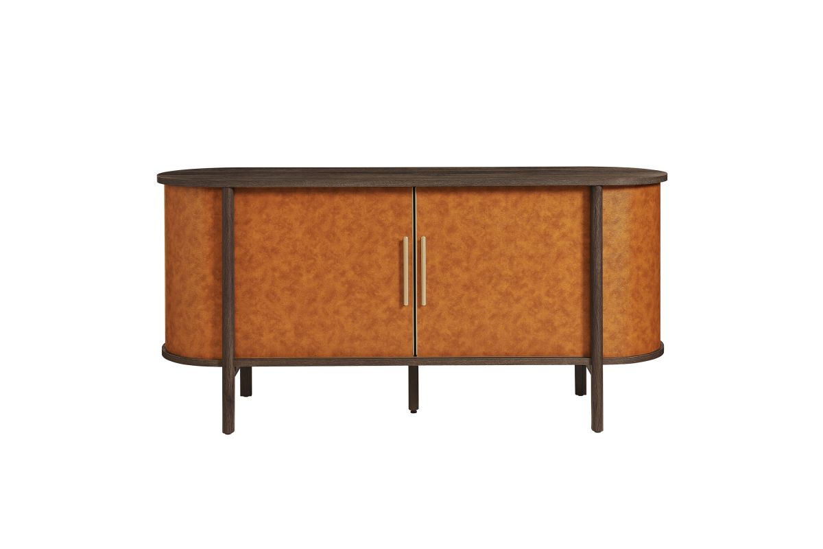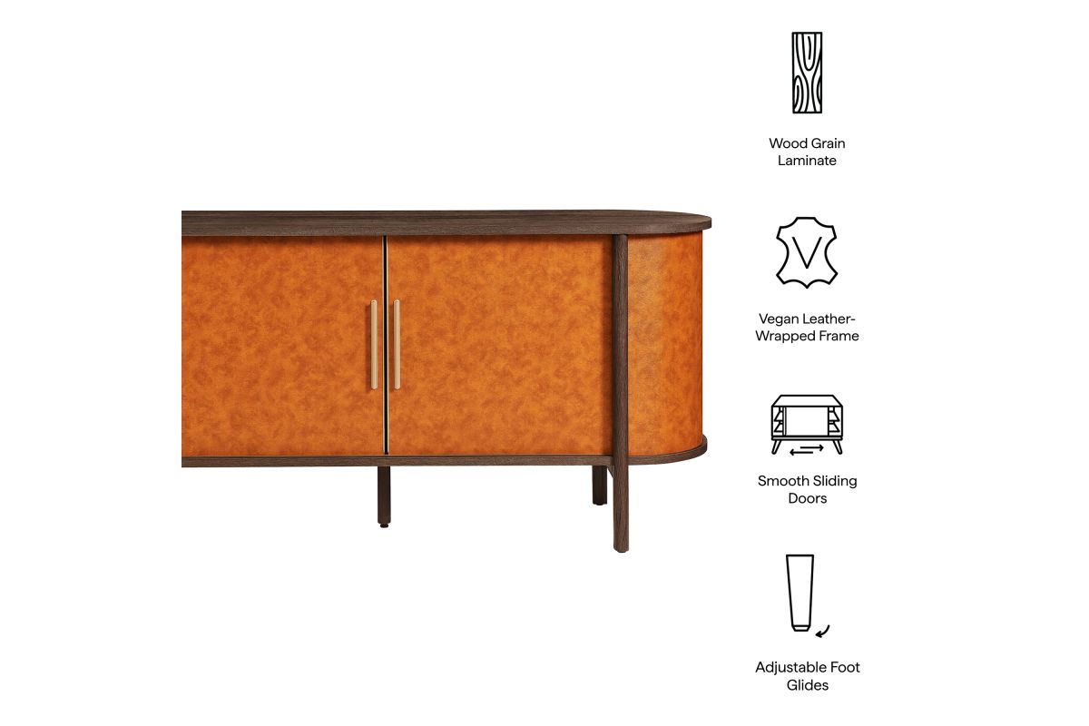 Bring vintage character and thoughtful design into your space with the Coralie Curved Sideboard. Wrapped in vegan leather with wood grain laminate, this modern storage cabinet has a warm, lived-in look that adds depth to any room. The curved profile softens its edges, while the elongated oval shape feels both classic and fresh. At the center, two tambour-style sliding doors—each accented with a gold-tone handle—glide smoothly apart to reveal four interior compartments, perfect for organizing dishes, linens, or anything that should stay close at hand but tucked away. Whether styled as a dining room buffet, an office credenza, a hallway cabinet, or even a TV stand for wall-mounted setups, Coralie offers a mix of storage, surface space, and vintage charm in one thoughtful design. Equipped with adjustable non-marking foot glides to help keep it level while protecting your floors. Weight Capacity: 220 lbs.