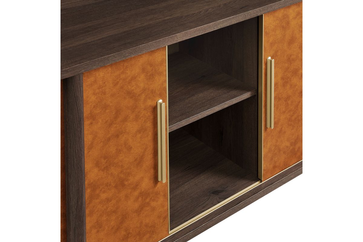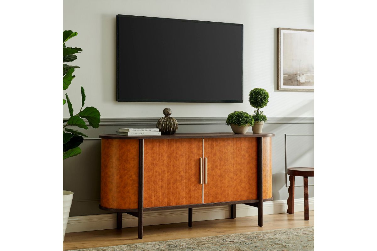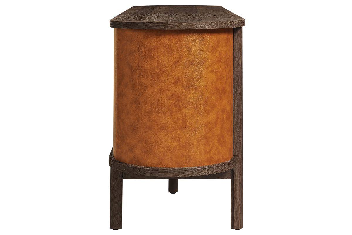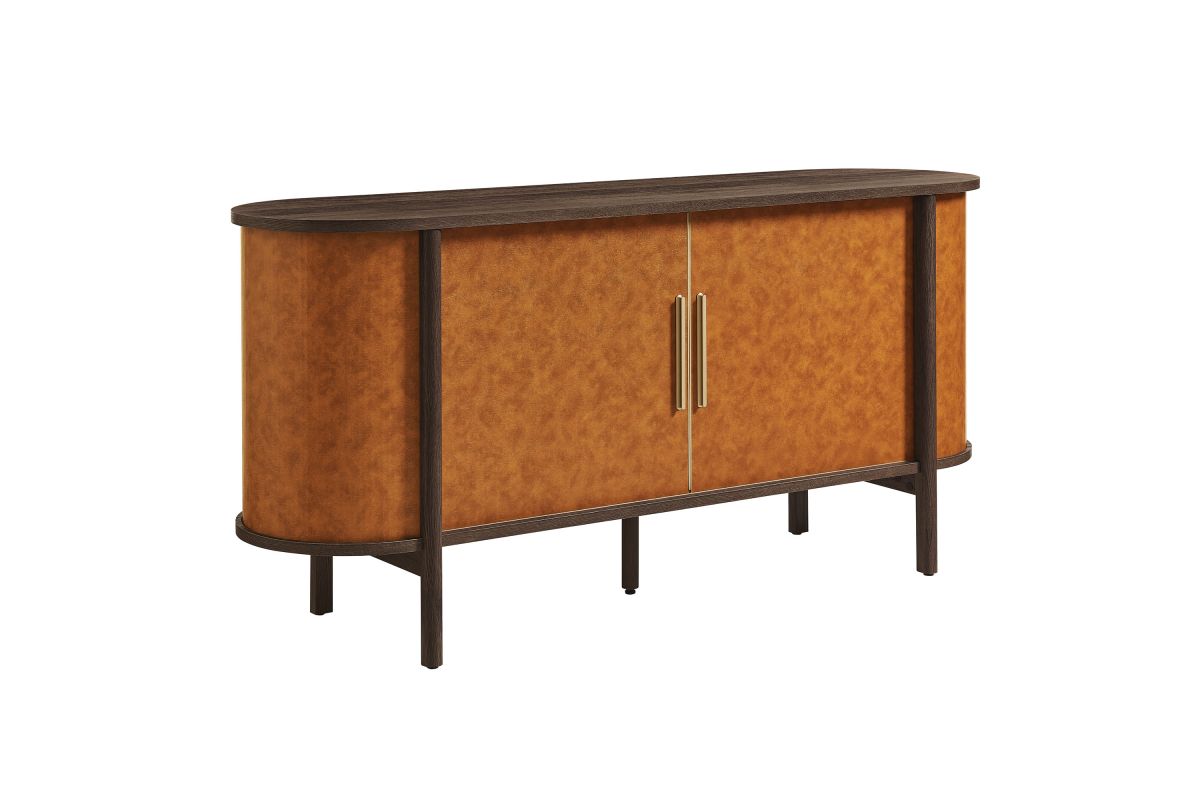 Bring vintage character and thoughtful design into your space with the Coralie Curved Sideboard. Wrapped in vegan leather with wood grain laminate, this modern storage cabinet has a warm, lived-in look that adds depth to any room. The curved profile softens its edges, while the elongated oval shape feels both classic and fresh. At the center, two tambour-style sliding doors—each accented with a gold-tone handle—glide smoothly apart to reveal four interior compartments, perfect for organizing dishes, linens, or anything that should stay close at hand but tucked away. Whether styled as a dining room buffet, an office credenza, a hallway cabinet, or even a TV stand for wall-mounted setups, Coralie offers a mix of storage, surface space, and vintage charm in one thoughtful design. Equipped with adjustable non-marking foot glides to help keep it level while protecting your floors. Weight Capacity: 220 lbs.
