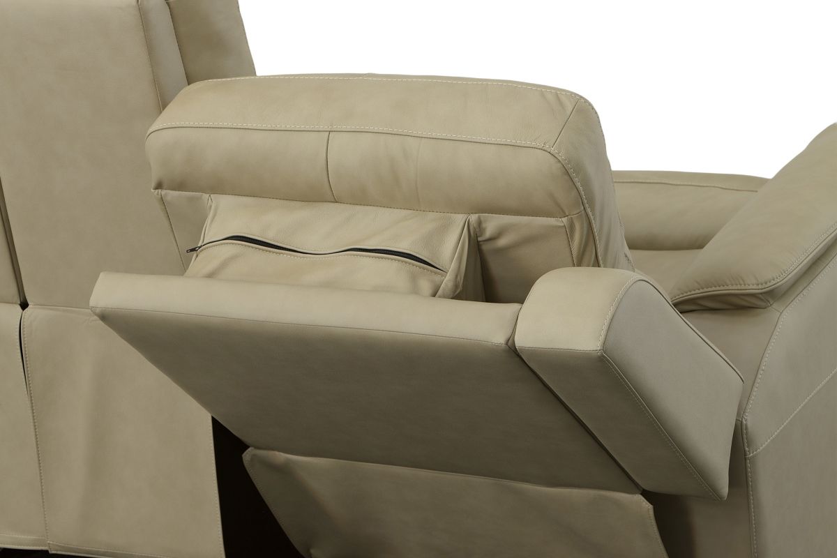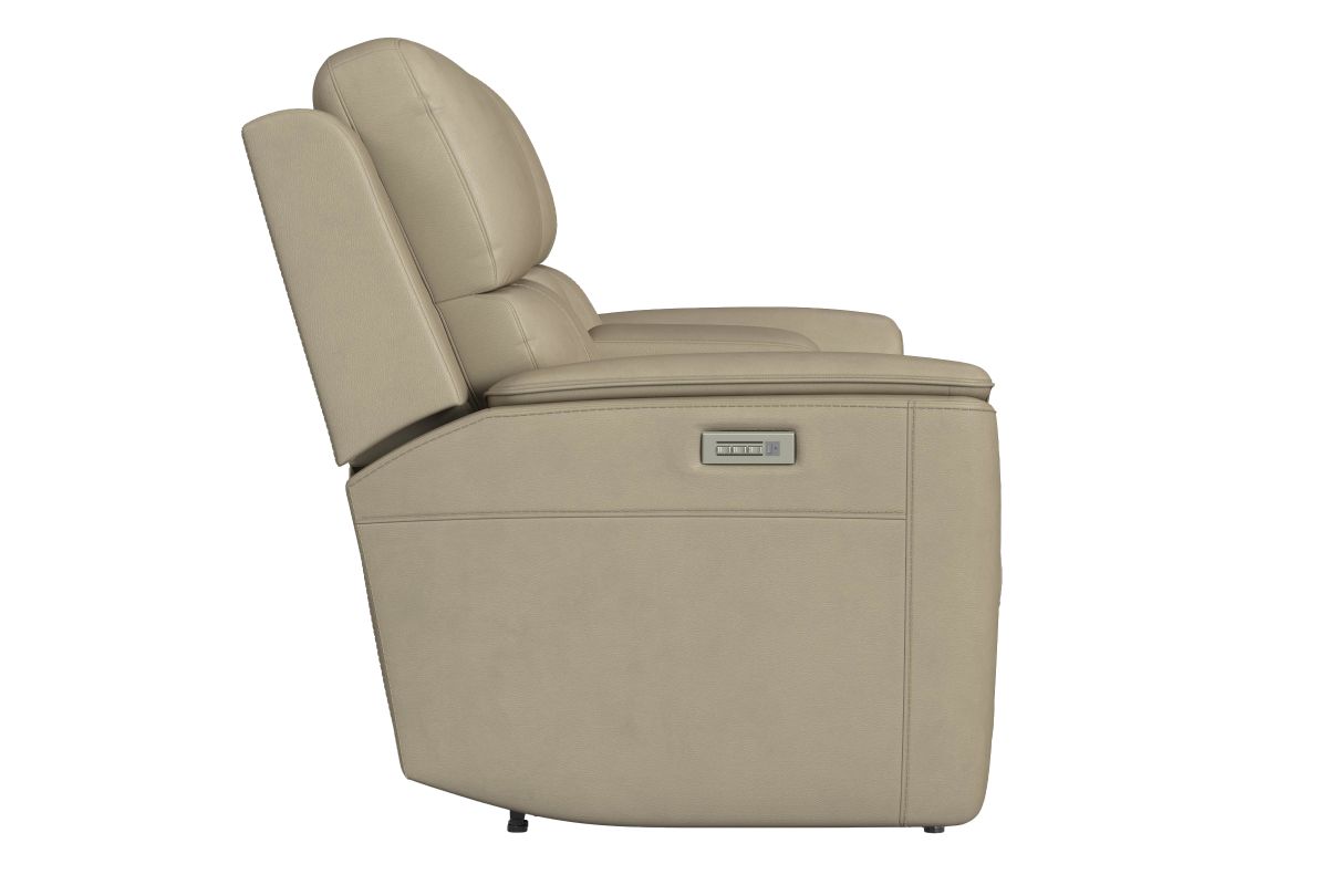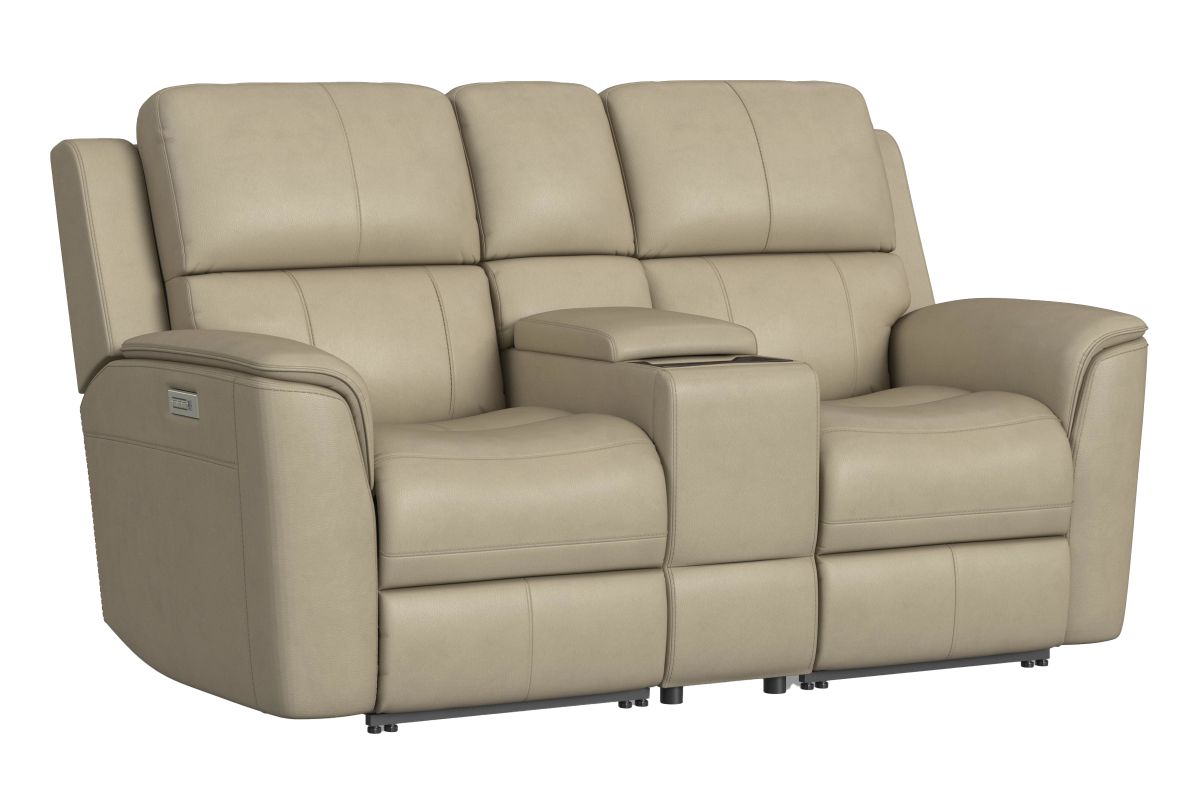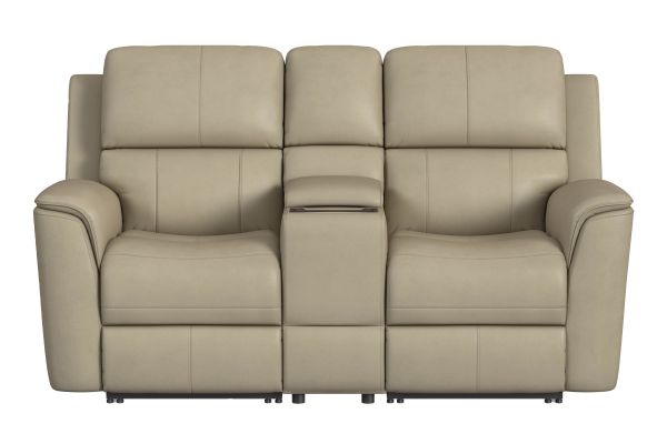 Treat yourself to a comfortable yet refined sitting experience with the Henry leather power reclining loveseat with console and power headrests and lumbar. This generously scaled frame is upholstered in a beige leather, and features contoured seats and padded arms with a unique sculptural shape and welt trim. The center console contains a storage compartment, wireless charging tray and pop-out dual cupholders. Power recline, headrest and lumbar control on both sides allows for customized comfort, and included USB ports provide convenient device charging. The Zero Gravity recline technology gives the feeling of weightlessness while Flexsteel's patented Blue Steel Spring provides lasting seat support.