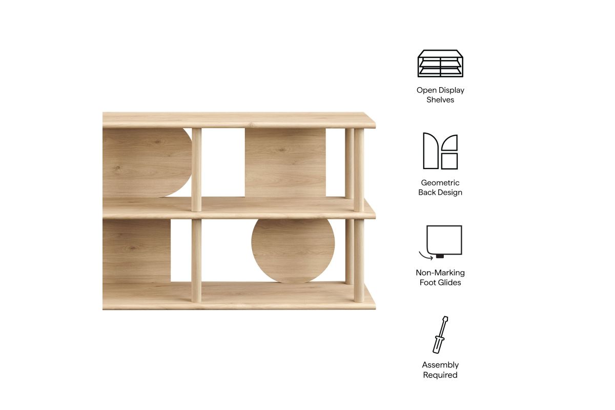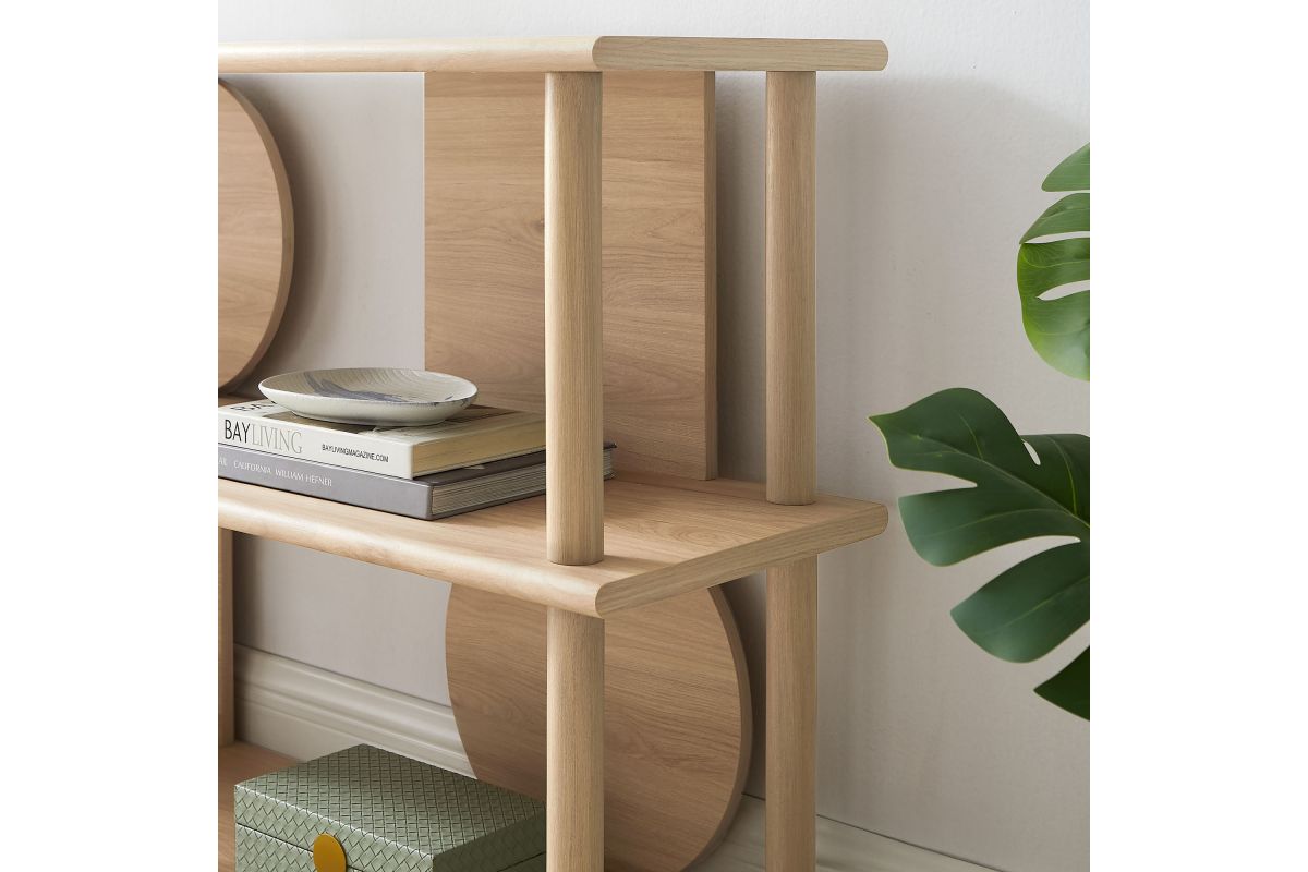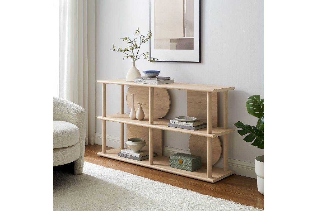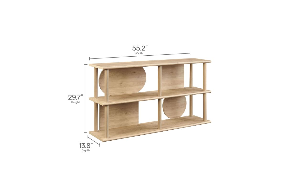 Make a sculptural statement with Zadie, a modern console table that turns everyday display into contemporary art. Designed with geometric shapes set against the back of three open shelves, this entryway console table plays with curved and linear objects and symmetry to create a bold architectural presence. The smooth wood finish softens the playful forms, and the bullnose edges bring a refined, modern touch. Vertical supports run between each tier to create a structured, column-like appearance, and the open shelves offer space to display books, ceramics, and decorative accents. Resting fully flat on the ground, this narrow console table is ideal as a living room table behind the couch, a hallway table, or a modern display stand. Includes non-marking foot glides to protect flooring. Assembly required. Shelf Weight Capacity: Top: 154lbs, Middle: 171lbs, Bottom: 171lbs.