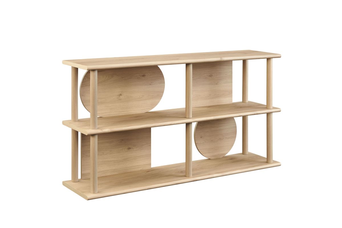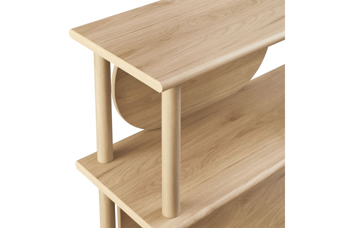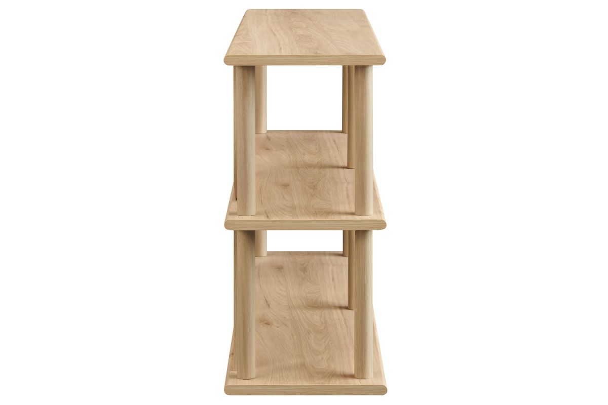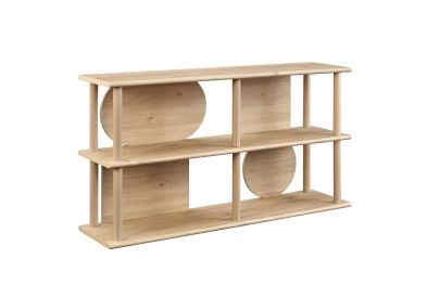 Make a sculptural statement with Zadie, a modern console table that turns everyday display into contemporary art. Designed with geometric shapes set against the back of three open shelves, this entryway console table plays with curved and linear objects and symmetry to create a bold architectural presence. The smooth wood finish softens the playful forms, and the bullnose edges bring a refined, modern touch. Vertical supports run between each tier to create a structured, column-like appearance, and the open shelves offer space to display books, ceramics, and decorative accents. Resting fully flat on the ground, this narrow console table is ideal as a living room table behind the couch, a hallway table, or a modern display stand. Includes non-marking foot glides to protect flooring. Assembly required. Shelf Weight Capacity: Top: 154lbs, Middle: 171lbs, Bottom: 171lbs.