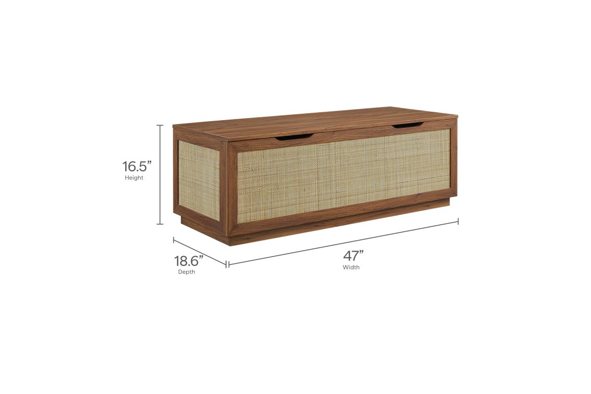 The Soma Entryway Storage Bench features clean lines, natural texture, and everyday function in one streamlined piece. Fully wrapped in faux rattan on all sides and framed in a warm laminated wood blend, this cane rattan entryway storage bench with flip-top hinge brings a light, organic feel to entryways, bedrooms, or under-window spaces. The hinged top lifts easily with two cut-out handles, revealing a deep, divided interior for shoes, blankets, or everyday essentials. Soft-close hinges and a safety warning label offer added guidance in family homes. With a flat base and no exposed legs, this storage bench for entryway sits low and solid, offering a relaxed silhouette that works in both modern and transitional spaces. Weight Capacity: 209 lbs.