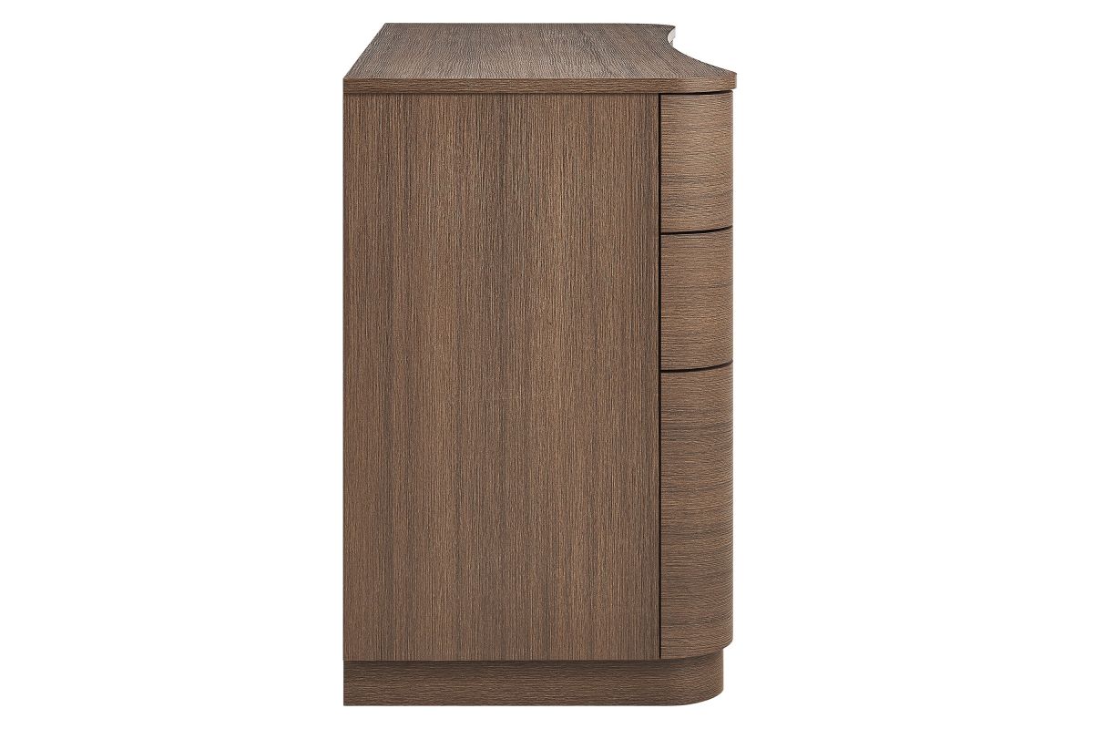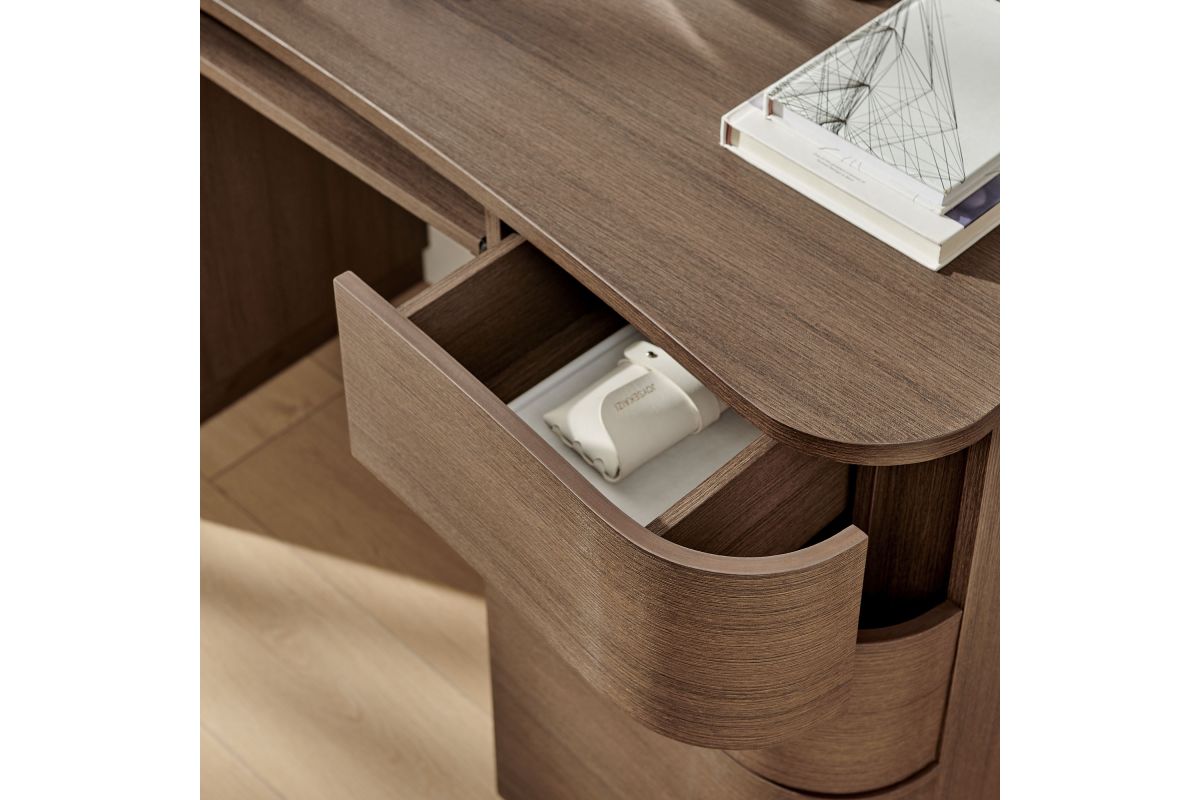 Clean curves meet practical storage in the Mirae Computer Desk, a compact home office essential with soft edges and sculptural appeal. Designed with a smooth wood grain laminate finish, this 55-inch writing desk features six drawers, including a filing drawer for documents and deeper side drawers for office supplies and more. A pull-out keyboard tray tucks neatly beneath the desktop, helping to keep your workspace clutter-free. With its rounded drawer fronts and mid-century inspiration, this modern office desk blends effortlessly into a study room or work-from-home setup. From writing and studying to makeup and home office work, this desk offers a stylish, space-saving solution for modern living. Assembly required.