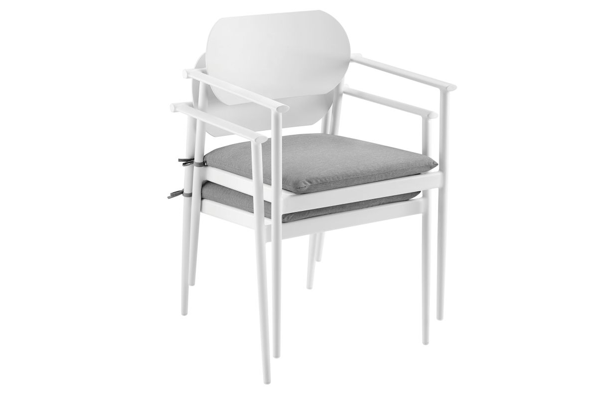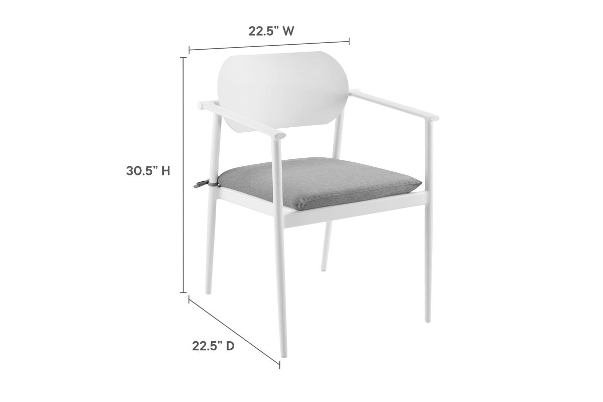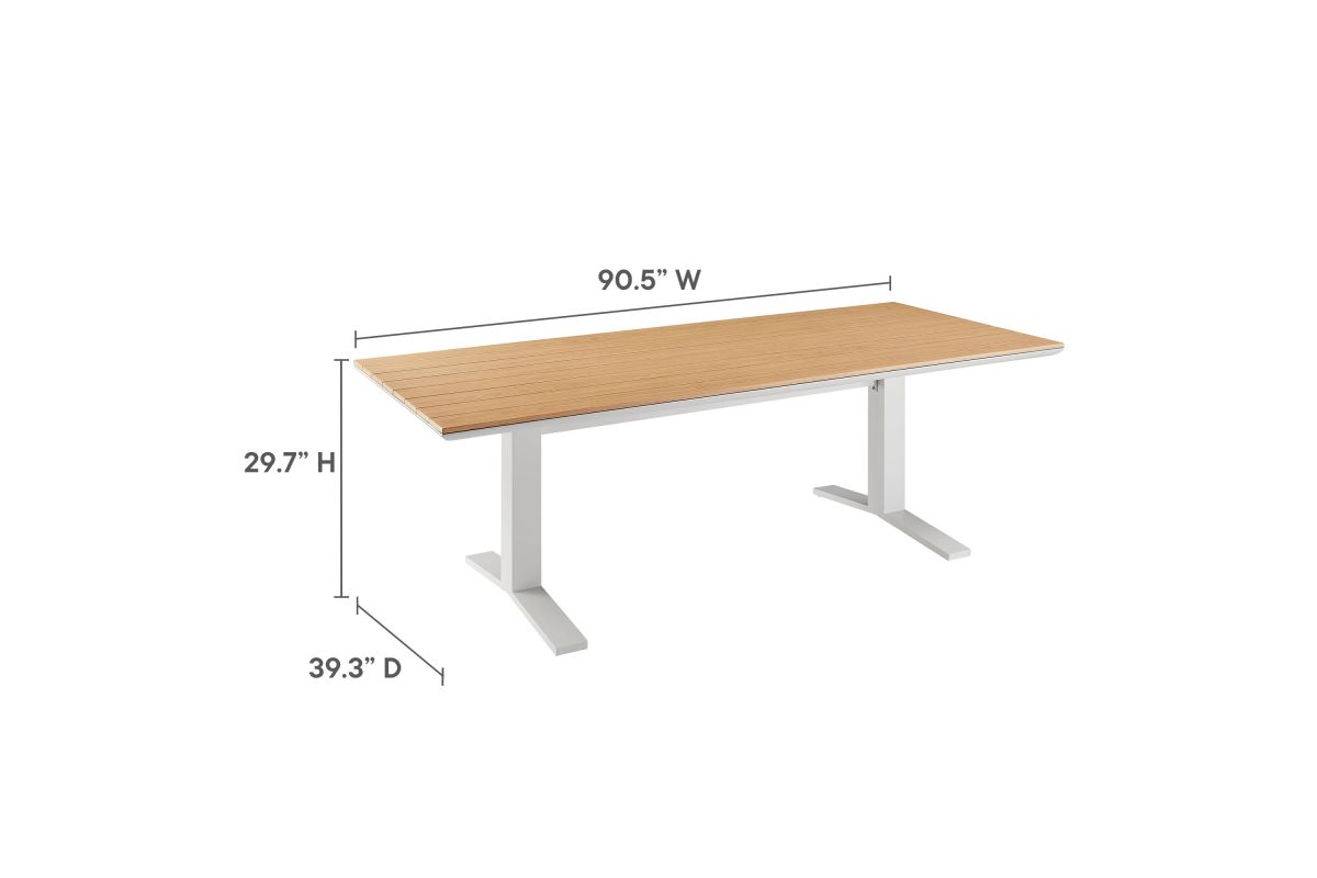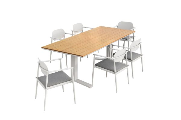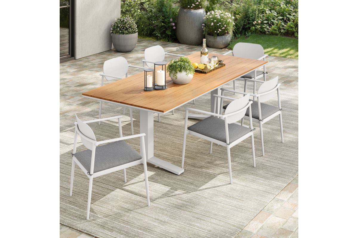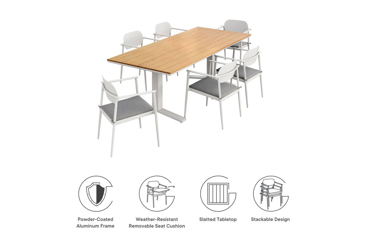 Create a chic outdoor dining experience with the modern Aeris 7-Piece Patio Dining Set. This complete outdoor dining set features a slatted faux wood rectangle table and six stackable patio chairs. Both the 91" patio table and chairs are crafted with powder-coated aluminum that offers durability and contemporary style, perfect for withstanding all weather conditions. The table showcases a unique T-shaped base, while each chair includes a gently sloped seat with an oblong backrest for ergonomic comfort. The chairs are also equipped with removable foam-padded seats, and water and UV-resistant fabric covers. Beneath each cushion, the chair’s open slat design promotes breathability and quick drying. With adjustable foot pins on the table and non-marking foot pads on the chairs, the entire aluminum outdoor dining set is thoughtfully designed to protect your patio floors. Whether for casual family meals or spontaneous gatherings, the Aeris Aluminum Dining Set is the perfect modern patio dining set for 6. Assembly required.