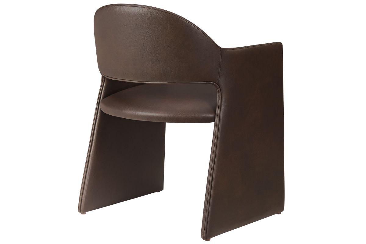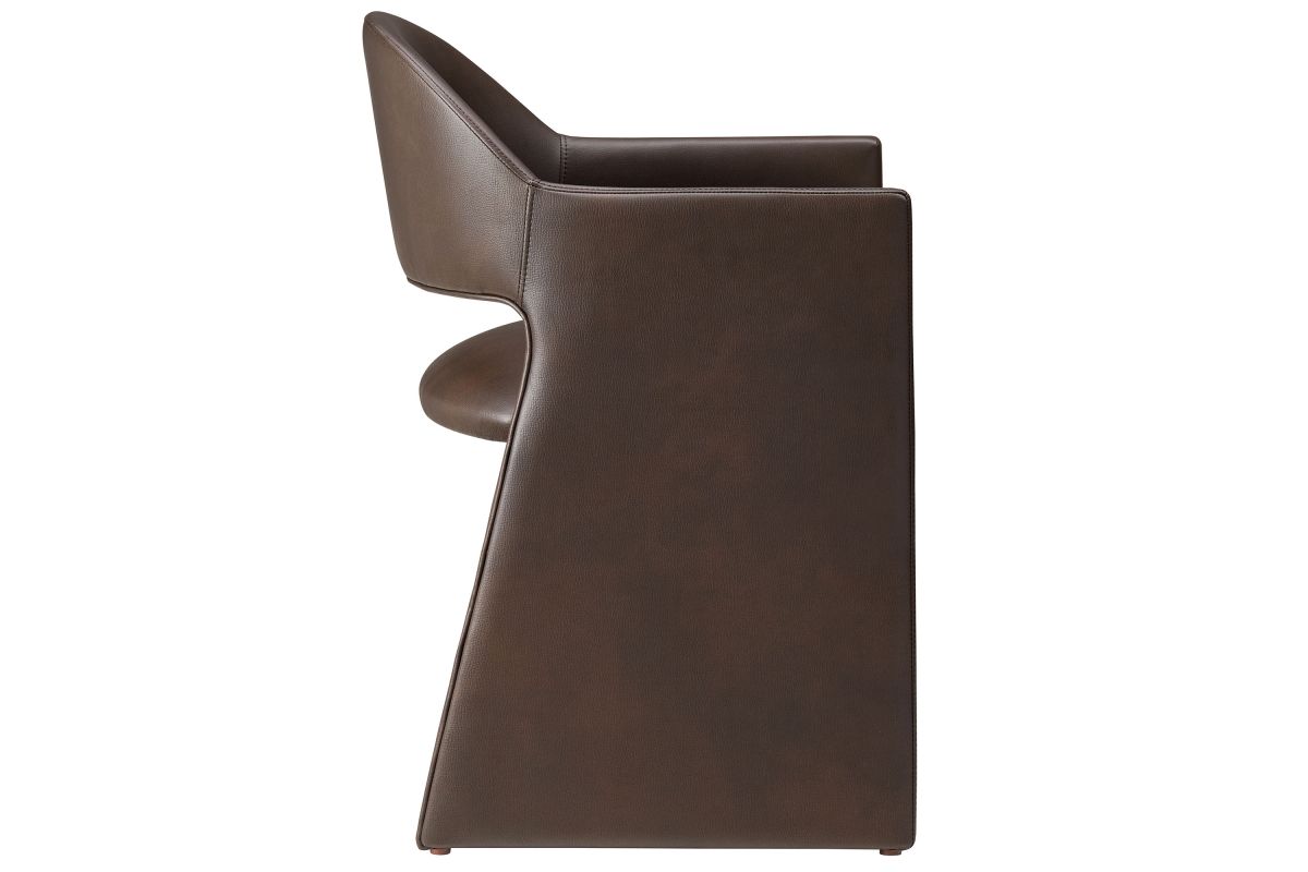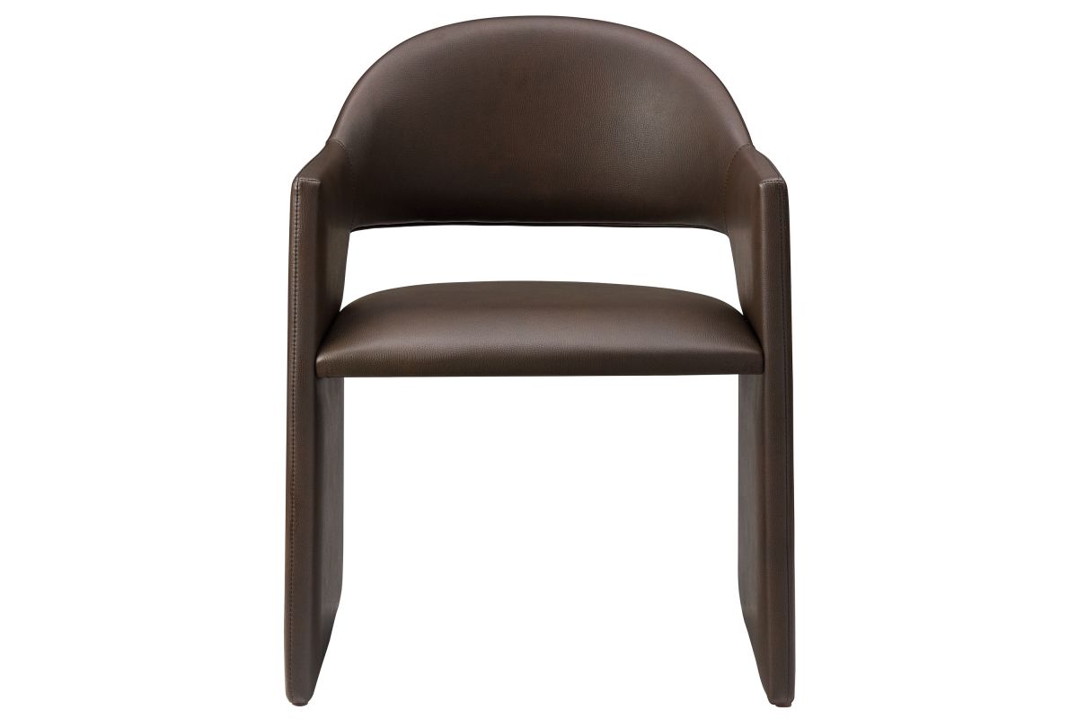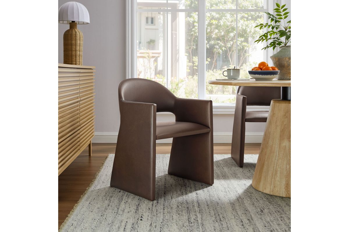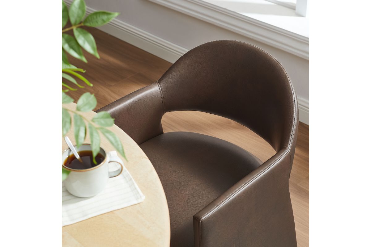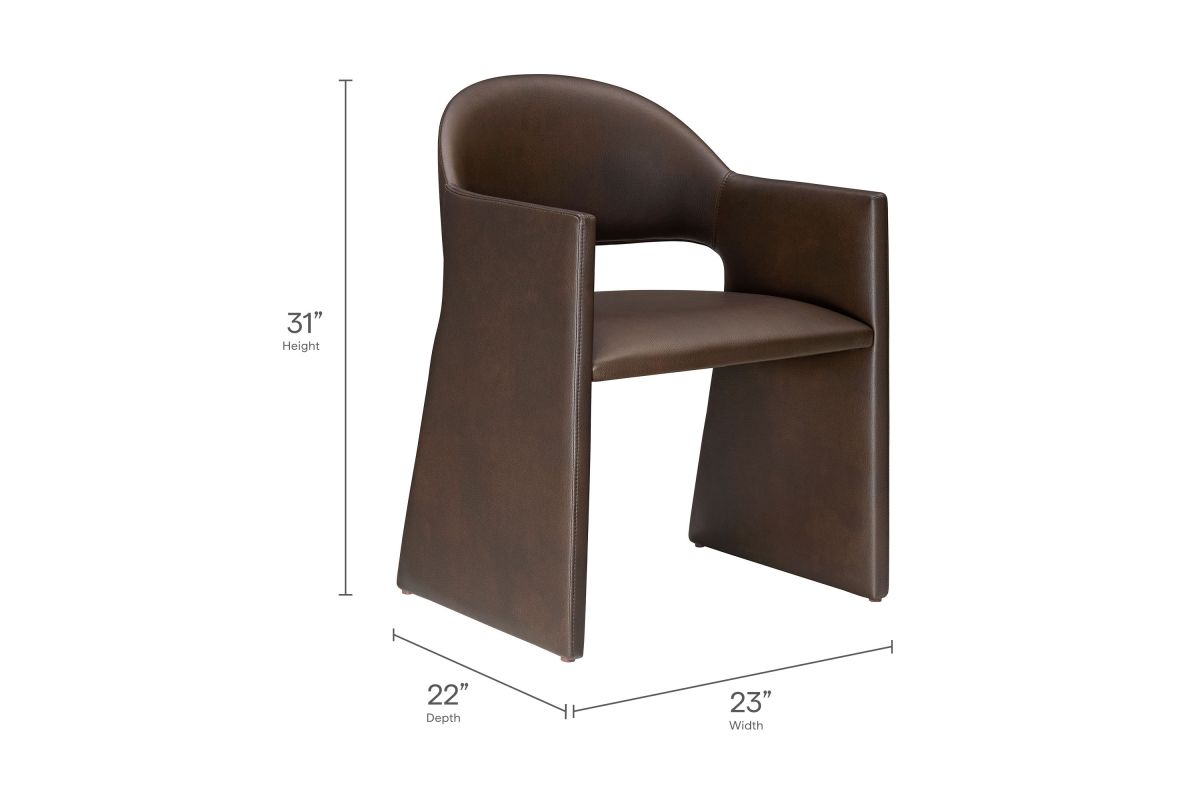 The Talia Vegan Leather Dining Chair is a stunning example of modern design, blending clean lines with luxurious comfort. Whether as a stylish living room accent chair, a statement piece in the dining area, or even a chic office accent chair, this barrel back dining chair offers both timeless style and versatility. Built on a sturdy bentwood frame, this dining chair with arms is fully upholstered in smooth, pebbled easy-care vegan leather for a premium look and feel. Its elegantly curved backrest flows seamlessly into wide, angular armrests that extend down to the floor, creating a sculptural look that's perfect for minimalist and contemporary spaces. The open-back design of this curved dining chair provides a light and airy feel, while the generously padded seat ensures lasting comfort. Completing the design, floor-protecting foot pins are included to prevent scratches, making it easy to move and enjoy without worry. This faux leather armchair arrives fully assembled, ready to elevate your space. Weight Capacity: 300 lbs.