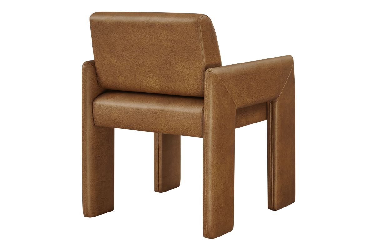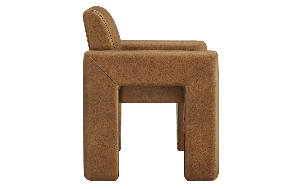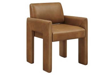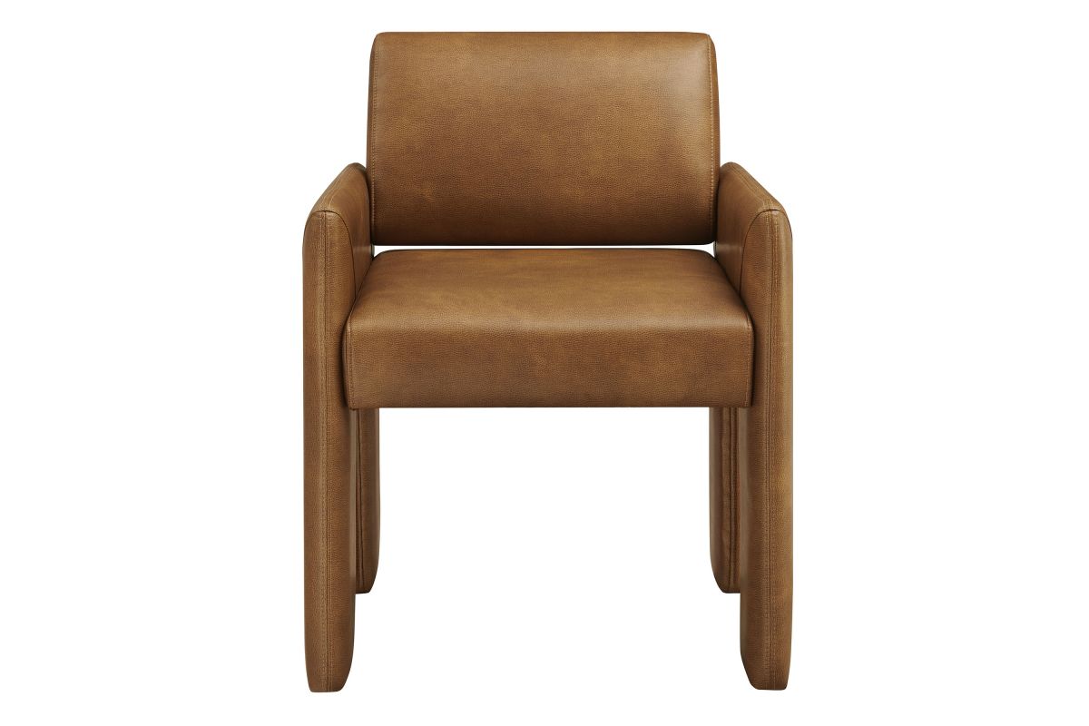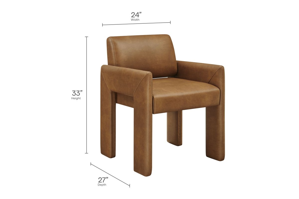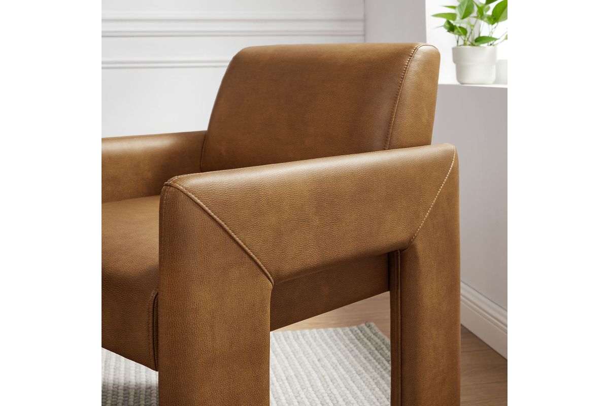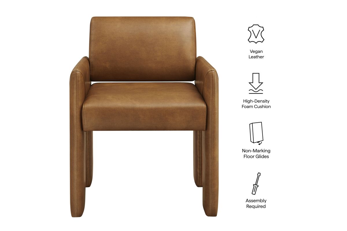 The Daven Vegan Leather Dining Chair combines mid-century modern style with supportive comfort in a sleek, versatile design. Fully upholstered in premium vegan leather, this modern armchair delivers a clean silhouette ideal for dining rooms, offices, bedrooms, or living rooms. Thoughtfully constructed with a webbed seat support system and dense foam cushioning, Daven offers lasting comfort whether used as a modern upholstered dining chair or an occasional accent seat. Its distinctive base features angled legs and a low-profile stance, creating a spacious architectural look while remaining compact enough for small spaces. Designed with both aesthetics and practicality in mind, Daven includes discreet floor glides to protect surfaces and a secure bracket system to keep the backrest in place. This dining arm chair adds sculptural appeal when styled as a vegan leather dining chair, reading nook accent, or sleek office guest chair. Assembly required. Weight Capacity: 500 lbs.