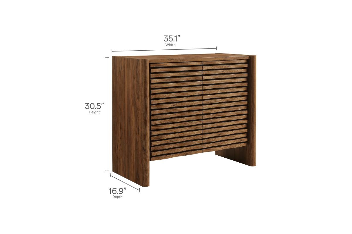 Simple in purpose, the Emric Wave Cabinet brings a soft, sculpted feel to functional storage. Made from a laminated wood blend with a smooth finish, this accent cabinet features slatted doors with a subtle wave design resting on a black backdrop that adds depth and movement. Two hinged doors open to reveal interior shelving, ideal for storing anything from linens to serveware. With thick side panels that extend to the floor, this buffet cabinet rests on a solid base that feels grounded from every angle. Whether styled as a small sideboard, or storage chest in a living room or hallway, this modern floor cabinet brings character and convenience to any space. Includes foot glides for floor protection. Assembly required.