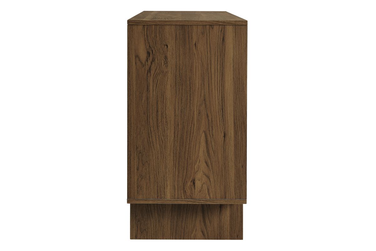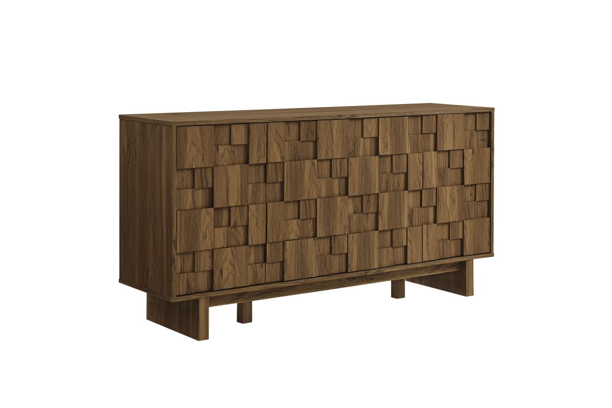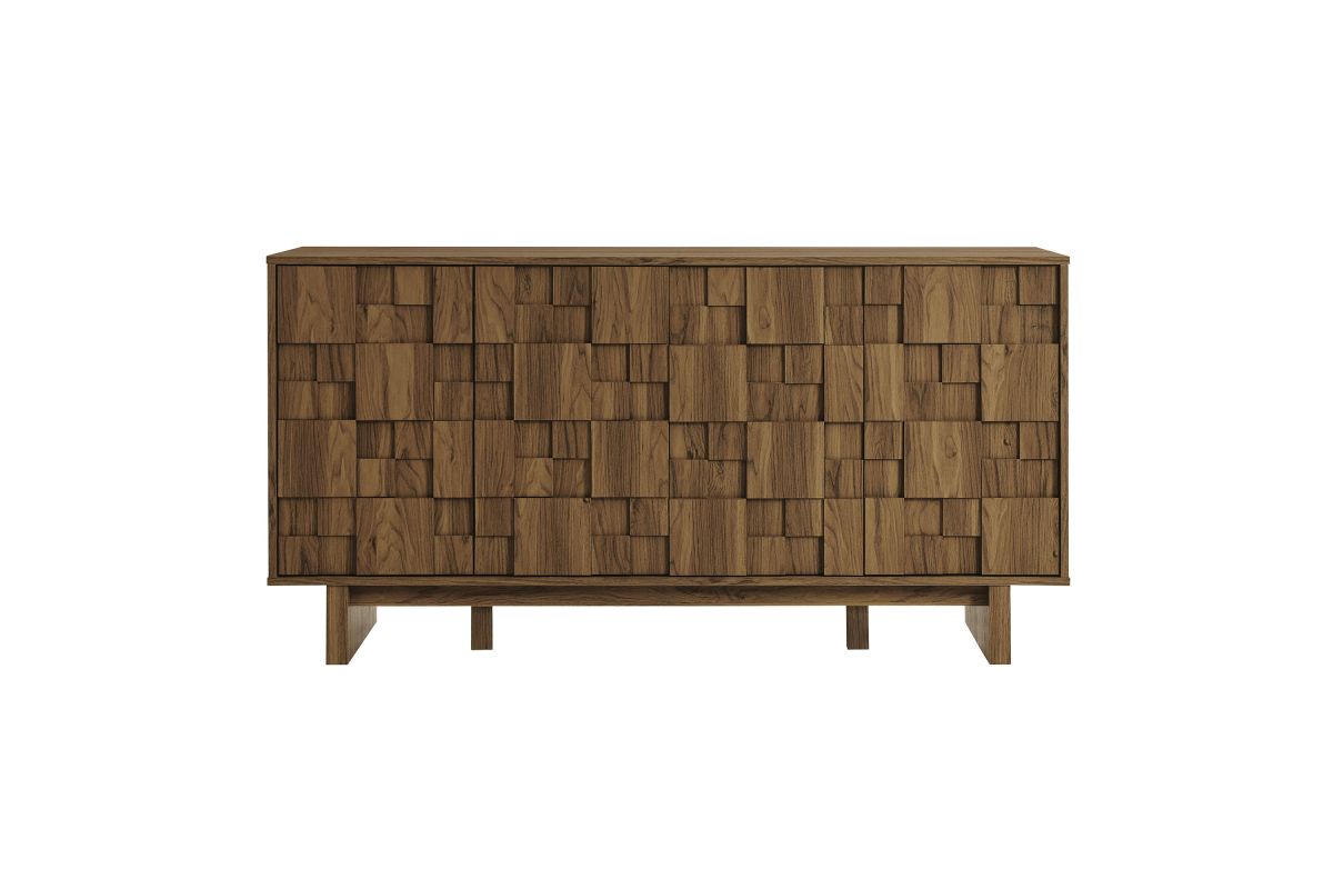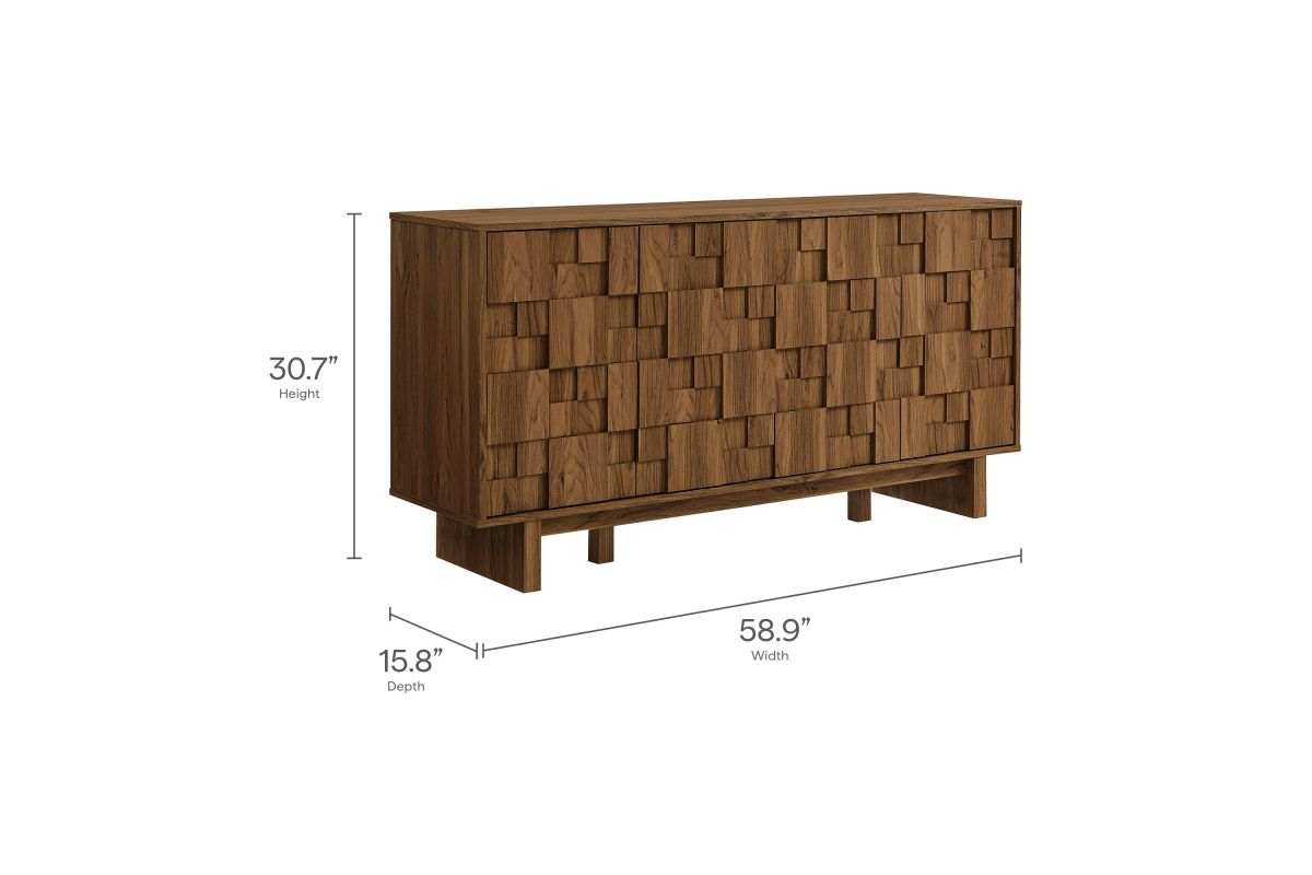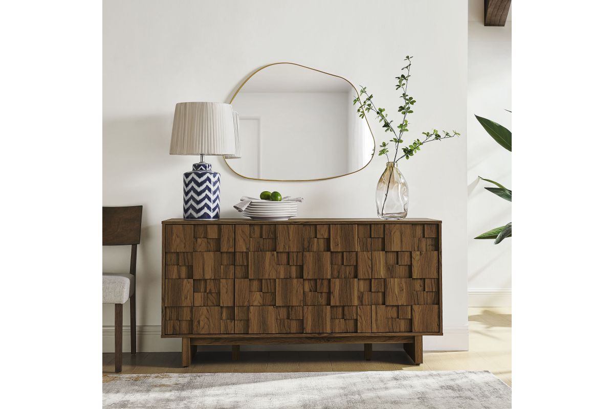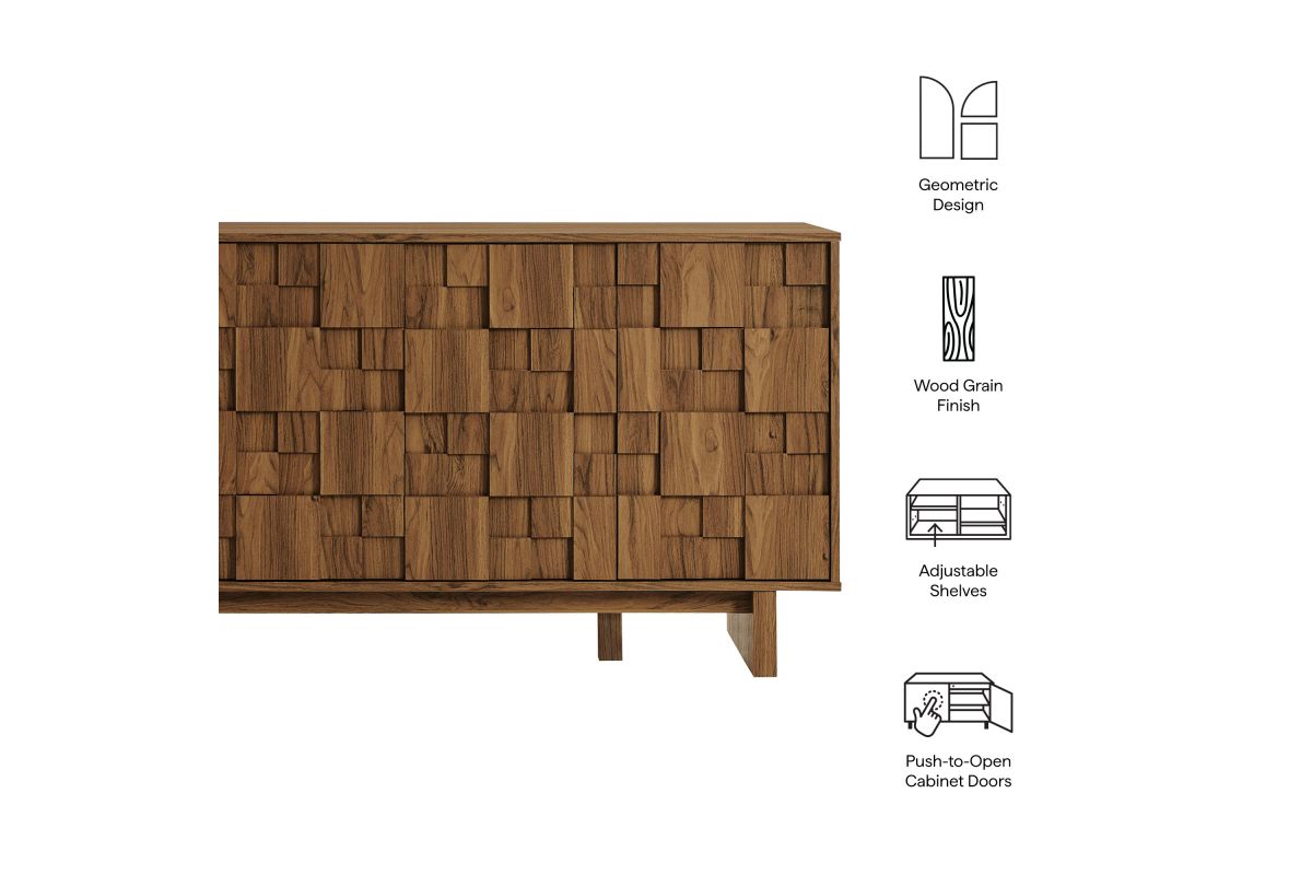 Designed to draw the eye and organize your space, the Owen 4 Door Mosaic Sideboard adds bold texture and modern warmth to dining areas, living rooms, or entryways. Its carved geometric doors, crafted from a sturdy wood blend, create a detailed mosaic look that feels both clean and dimensional. Each of the four push-to-open doors conceals a spacious compartment with adjustable shelves, three cable management holes with covers, and soft close hinges for smooth, quiet storage. Set on a recessed plinth base with wide panel-style legs and non-marking glides, this buffet sideboard cabinet works beautifully as an entryway storage credenza, dining room buffet cabinet, or a living room media console below a wall-mounted TV.