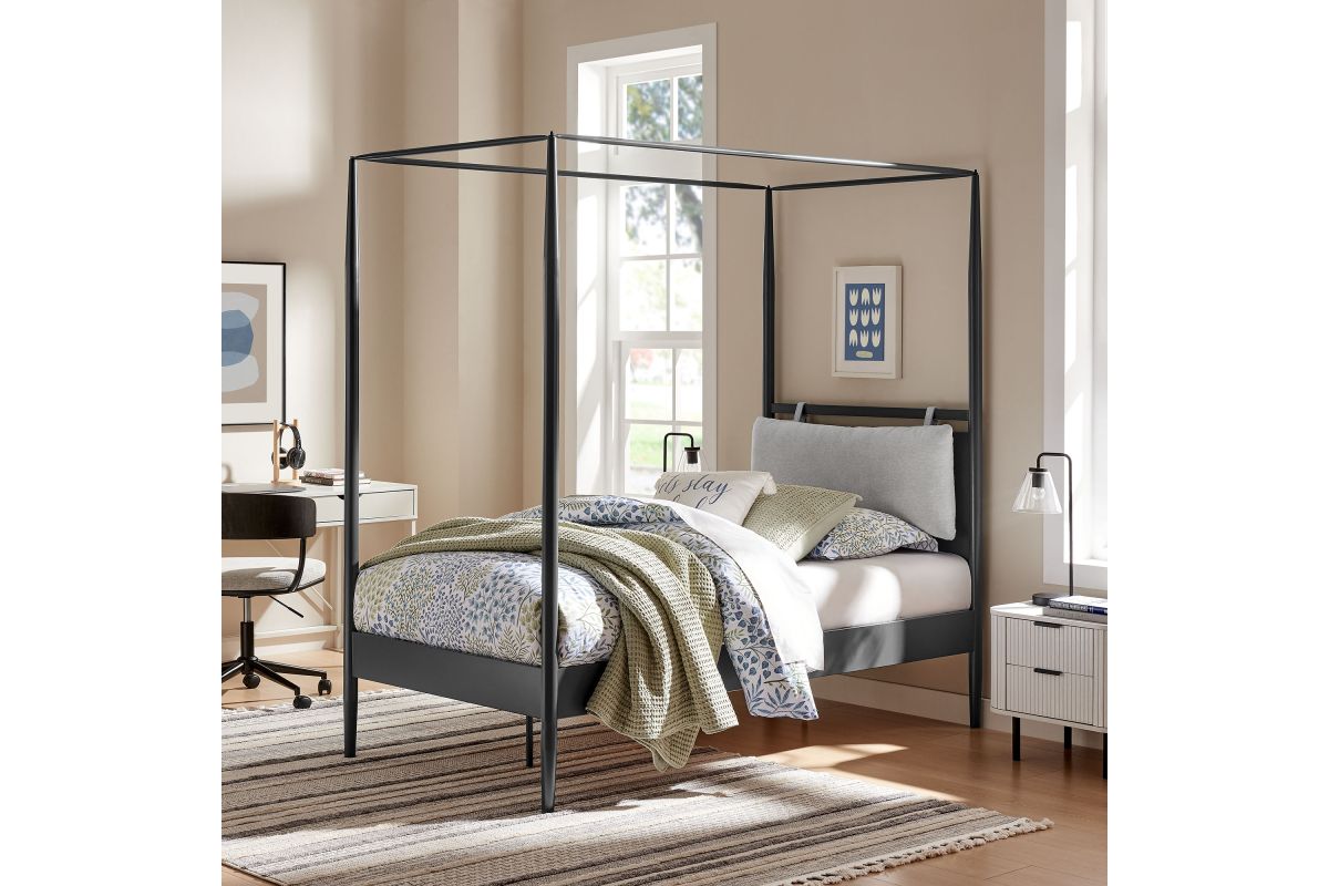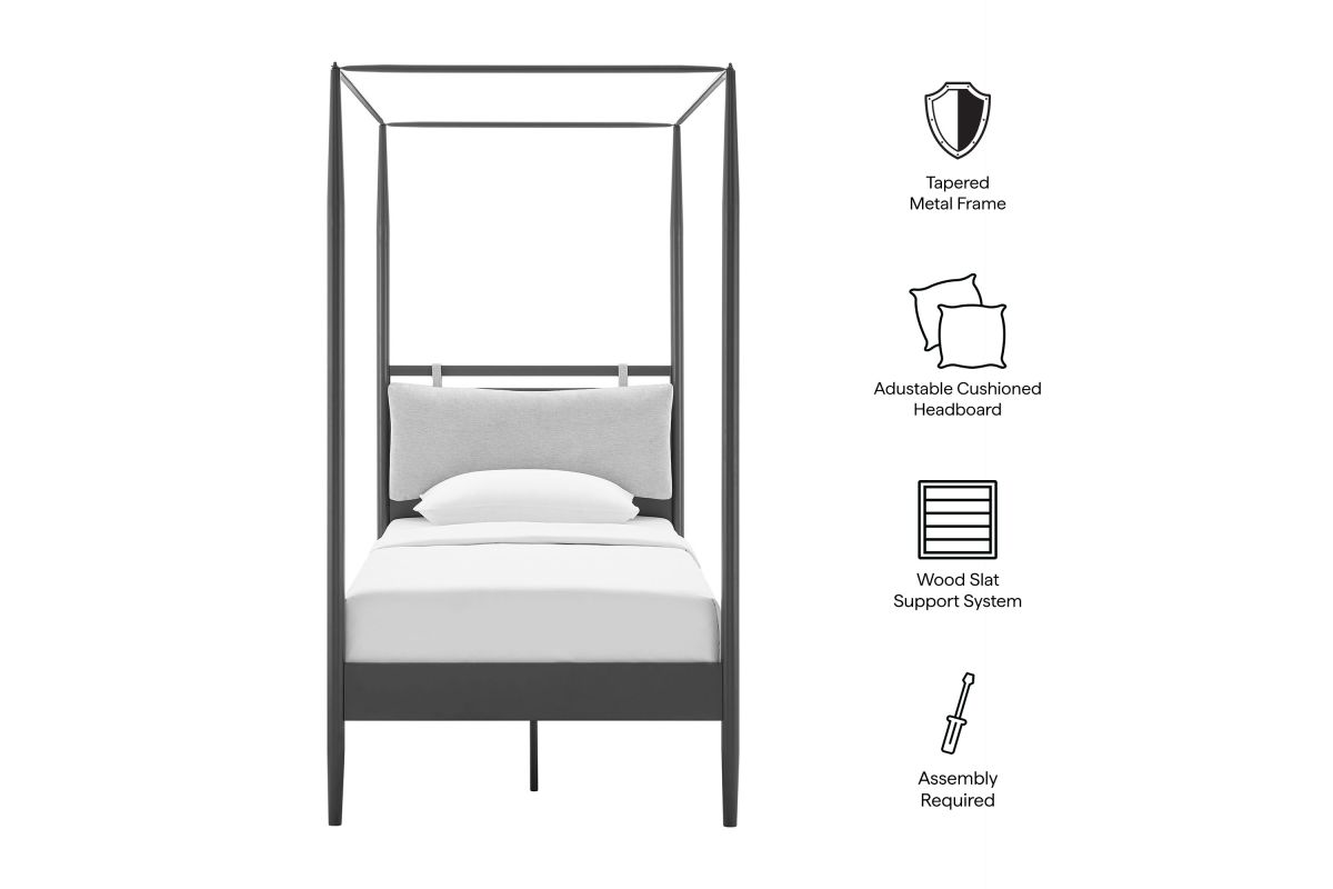 Sculptural and serene, the Marlowe Twin Canopy Bed brings architectural elegance to the modern bedroom. A contemporary interpretation of a classic four-poster frame, this twin-size platform bed is crafted from durable iron metal with gently tapered posts that create an airy yet grounded silhouette. The minimalist frame is softened by an integrated cushioned headboard—a single plush, upholstered pillow is attached with fabric straps. The headrest can be adjusted up or down for personalized comfort or removed entirely for a streamlined look. Designed to support a variety of mattress types, this canopy bed with integrated headboard includes a poplar wood mattress foundation that promotes airflow and eliminates the need for a box spring. With its blend of comfort, structure, and versatility, this canopy bed redefines your sleep space with understated drama. Assembly required. Weight Capacity: 400 lbs.