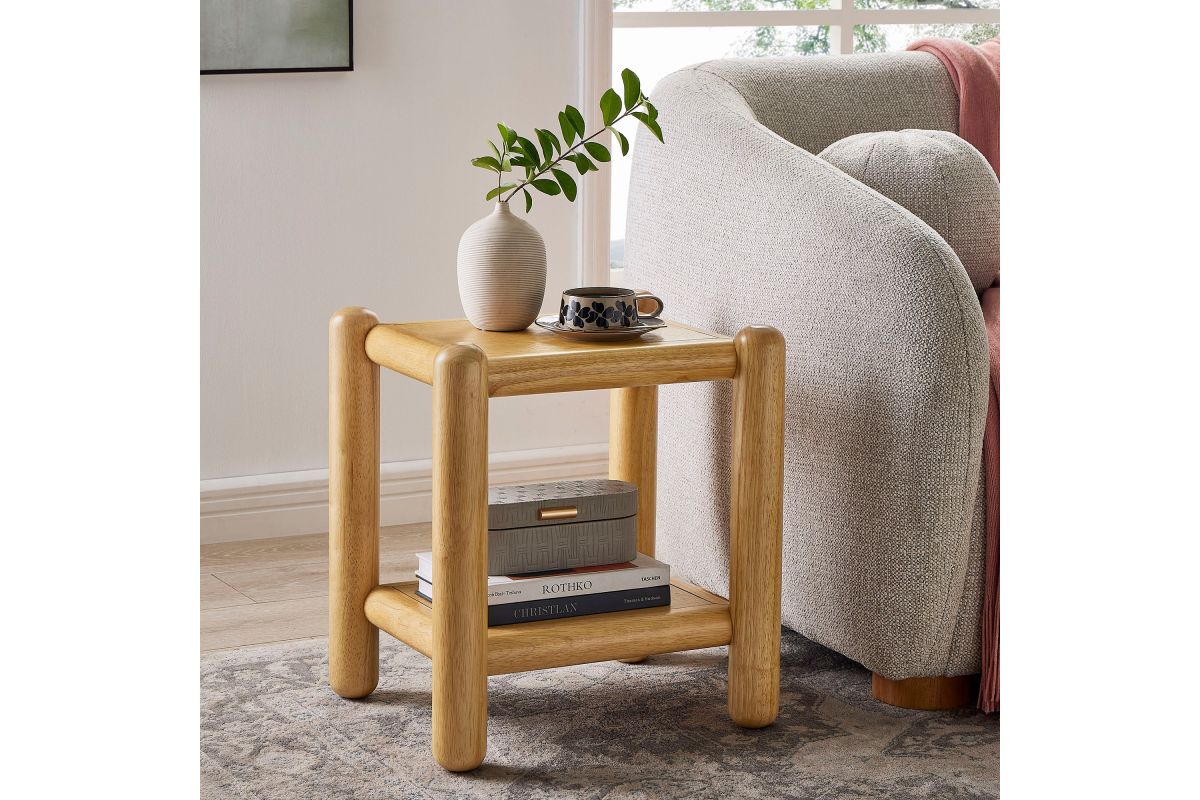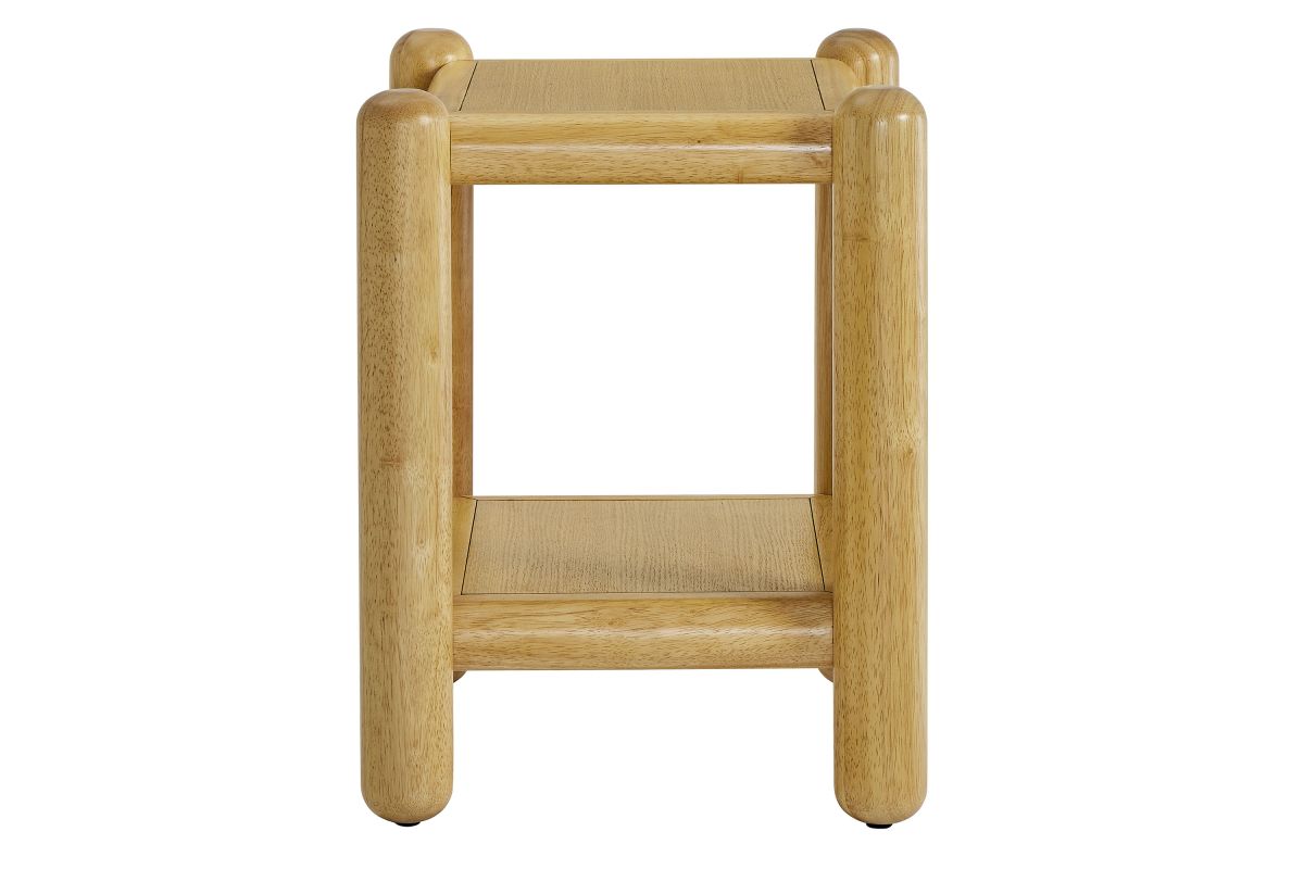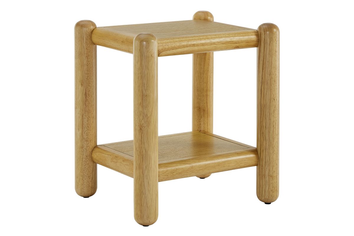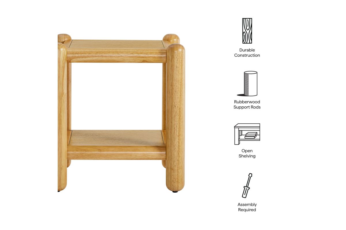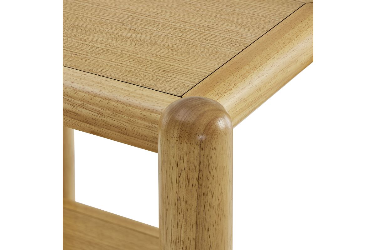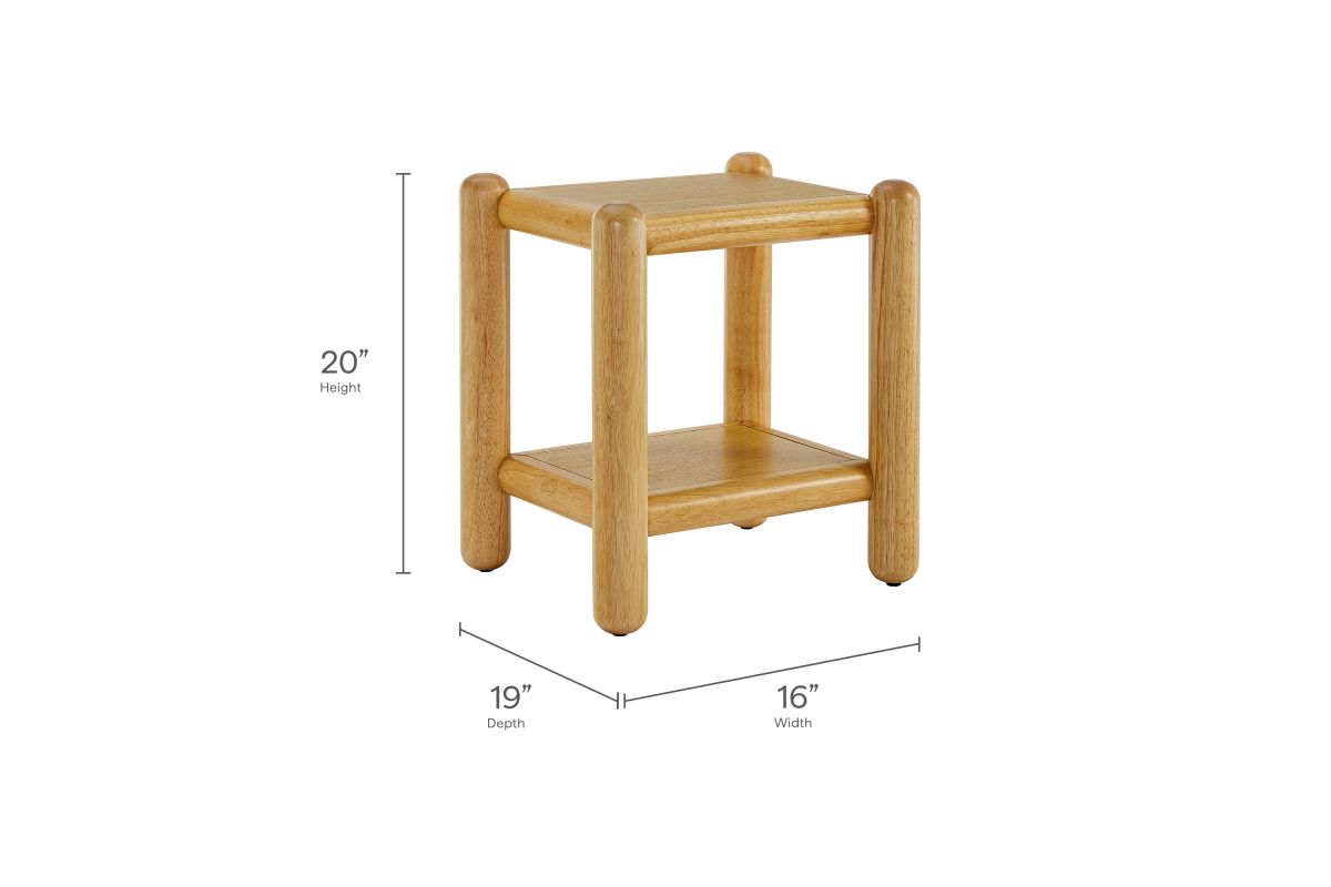 Blending soft geometry with simple utility, the Arcus Side Table brings effortless charm and functionality to modern interiors. This rectangular two-tier table is crafted from oak wood veneer shelves and a rubberwood frame, offering the look of solid wood with enhanced stability. Its compact footprint makes it ideal as a small nightstand in bedrooms, a convenient sofa-side companion in the living room, or even a narrow accent table in a hallway or corner nook. The open lower shelf provides easy-access storage for books, remotes, or bedside essentials, while the smooth top is perfect for lamps, decor, or your favorite cup of tea. With clean lines and warm tones, this two-tiered rectangular table is the minimalist utility piece that elevates any space—whether styled as a wood nightstand, end table, plant stand, or petite utility shelf. Assembly required. Weight Capacity: 132 lbs.