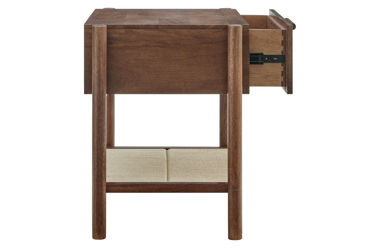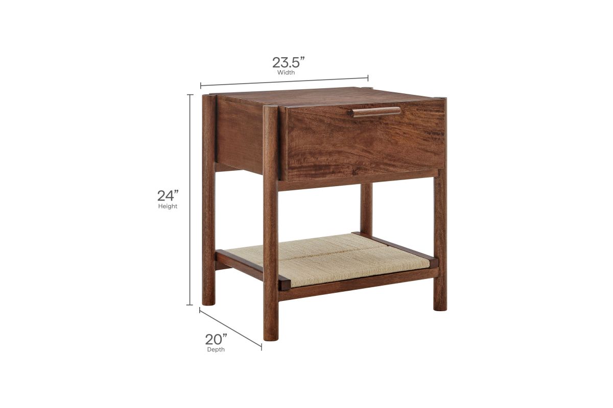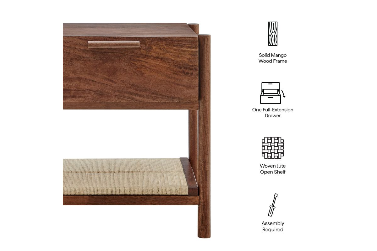 A blend of warm texture and modern form, the Oswin Nightstand brings effortless style and function to the bedside. Crafted from solid mango wood, this wood nightstand with drawer and open shelf showcases clean mid-century lines, softened by its cylindrical post legs and a woven jute shelf for open storage. A single full-extension drawer glides smoothly, offering space for bedside essentials, while the rich wood grain adds natural character to any room. Whether styled in a modern bedroom, guest room, or cozy nook, Oswin is both mid-century and timeless. Includes non-marking nylon floor glides to protect flooring. Assembly required.