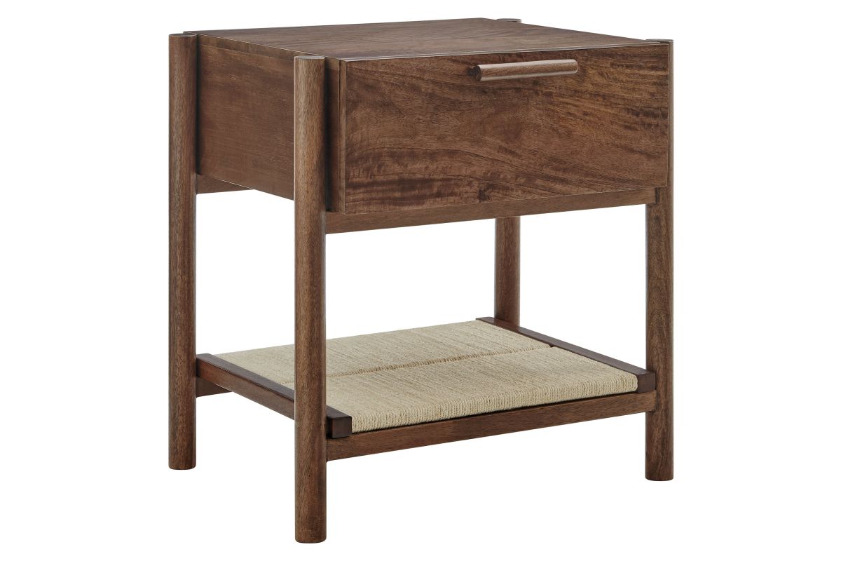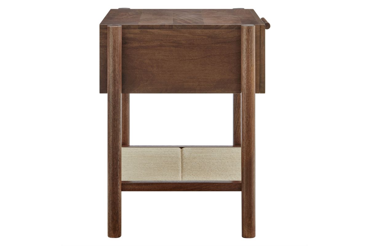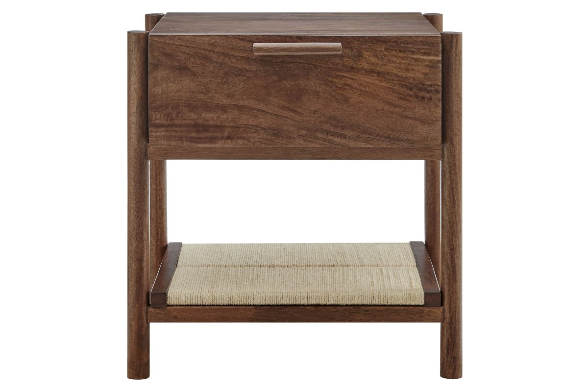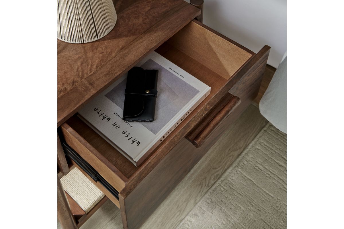 A blend of warm texture and modern form, the Oswin Nightstand brings effortless style and function to the bedside. Crafted from solid mango wood, this wood nightstand with drawer and open shelf showcases clean mid-century lines, softened by its cylindrical post legs and a woven jute shelf for open storage. A single full-extension drawer glides smoothly, offering space for bedside essentials, while the rich wood grain adds natural character to any room. Whether styled in a modern bedroom, guest room, or cozy nook, Oswin is both mid-century and timeless. Includes non-marking nylon floor glides to protect flooring. Assembly required.