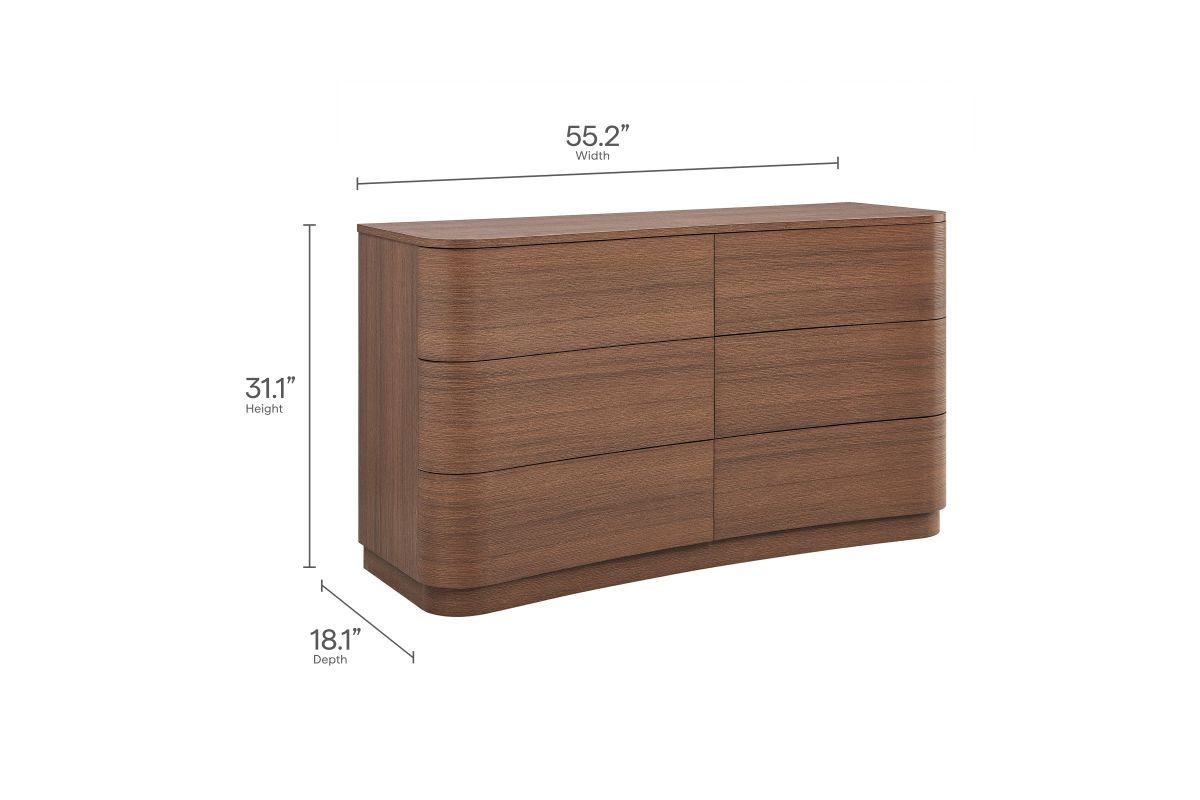 Sculptural lines and generous storage make the Mirae 6-Drawer Dresser a standout piece for the modern bedroom. Designed with a wide frame and gracefully curved drawer fronts, this horizontal dresser brings soft edges and visual flow to any space. Smooth wood grain laminate highlights the natural form, while six spacious deep drawers offer plenty of room for clothing, linens, or everyday essentials. Whether styled as a statement dresser in the bedroom, a storage cabinet in the entryway, or even a TV stand dresser for wall mounted TVs in the living or guest room, Mirae blends beauty and functionality in a streamlined profile. Assembly required.