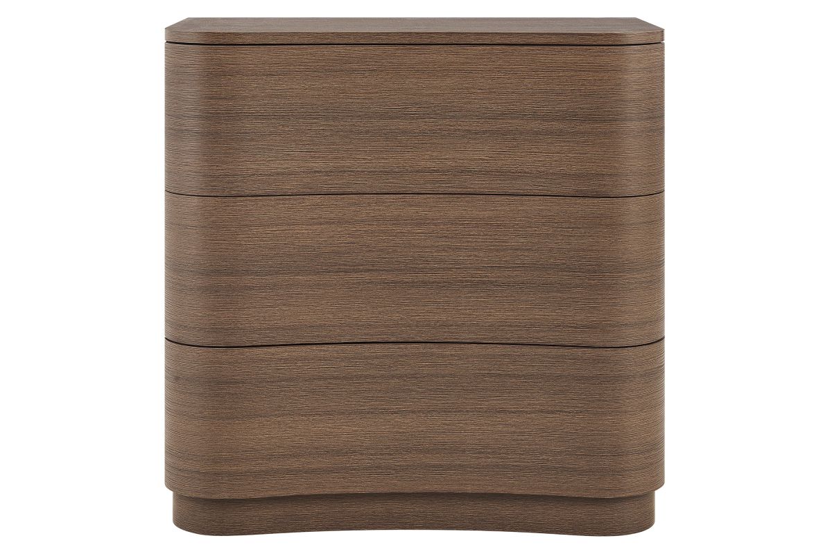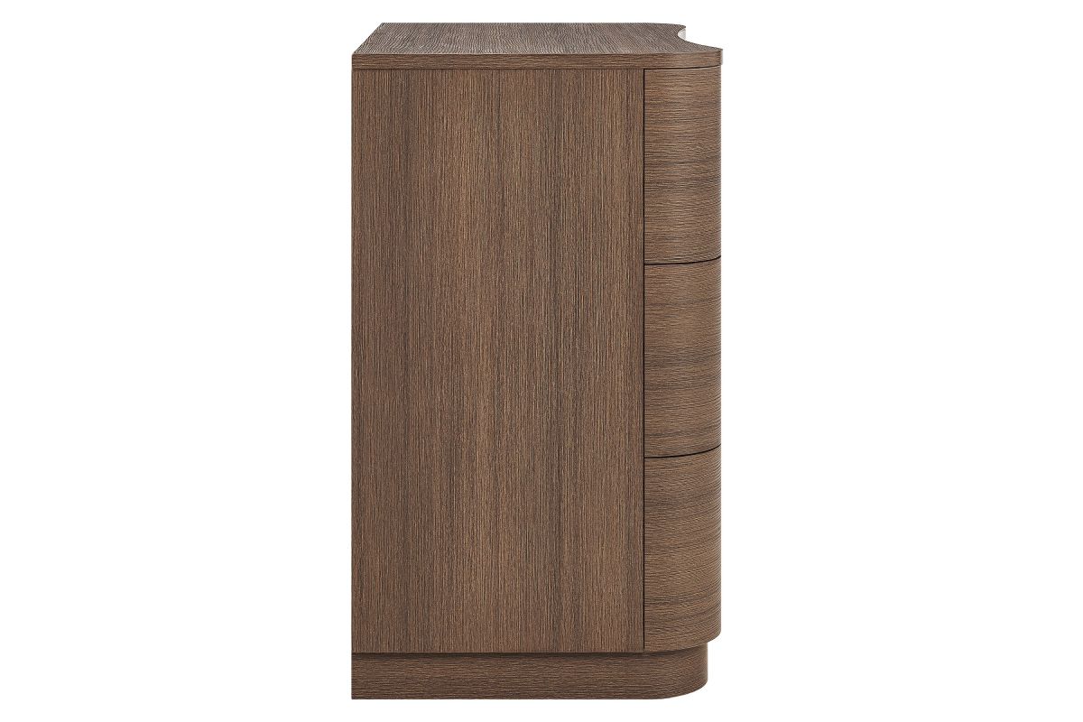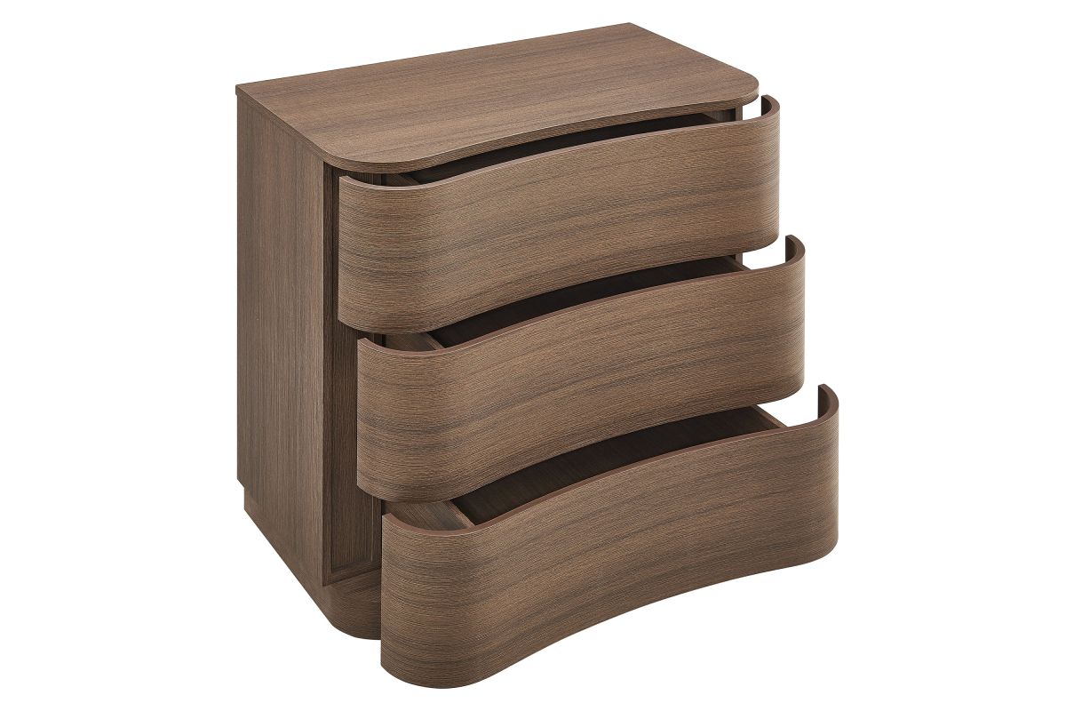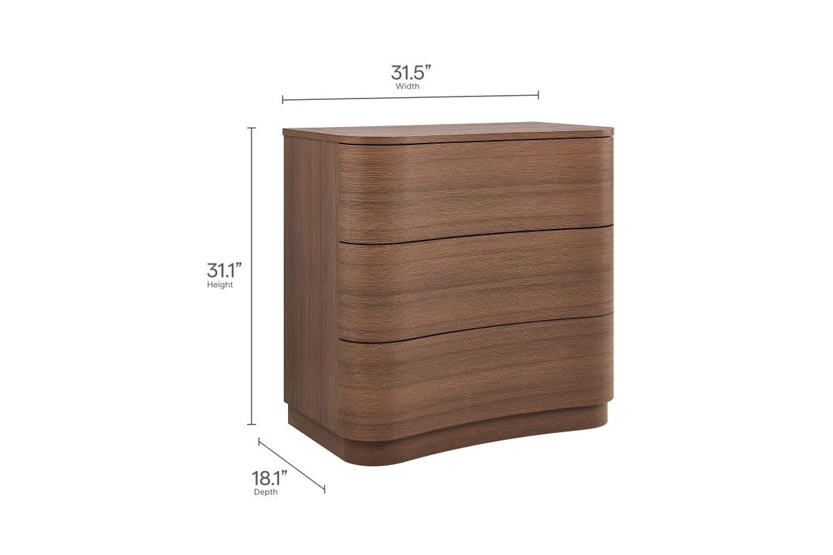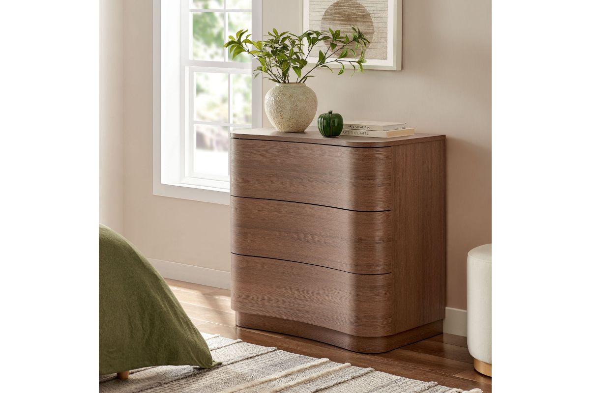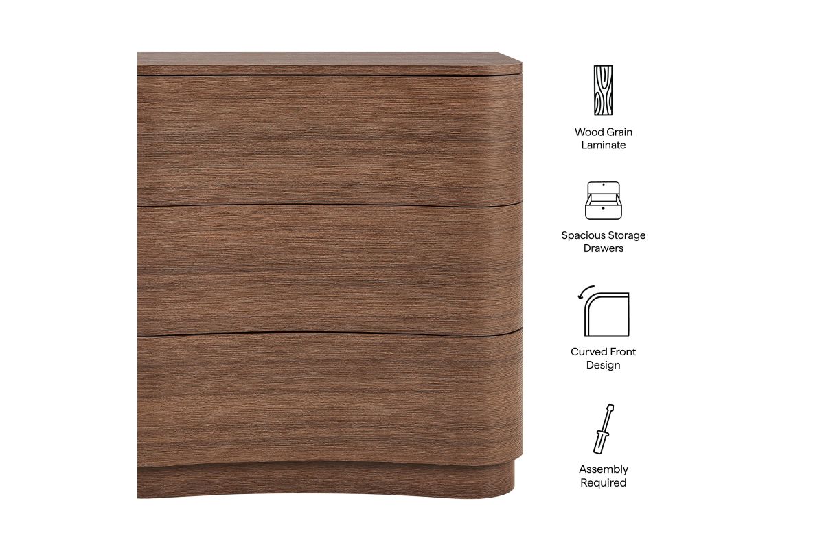 Sculptural lines and smart storage make the Mirae 3-Drawer Dresser a standout piece for small-space living. Designed with a sleek frame and gracefully curved drawer fronts, this compact dresser brings soft edges and visual flow to any setting. Smooth wood grain laminate highlights the natural form, while three spacious deep drawers offer ample room for clothing, bedside items, or everyday essentials. Whether styled as a tall 3-drawer nightstand, a narrow chest of drawers, or a small dresser for an apartment or dorm, Mirae blends beauty and functionality in a streamlined profile. Assembly required.