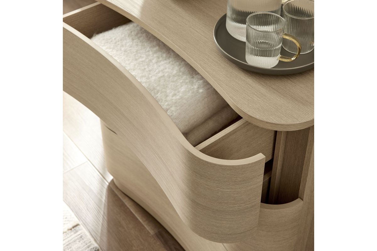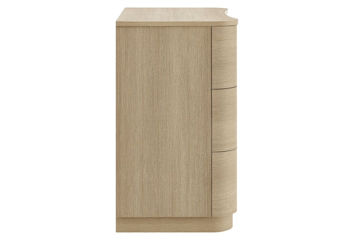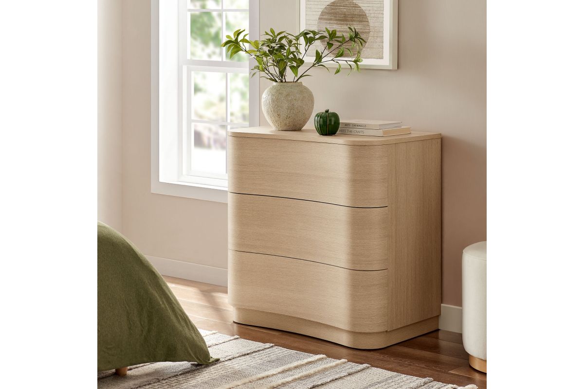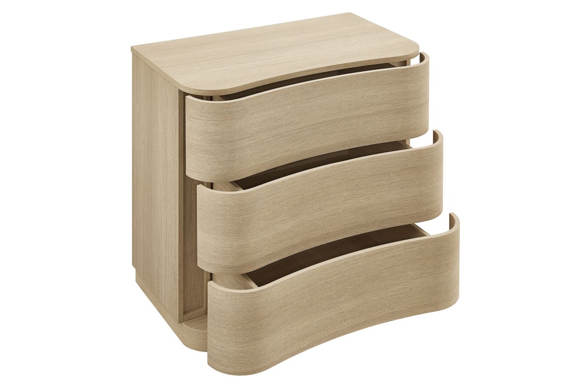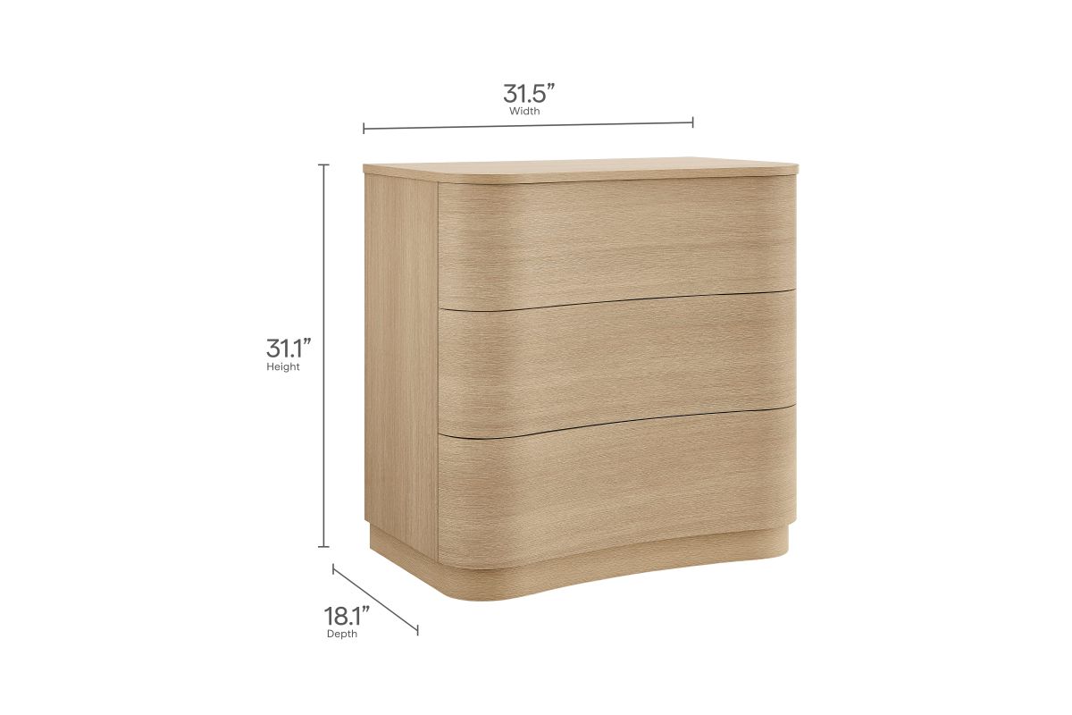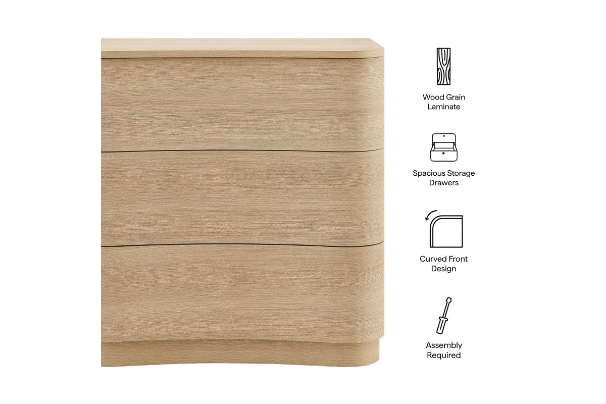Sculptural lines and smart storage make the Mirae 3-Drawer Dresser a standout piece for small-space living. Designed with a sleek frame and gracefully curved drawer fronts, this compact dresser brings soft edges and visual flow to any setting. Smooth wood grain laminate highlights the natural form, while three spacious deep drawers offer ample room for clothing, bedside items, or everyday essentials. Whether styled as a tall 3-drawer nightstand, a narrow chest of drawers, or a small dresser for an apartment or dorm, Mirae blends beauty and functionality in a streamlined profile. Assembly required.