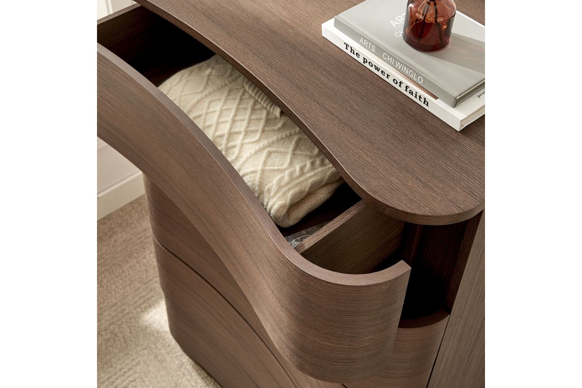 Sculptural lines and vertical storage make the Mirae 5-Drawer Dresser Chest a standout piece for the modern bedroom. Designed with a tall frame and gracefully curved drawer fronts, this upright vertical dresser brings soft edges and visual flow to any space. Smooth wood grain laminate highlights the natural form, while five spacious deep drawers offer plenty of room for clothing, linens, or everyday essentials. Whether styled as a tall dresser in the bedroom, a closet cabinet, or a vertical accent chest in a hallway or guest room, Mirae blends beauty and functionality in a streamlined profile. Assembly required.