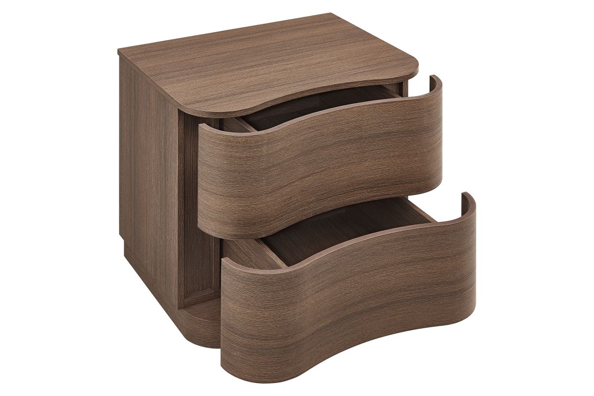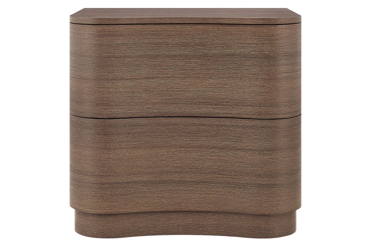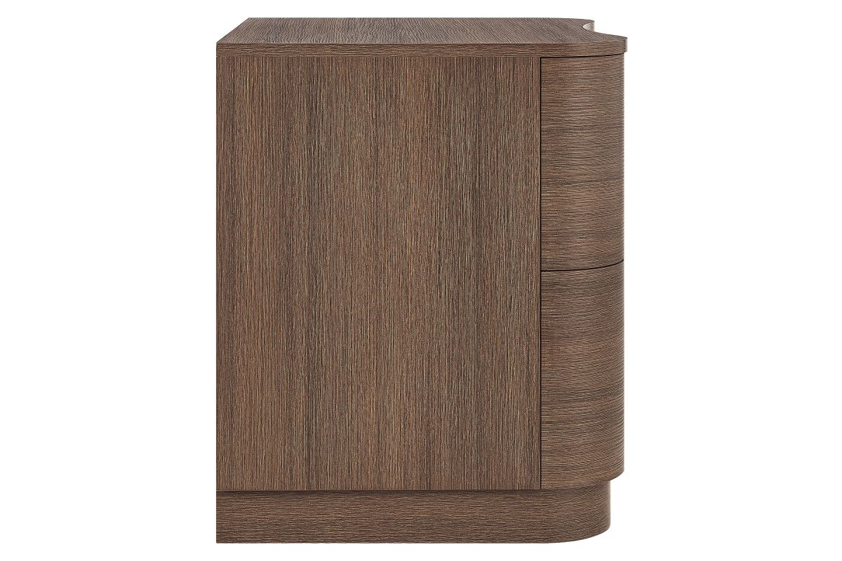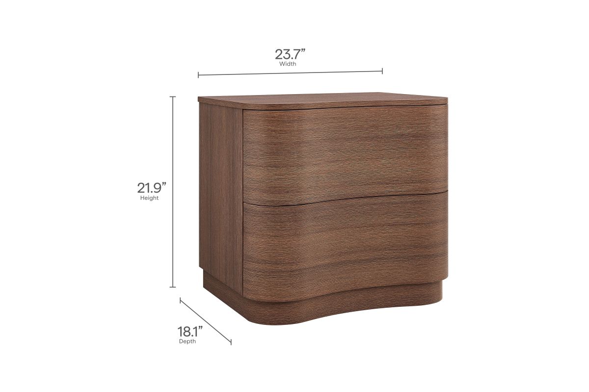 Sculptural lines and compact storage make the Mirae 2-Drawer Nightstand a modern essential for the bedroom or living space. Designed with a clean silhouette and softly curved drawer fronts, this bedside table adds a touch of dimension to any setting. Smooth wood grain laminate highlights the flowing form of this versatile nightstand, while two spacious deep drawers provide storage for books, accessories, or nighttime essentials. Whether styled next to a bed, sofa, or used as a side table, this versatile nightstand with storage blends functional design with artistic appeal. Assembly required.