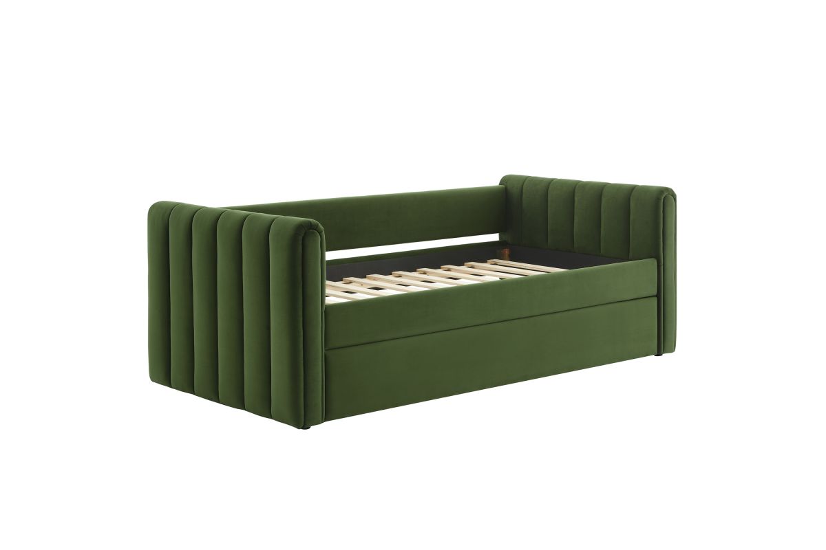 The Veyla Twin Daybed blends sleek form and plush texture with a streamlined silhouette and channel tufted detailing. Upholstered in soft, stain-resistant performance velvet, this twin size daybed with trundle offers a versatile sleeping solution for guest rooms, kids’ bedrooms, or multifunctional living areas. The fully upholstered frame features a low profile, gently padded sides, and tailored vertical channel tufting for a chic look. A hidden pull-out trundle on casters tucks beneath the main bed, creating a seamless twin-over-twin bed layout ideal for overnight guests or everyday lounging. Veyla’s built-in wood slat support system ensures lasting durability without the need for a box spring. Mattress not included. Assembly required. Weight Capacity: 300 lbs.