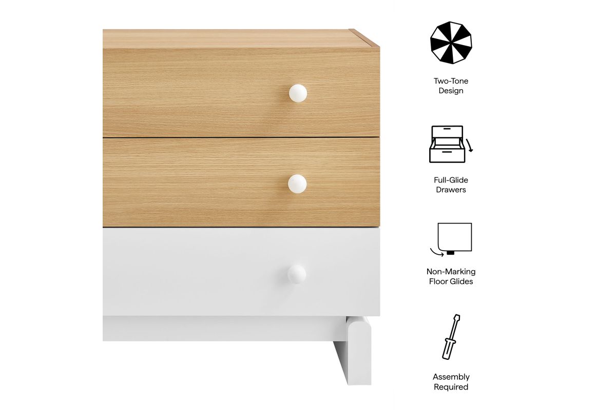 Bring a lighthearted yet modern touch to any room with the Nolia 3-Drawer Dresser, a playful storage piece that doubles as a tall nightstand. Designed with a two-tone color block style, this compact dresser features a wood grain laminate top, contrasting drawer panels, and curved block legs for an elevated look. The three spacious drawers on this large nightstand offer practical storage for clothing, accessories, or bedside essentials, all adorned with rounded knob handles for a fresh, simple finish. Whether placed in a bedroom, hallway, or home office, the Nolia storage dresser brings function and charm to small-space living. Non-marking floor glides included. Assembly required.