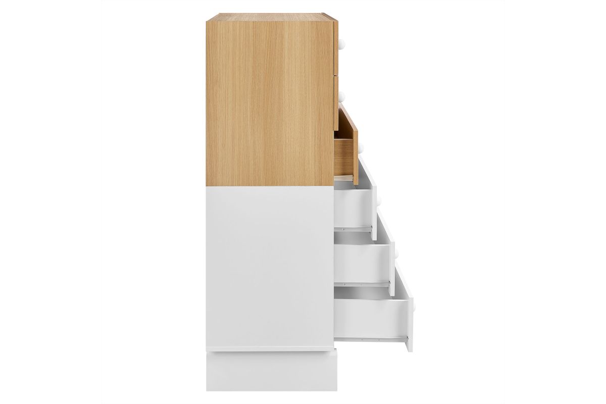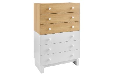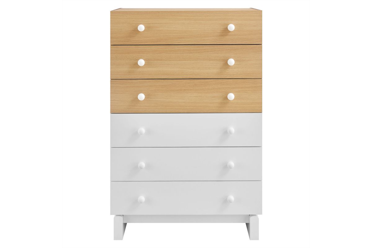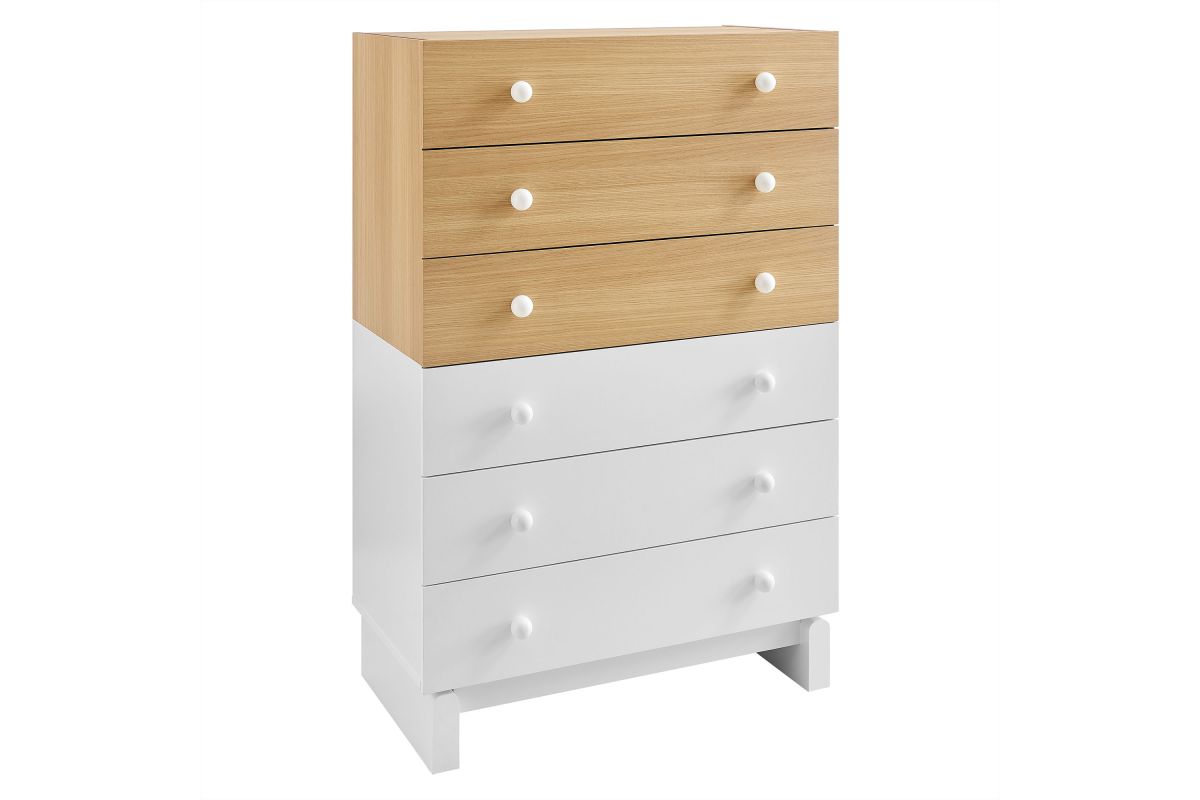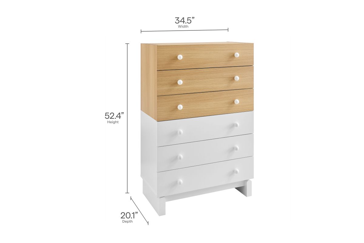 Add a playful pop to your bedroom with the Nolia 6-Drawer Dresser Chest, a tall vertical dresser with mid-century inspiration and everyday function. Designed with a two-tone color block style, this chest of drawers features a wood grain laminate top, contrasting drawers, and a raised base with curved block-style legs. Six spacious drawers with round knob handles offer generous storage for clothes, linens, or bedroom accessories. Ideal for small spaces, apartments, or modern bedrooms, Nolia brings a light, elevated look to any setting. Assembly required.