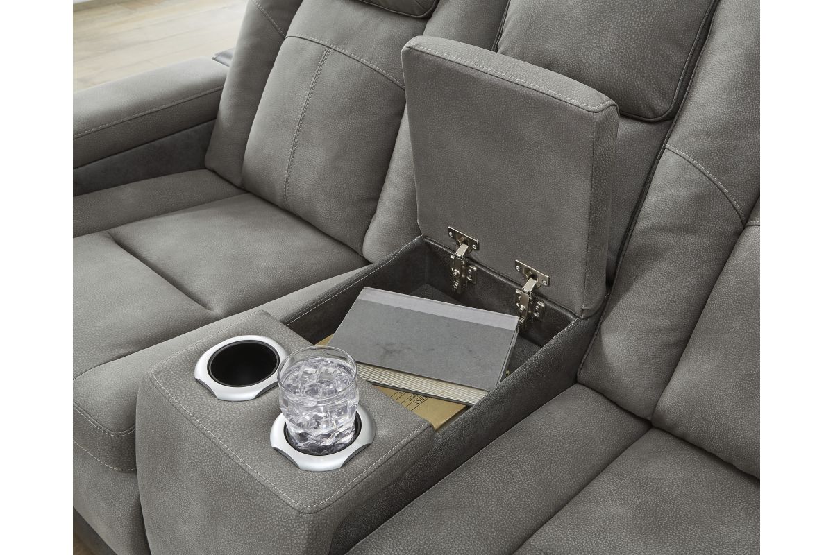 This sleek, ultra-modern power reclining loveseat with console has it all. With designer style and head-to-toe comfort, it has the upscale look of leather at a scaled-down faux leather price. Its gray two-tone upholstery is more durable and water-repellent than regular leather, an added bonus for families. Features including wireless and USB charging, an adjustable headrest and an extended ottoman make this the next generation of power recliners.