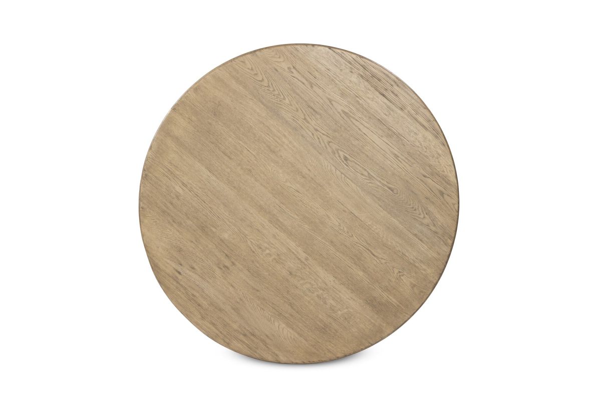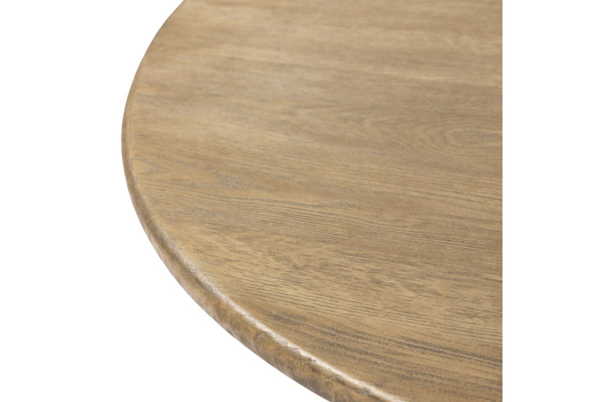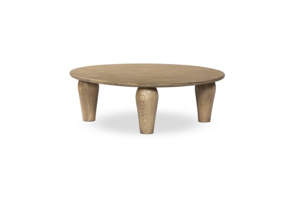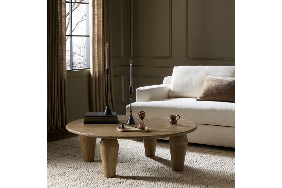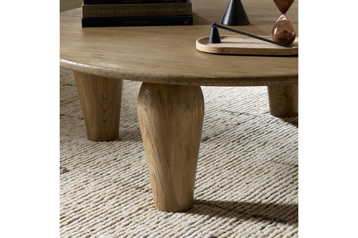 Play up proportions. Large, shapely legs support a rounded tabletop of worn oak, for a global, organic look and handcrafted feel.