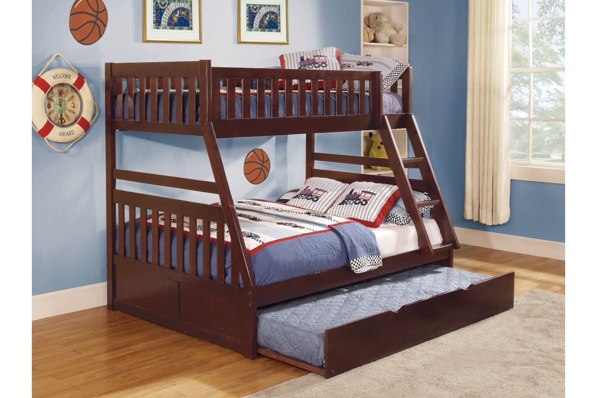 Maximizing sleep space is achieved with the stylish Rowe Collection. This transitional twin over full bunk bed with pull-out trundle provides extra room for sleepovers, all in a rich dark cherry finish that complements any classic bedroom décor.
