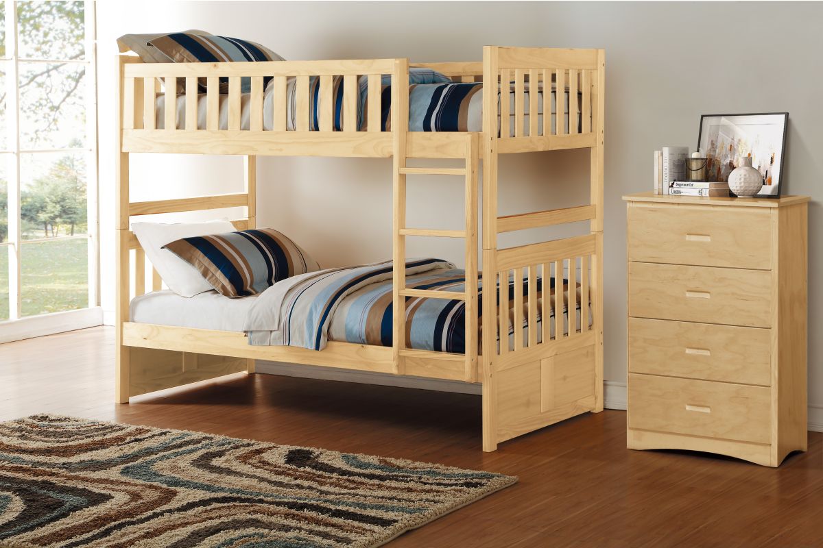 Maximizing sleep space is achieved with the stylish Bartly Collection. This transitional twin over twin bunk bed with matching storage chest is featured in a natural pine finish, making it an ideal choice for a youth bedroom that blends function with timeless design.