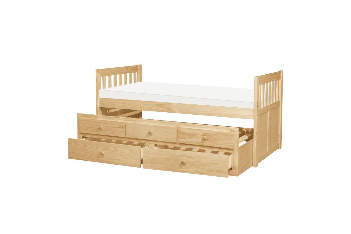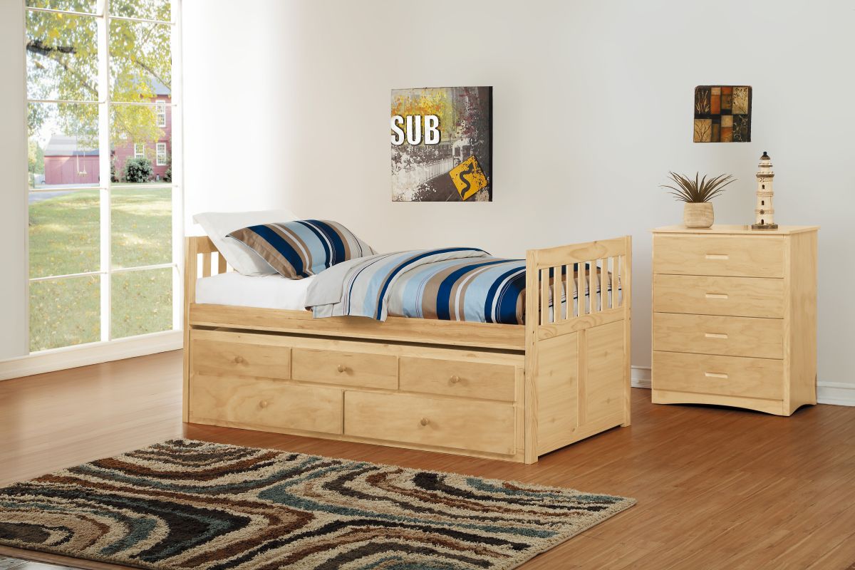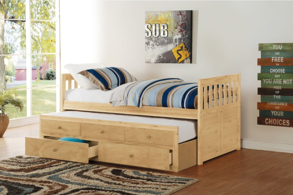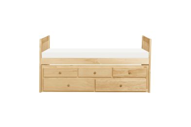 Maximizing sleep space is achieved with the stylish Bartly Collection. This transitional twin over twin captain bed features a twin trundle and two built-in storage drawers, paired with a matching storage chest in a rich natural pine finish for added organization and style.