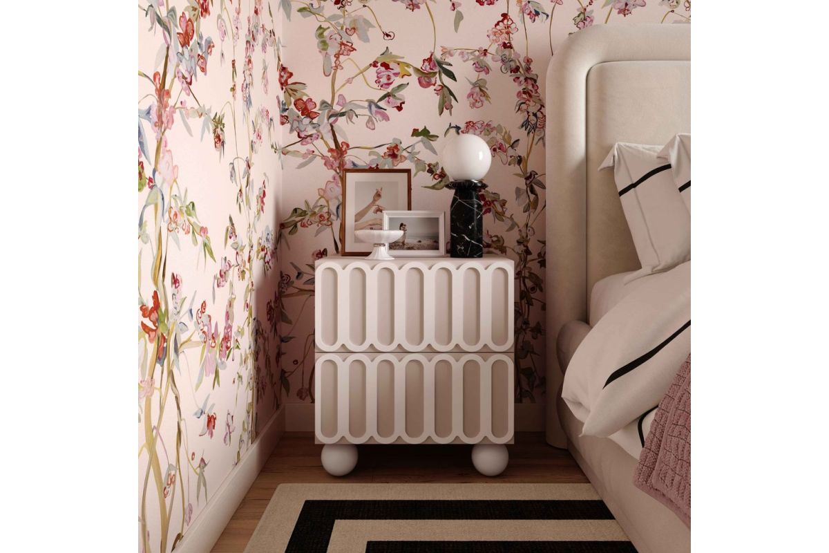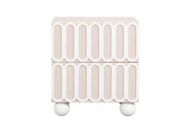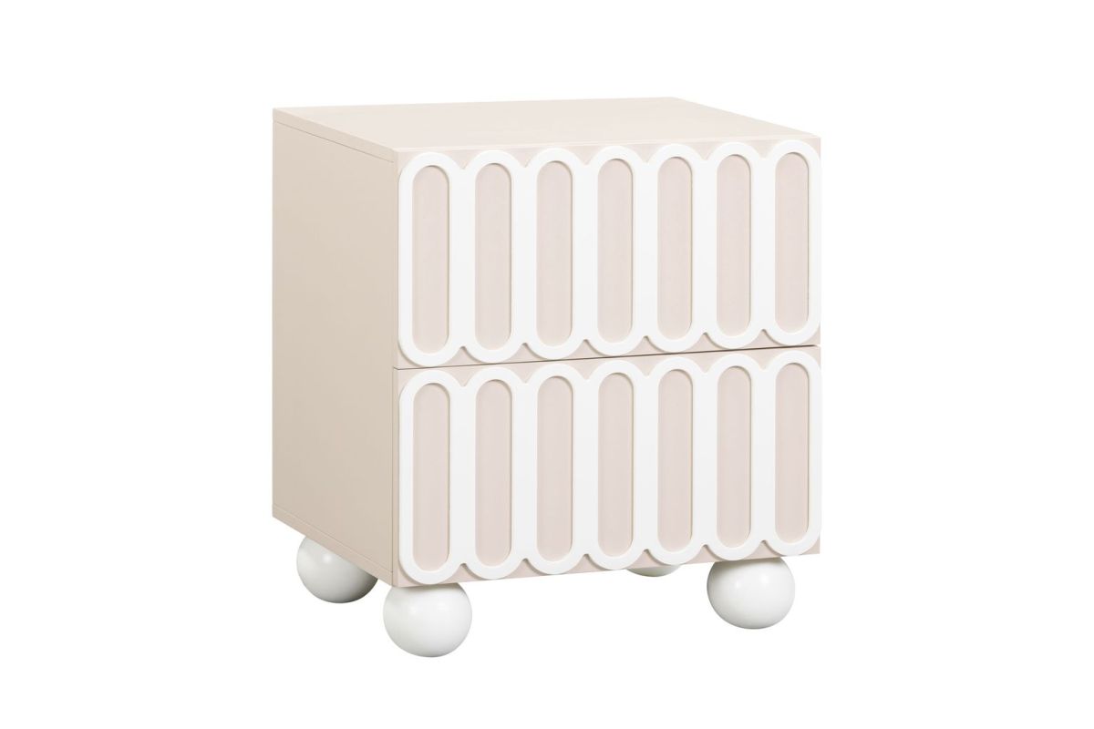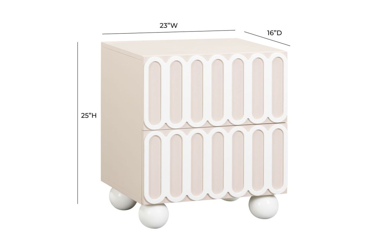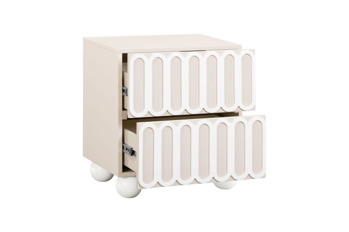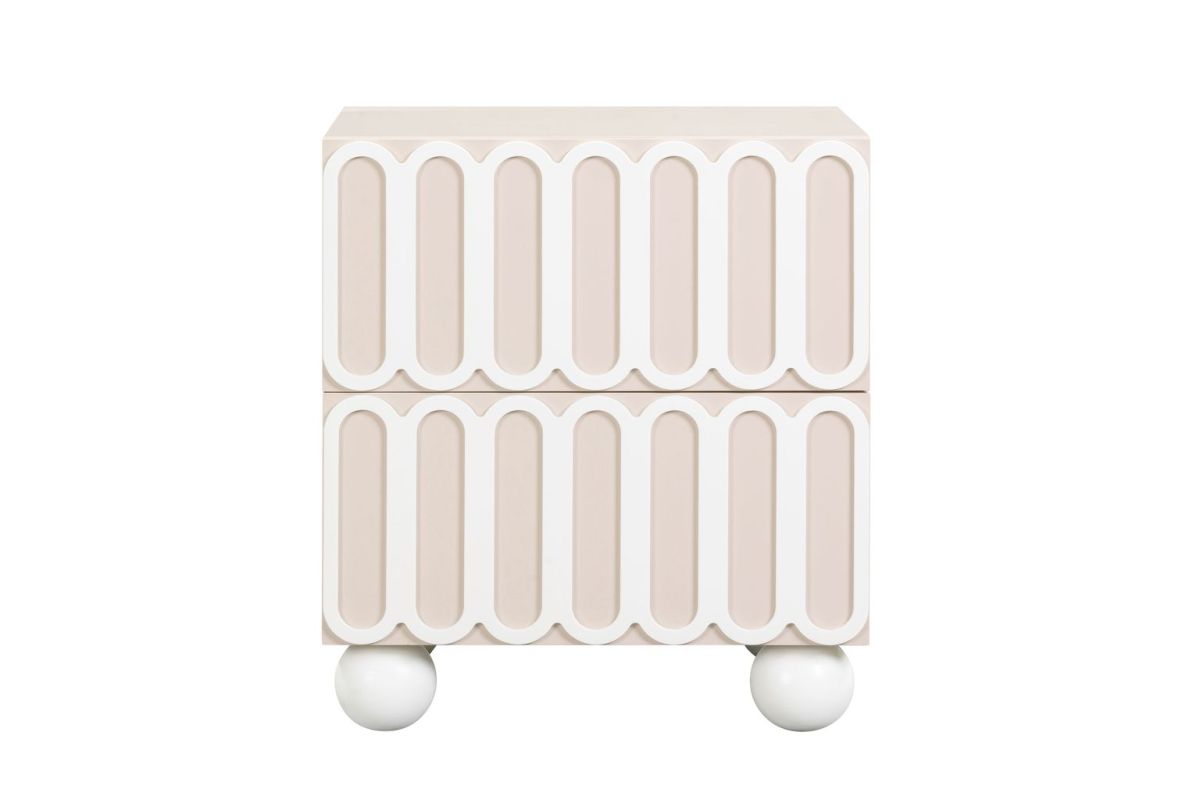 Say goodbye to a boring bedtime routine with the Tori Motif Nightstand, available in dreamy mauve and sophisticated taupe, each featuring a statement-making facade that truly pops. Its solid wood, spherical legs infuse a sculptural Hollywood buzz, while the medium sheen on the surfaces delivers just the right amount of drama without fussy maintenance. Plus, the nightstand's drawers glide smoothly on soft-close rails, ensuring you keep the morning peace, not waking your partner as you start your day.