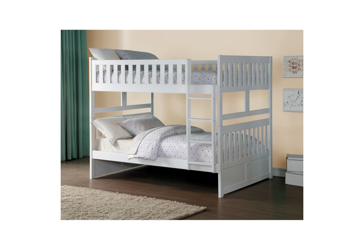 Maximizing sleep space is achieved with the stylish Galen Collection. This transitional full over full bunk bed with matching storage chest is finished in white, combining durability, style, and storage for the perfect youth bedroom solution.