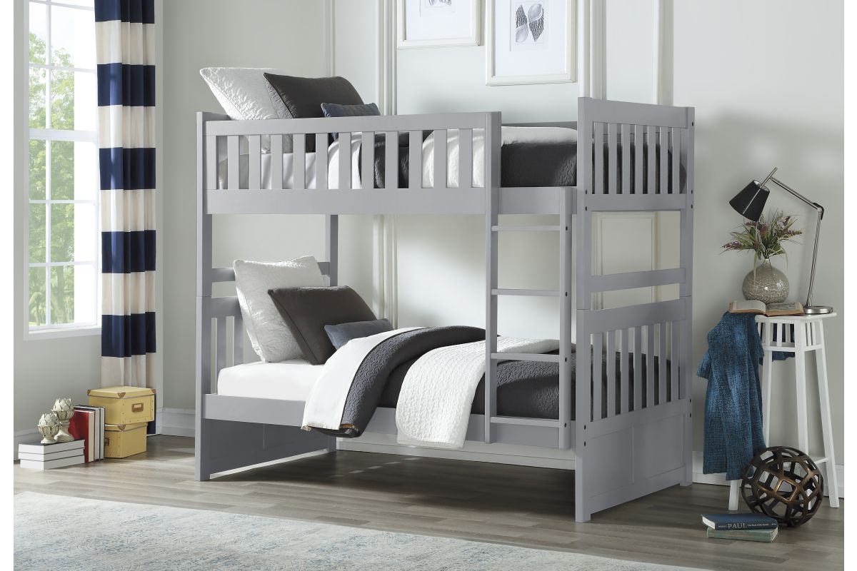 Maximizing sleep space is achieved with the stylish Orion Collection. This transitional twin over twin bunkbed is featured in a gray finish making it an appropriate choice for a number of youth bedroom settings.