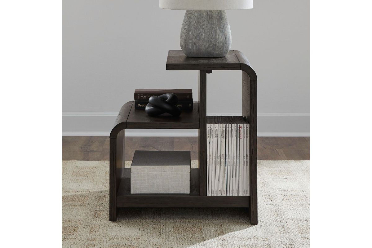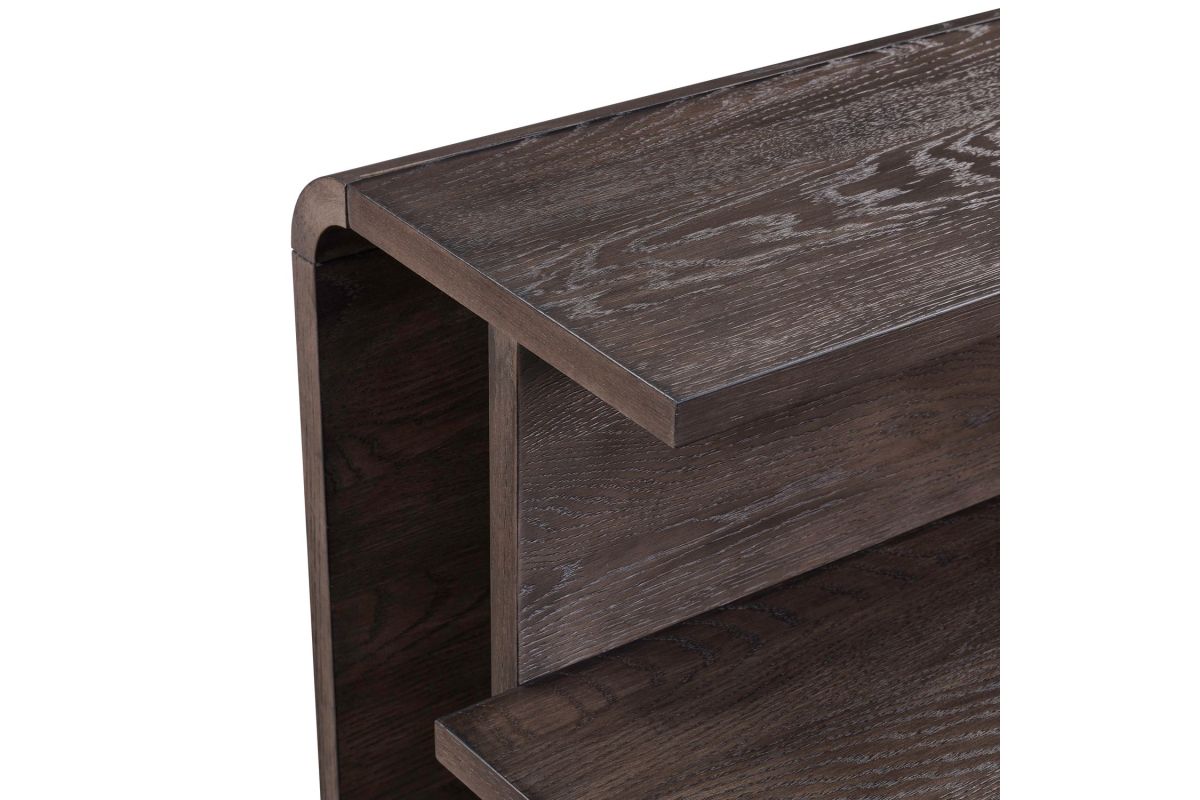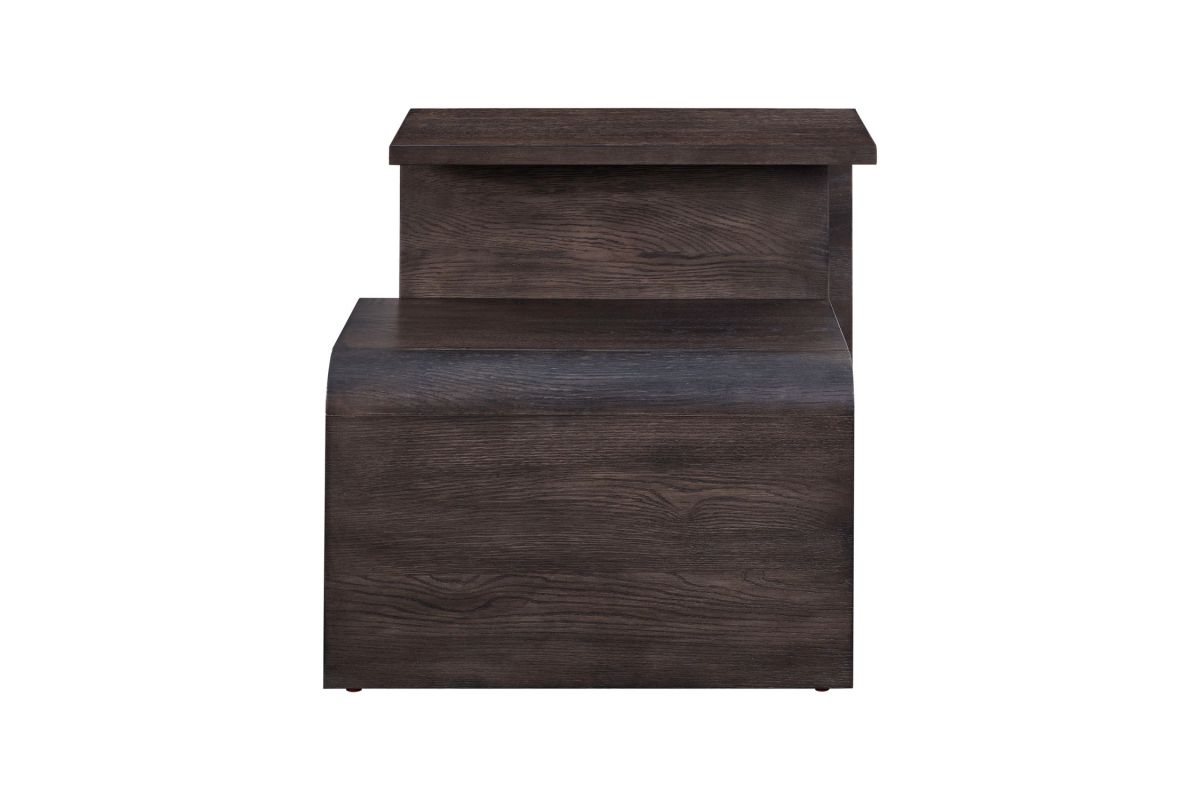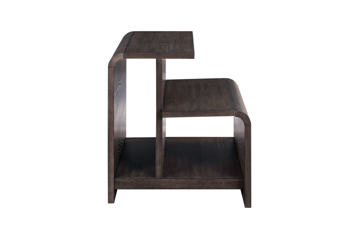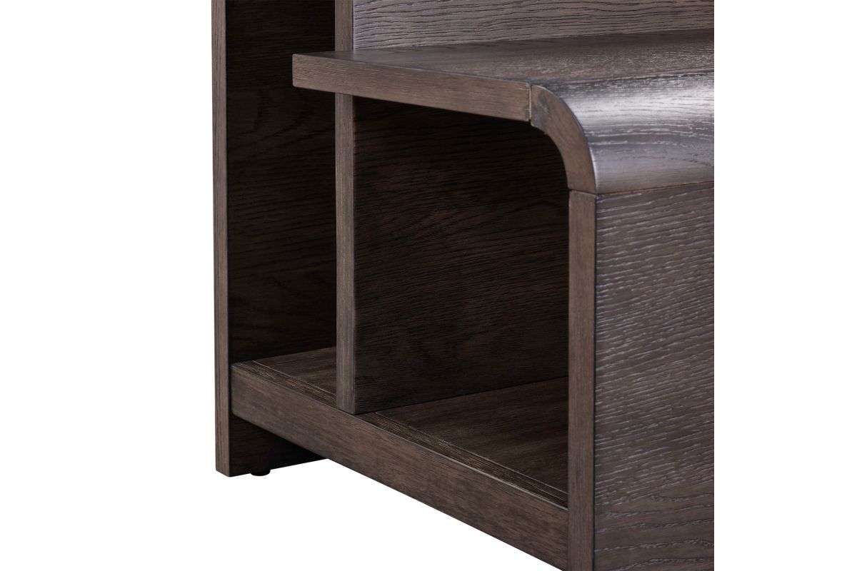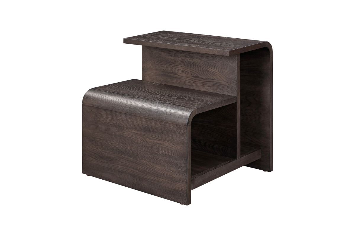 The Perspectives end table is where form meets function with effortless elegance. Meticulously crafted using Rubberwood solids and Split Heart White Oak veneers, this table features an Espresso finish. With soft shaping and a rounded waterfall edge, this table exudes understated elegance, making it a perfect addition to any room. the end table features a layered top, adding visual interest while providing practical functionality. Whether showcasing your favorite decor pieces or serving as a convenient surface for your essentials, its versatile design enhances the aesthetic appeal of your space. Beneath the top lies an open bottom shelf, thoughtfully divided by a center divider into two storage cubbies. This arrangement offers ample space to neatly stow away books, magazines, or other items, keeping your living area organized and clutter-free. With its timeless design and thoughtful features, the Perspectives end table combines style and utility to complement your home decor while providing the functionality you need for everyday living.