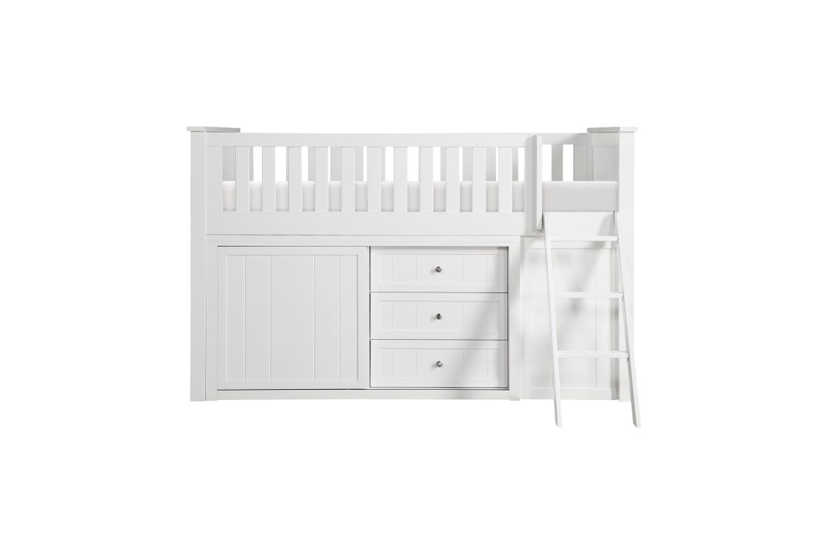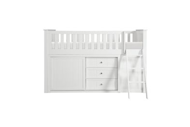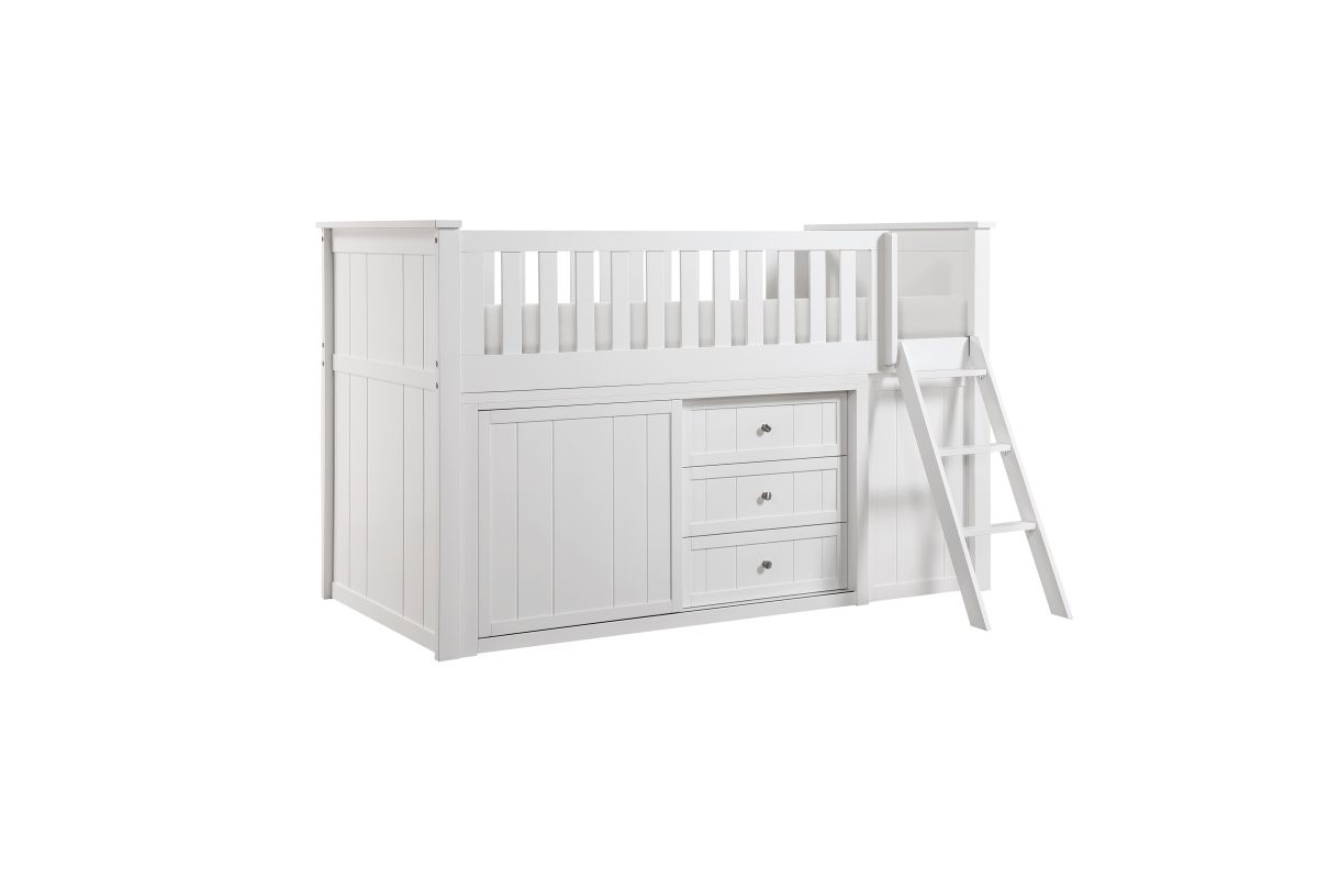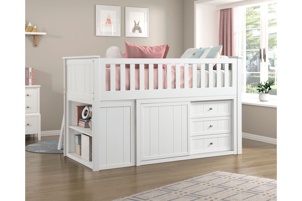 Maximizing sleep space is achieved with the stylish Galen Collection. This transitional twin low-loft bunkbed is featured in a white finish making it an appropriate choice for a number of youth bedroom settings. An angled ladder provides easy access to the loft platform. Providing below-the-bed storage are two dressers and bookcase, each specifically designed to fit within the parameters of the available lower space with the dressers providing shelf and drawer storage and the bookcase allowing for open display of your child's favorite books and collectables.