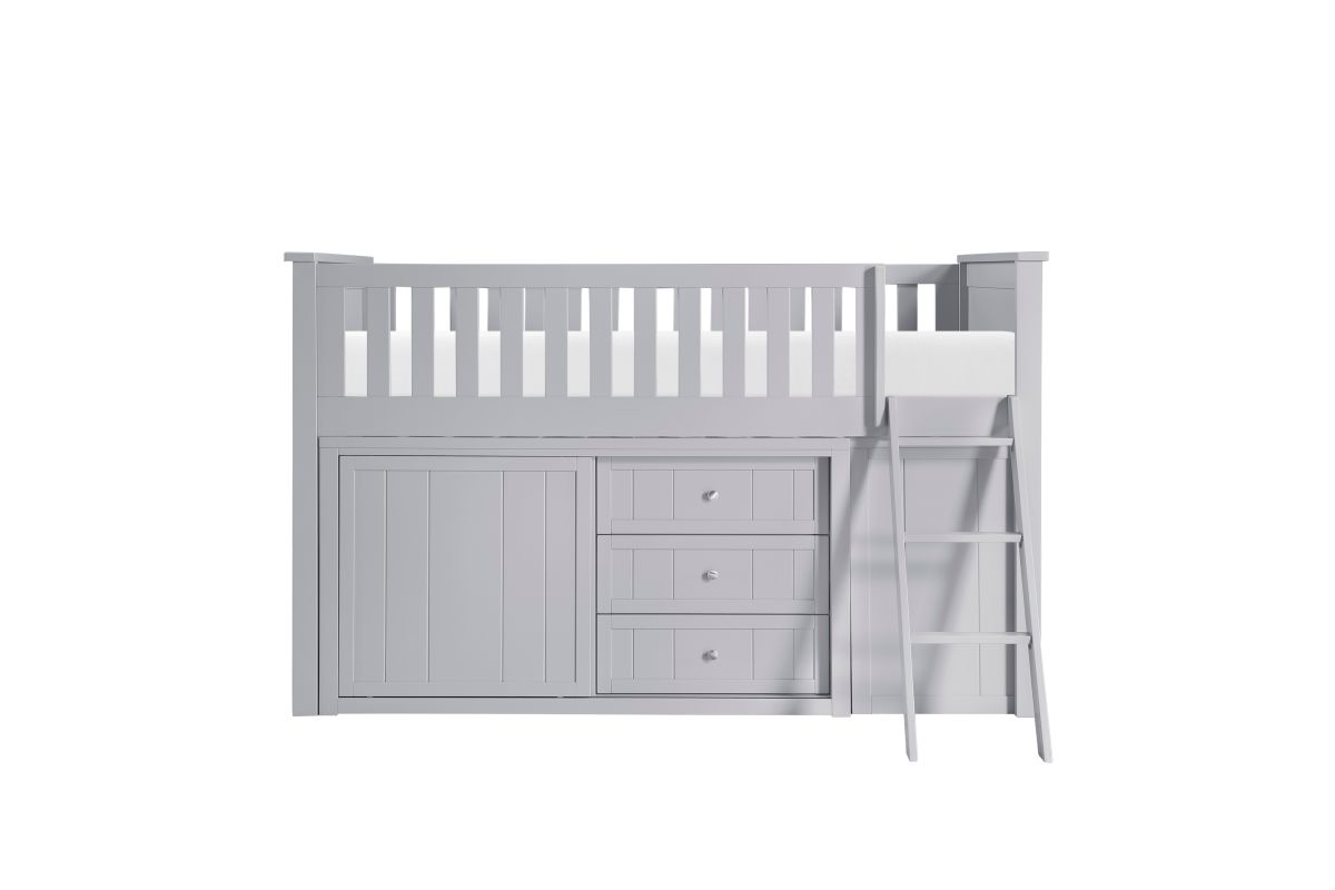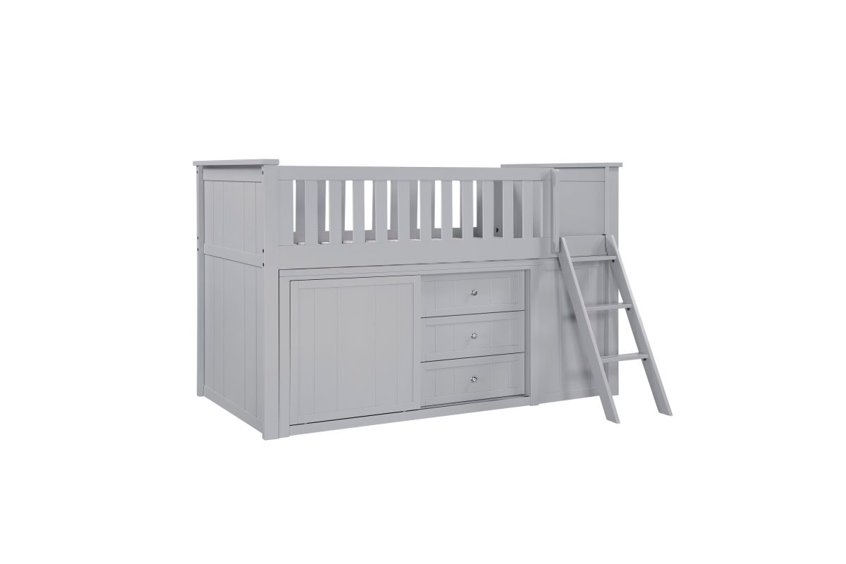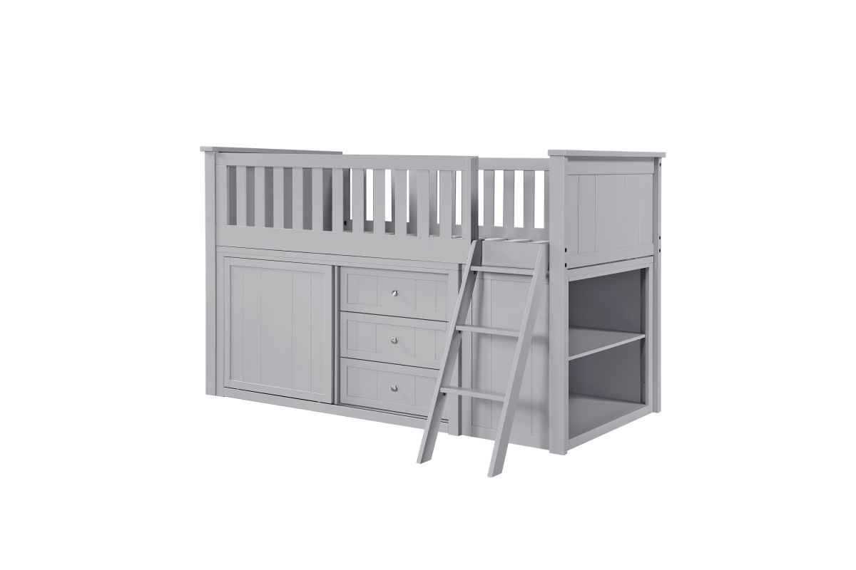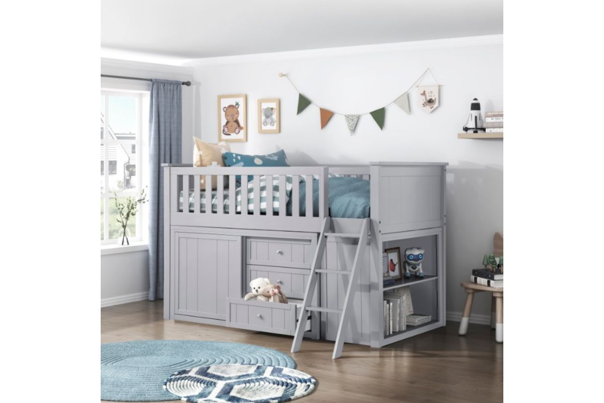 Maximizing sleep space is achieved with the stylish Orion Collection. This transitional twin low-loft bunkbed is featured in a gray finish making it an appropriate choice for a number of youth bedroom settings. An angled ladder provides easy access to the loft platform. Providing below-the-bed storage are two dressers and bookcase, each specifically designed to fit within the parameters of the available lower space with the dressers providing shelf and drawer storage and the bookcase allowing for open display of your child's favorite books and collectables.