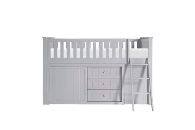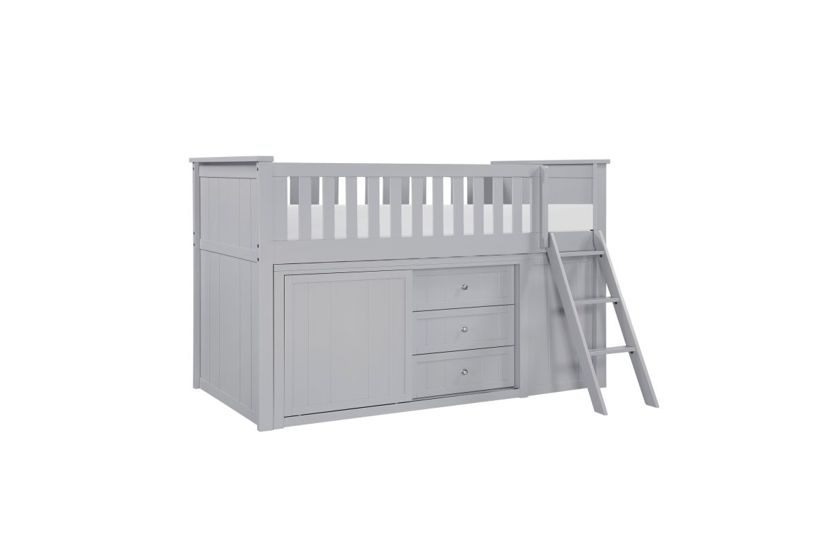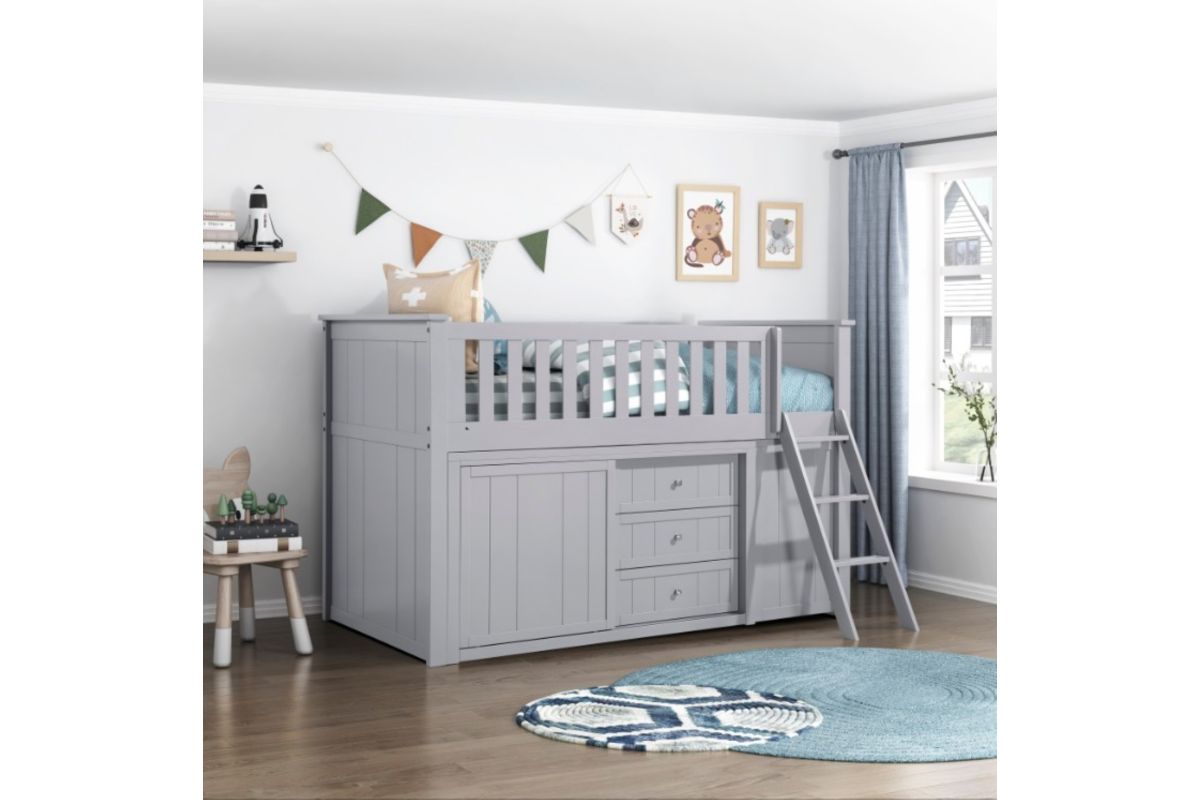 Maximizing sleep space is achieved with the Orion Collection. This gray low loft bunk includes a matching bookcase and dresser for streamlined organization in smaller bedrooms.