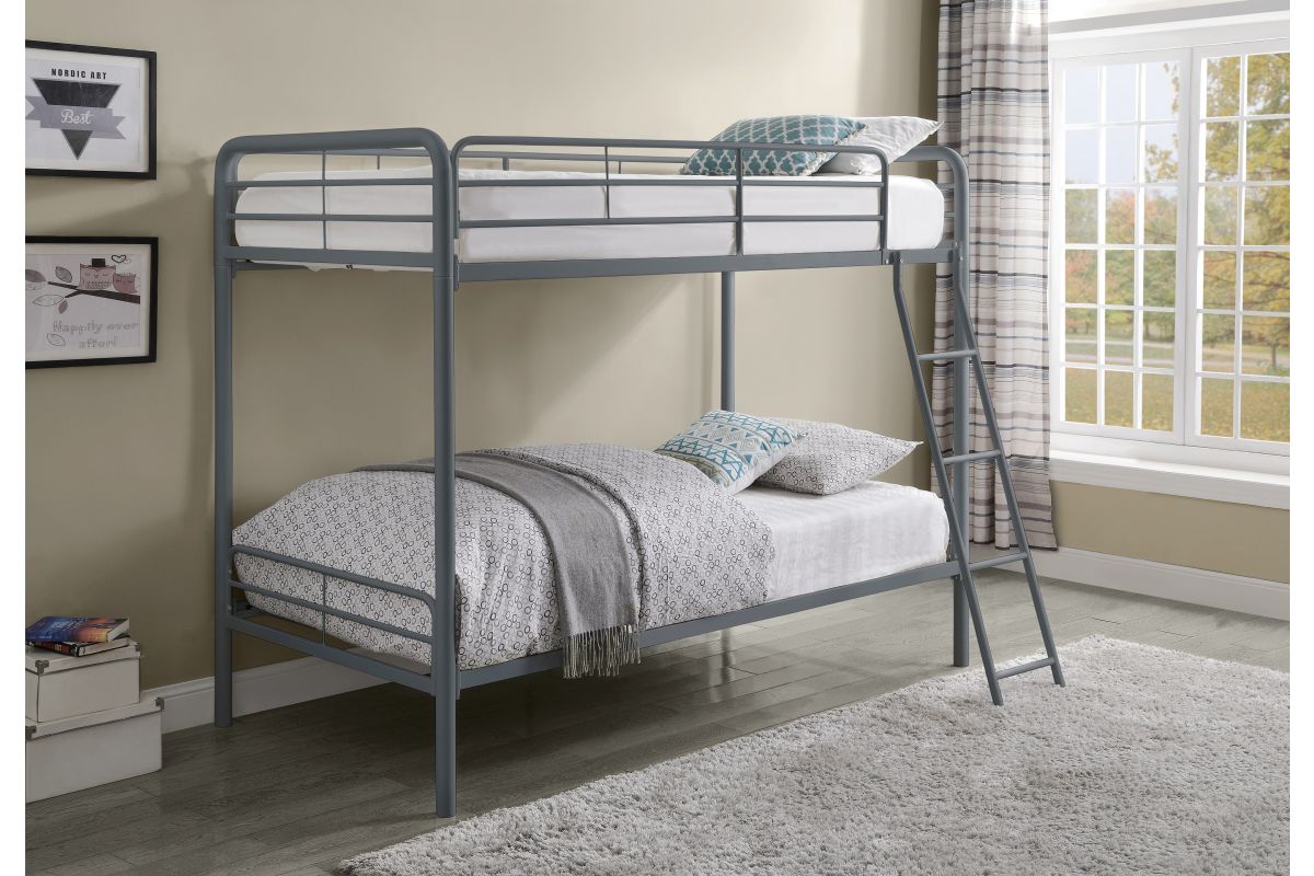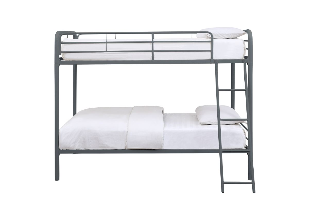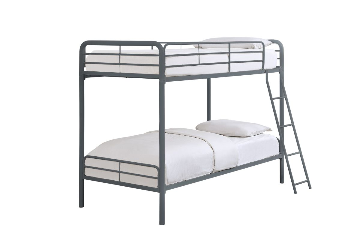 Maximizing sleep space is achieved with this sturdy metal bunk bed. Designed in a sleek, modern style, this twin over twin configuration features a durable steel frame with a built-in ladder and safety rails for added security. The slat foundation eliminates the need for a box spring, creating a streamlined and practical choice for shared or guest bedrooms. Available in gray or white finishes to complement any décor.