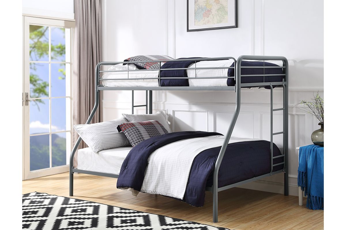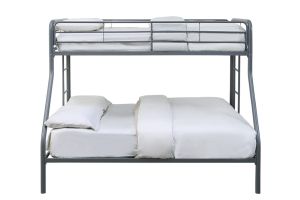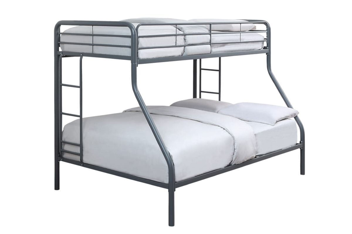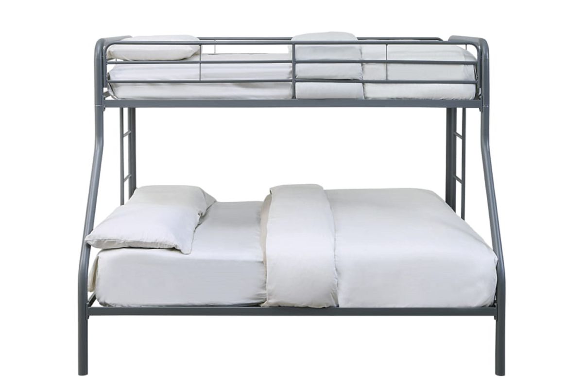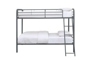 Maximizing sleep space is achieved with this functional and stylish metal bunk bed. Featuring a durable steel frame with a twin top bunk and full-size lower bunk, this design offers flexible sleeping arrangements ideal for siblings or guests. The sturdy slat support removes the need for a box spring, while the built-in ladder and guardrails ensure safety and stability. Available in your choice of gray or white finish for a clean, contemporary look.