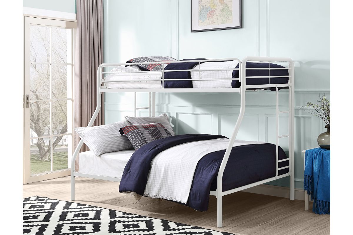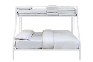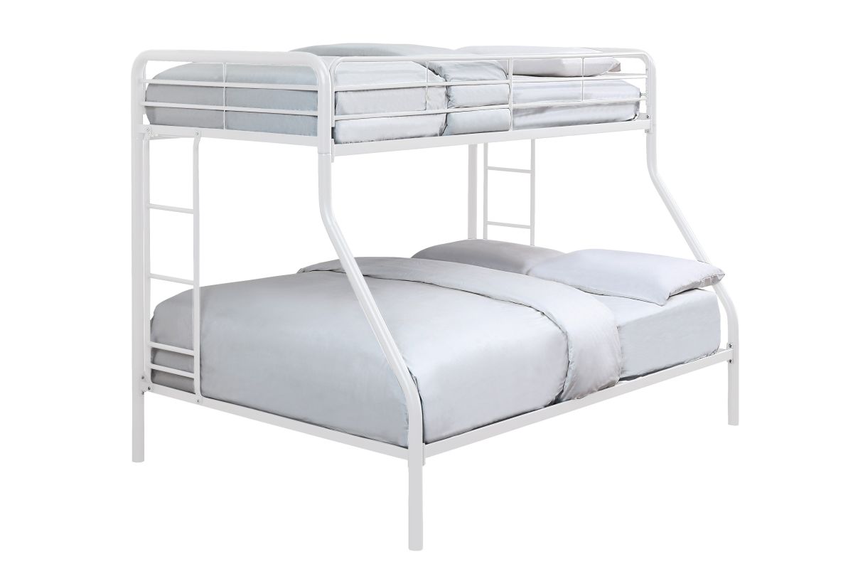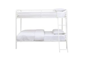 Maximizing sleep space is achieved with this functional and stylish metal bunk bed. Featuring a durable steel frame with a twin top bunk and full-size lower bunk, this design offers flexible sleeping arrangements ideal for siblings or guests. The sturdy slat support removes the need for a box spring, while the built-in ladder and guardrails ensure safety and stability. Available in your choice of gray or white finish for a clean, contemporary look.