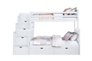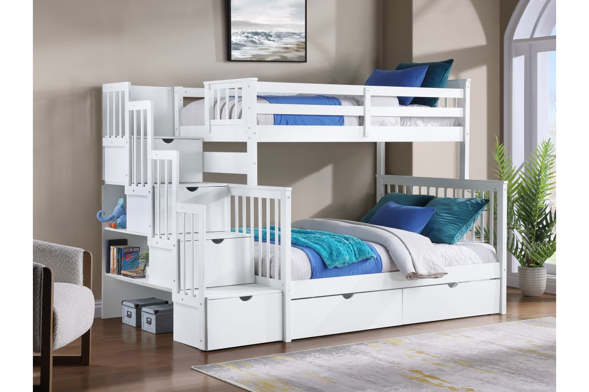 Create a fun and functional bedroom space for your kids with the Ludville Twin-Over-Full Bunk Bed. Designed for versatility and storage, this charming piece features a reversible stairway with built-in compartments, perfect for keeping toys, books, or bedding organized. Crafted from solid pine wood with a durable wire-brush veneer finish, its clean, straight-line design complements a variety of room styles. The twin-over-full configuration provides ample sleeping space, while the sturdy staircase ensures safe access to the top bunk. Under-bed storage boxes offer additional room for essentials, making it an ideal choice for shared bedrooms or sleepovers. Available in Black, White, and Brownish Grey finishes, this bunk bed is equipped with a slat kit for both beds, eliminating the need for a box spring.