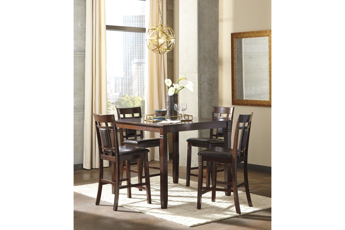 Set the scene for cool, comfortable and ultra-contemporary style with this counter table set. Counter-height design makes eating in feel more like dining out at a trendy pub. Richly upholstered in a practical faux leather with welcome back supports, the four bar stools are sure to satisfy.