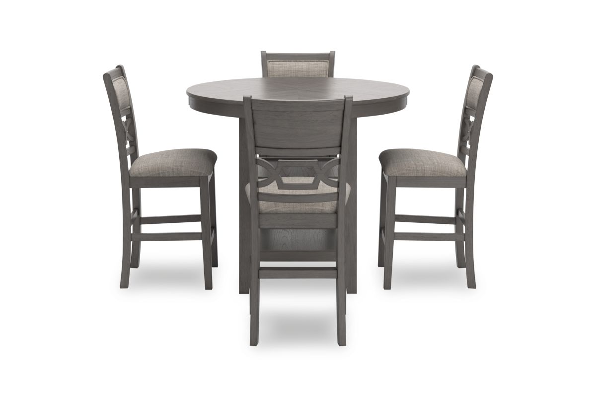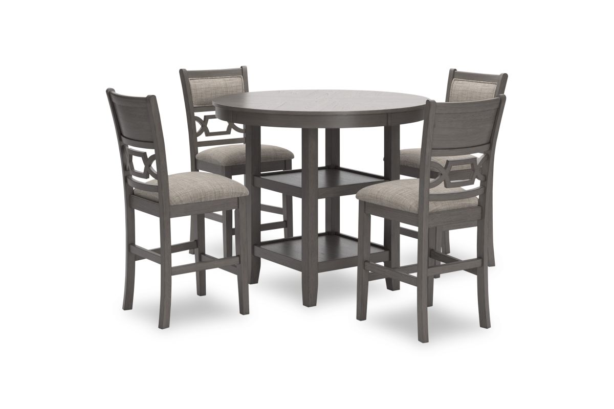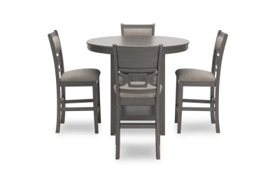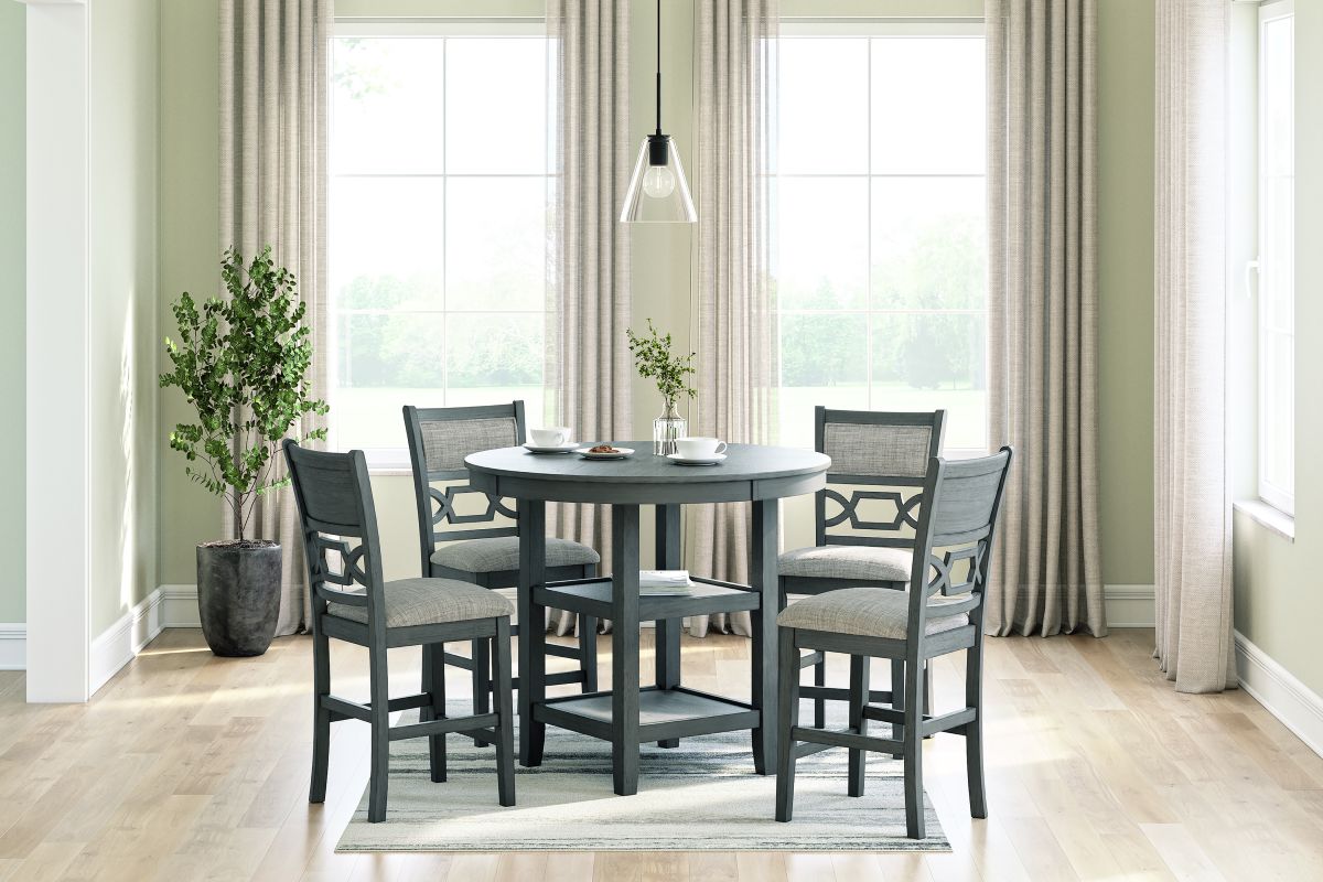 Can’t decide between classic and contemporary? Embrace the beauty of transitional style with this casually sophisticated counter height dining table and bar stools. A clean-lined profile and modern light gray finish merge with textured upholstery to create a timeless yet on-trend look when guests gather. Discreetly placed shelves simply make great storage sense.