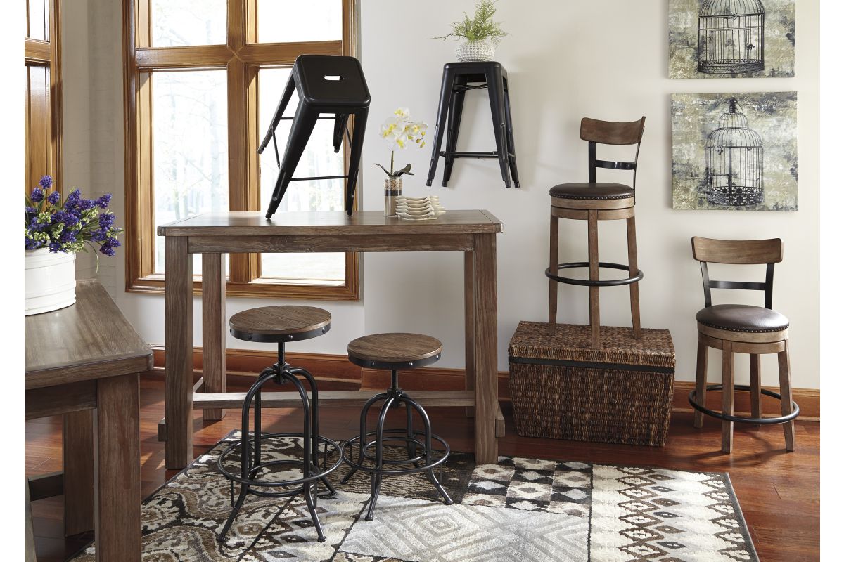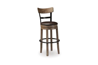 This pub height bar stool serves a sense of refinement without all the formality. A 360-degree spin element keeps you in the flow of conversation, while faux leather upholstered seating incorporates comfort and easy cleanup. The frame’s signature finish with a wire-brushed effect and gray undertones exudes an easy, relaxed sensibility.