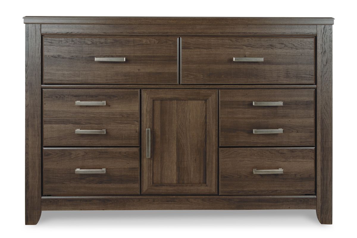 Get the look of posh barn wood without setting foot in a salvage yard. Replicated rough-sawn oak of this dresser has a vintage finish that is reminiscent of a timeworn family heirloom. Warm, rustic and naturally beautiful, it's just got that ageless appeal. Sleek, mod pulls in a pewter tone are a snappy finishing touch.