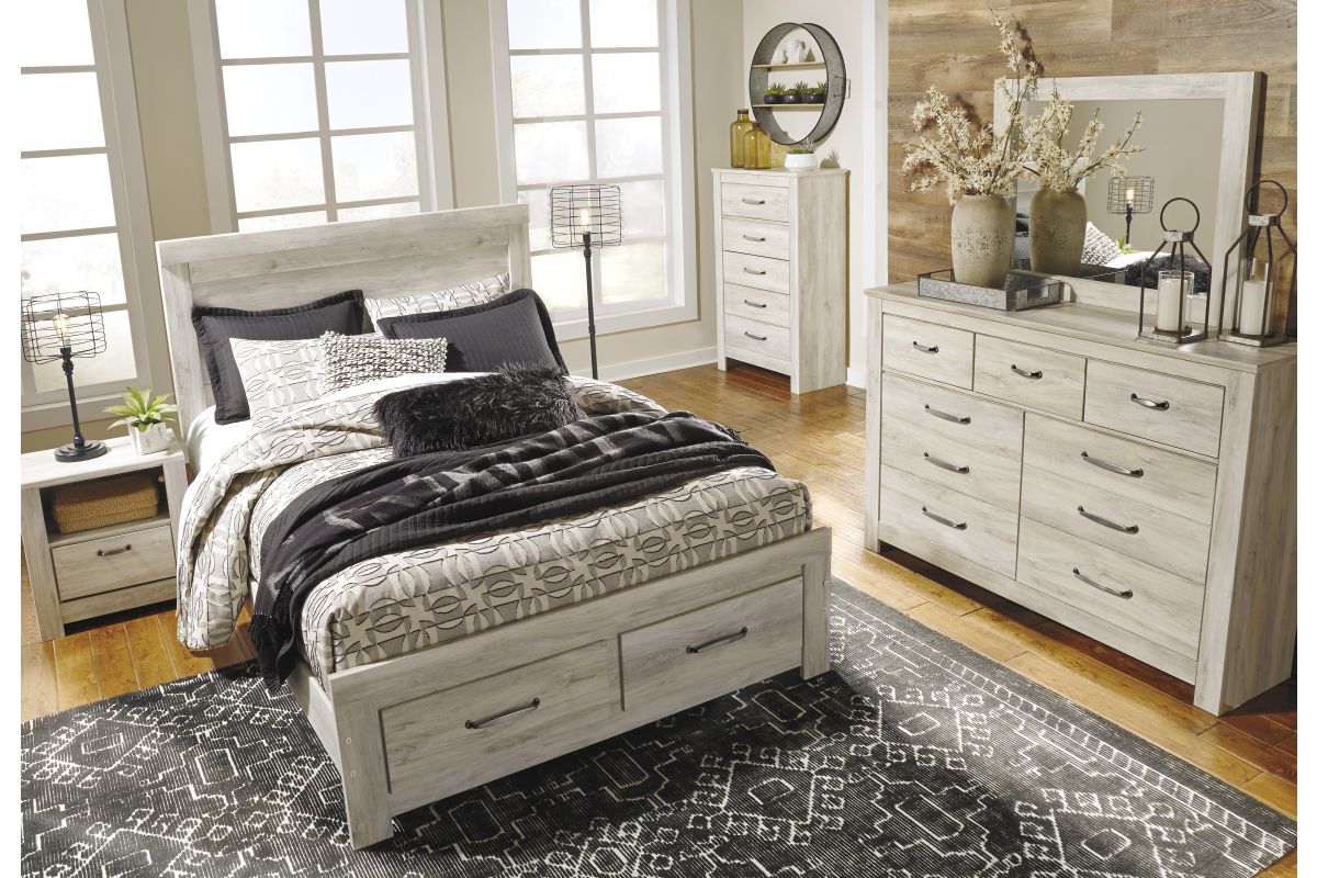The Bellaby Bedroom Collection by Ashley Furniture offers a relaxed yet refined take on modern farmhouse style. Finished in a soft “wispy white” whitewash over a replicated oak grain, the collection captures the warmth and texture of natural wood while keeping a bright, airy look that fits both rustic and contemporary interiors. Clean lines and subtle detailing give it a versatile charm, while brushed nickel hardware with black edging adds a touch of modern contrast.